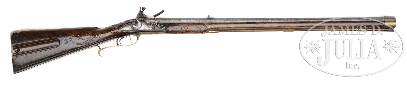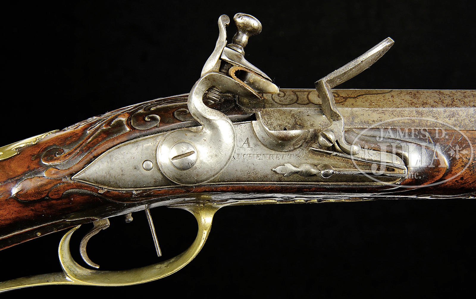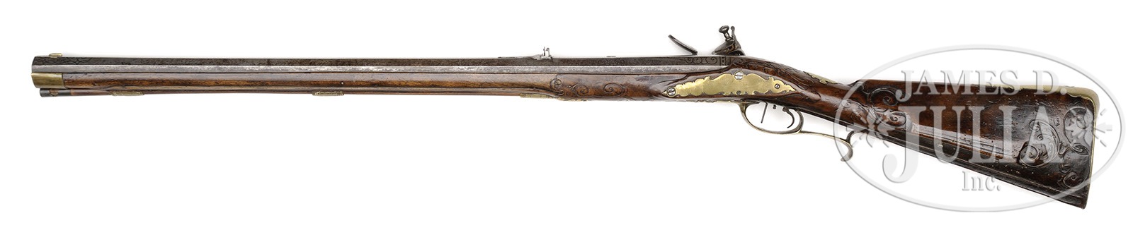 GERMAN JAEGER RIFLE BY THE RENOWNED JOHANN ANDREAS KUCHENREUTER REGENSBURG, CIRCA 1750.SN NSN. Plain lock signed in full “IA Kuchenreuter”. Octagonal bbl elaborately inlaid in silver with maker’s name in full and address gilded copper seal. Silver scrolls at breech and elaborate at muzzle. Bbl heavily rifled. Plain brass mounts. Walnut full stock carved with scrolls on cheekpiece, butt, breech, and forend. A presentable example of a working Jaeger rifle by this most famous of all 18th century German gun makers. PROVENANCE: Collection of Dr. Douglas Sirkin. CONDITION: Lock is smooth gray metal. Bbl is smooth mottled gray and brown. Inlay is darkened but all present and crisp. Brass mounts are cleaned. Stock slightly worn but not damaged. Some worm present in cheekpiece area. 4-49952 (4,000-6,000) – Lot 2475