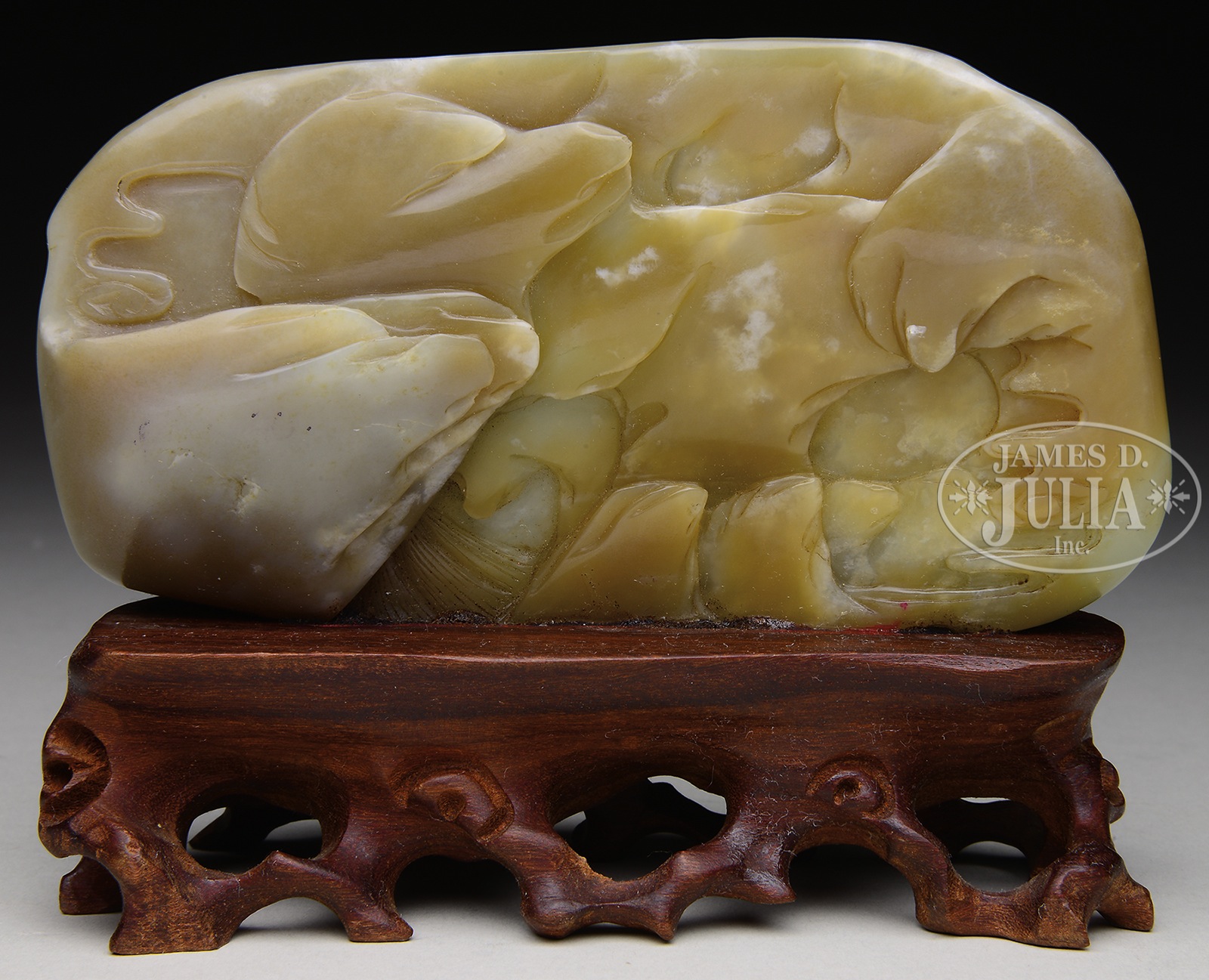 CARVED JADE MOUNTAIN.China. The jade mountain carved an elder and a boy beneath a tree of riches in the mountains, all on top of a carved wooden stand. SIZE: 5″ l x 2-3/4″ h CONDITION: Good. 7-75447 (400-600) – Lot 2475