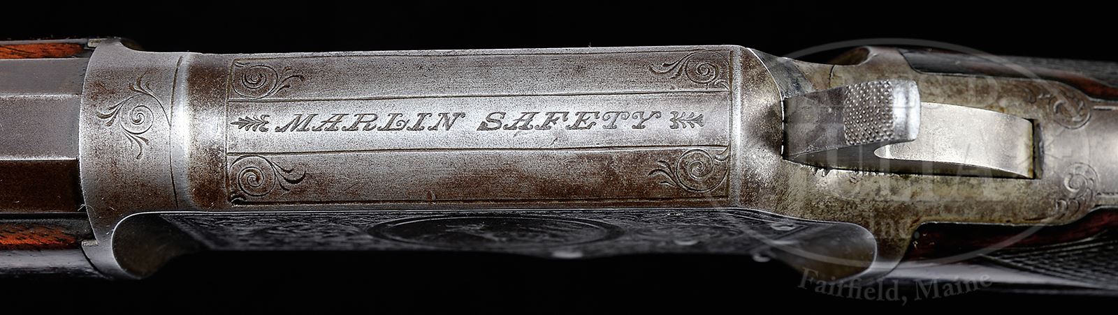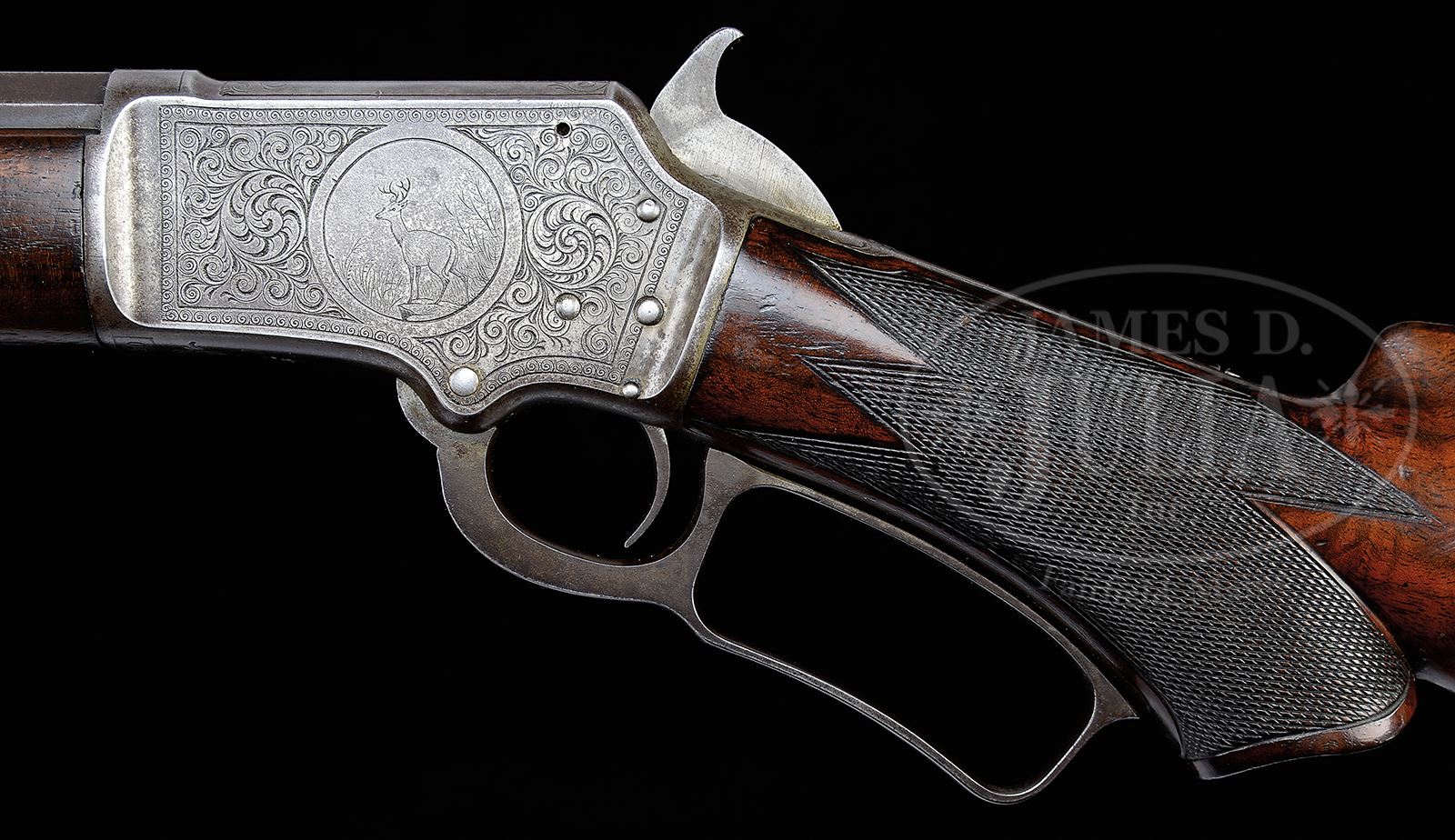 VERY RARE DELUXE ENGRAVED MARLIN 1ST MODEL 1891 LEVER ACTION RIFLE.SN 58520. Cal. 22. Fine deluxe ’91 rifle with 24” oct bbl, 2/3rds magazine and orig fixed sights. Mounted with very highly figured, center crotch American walnut, B-style checkered with crescent buttplate. Buttstock & buttplate are matching numbered to this rifle. Receiver is engraved by Conrad Ulrich in #3 style which consists of the rnd vignette of a standing whitetail buck on the left side surrounded by foliate arabesque patterns with latch-hook borders. Right side has full coverage foliate arabesque patterns with matching borders. Bolt is a more recent replacement, engraved by another hand. Few of these early loading gate small bore Marlins survive today in any condition. Deluxe examples are rare and engraved specimens extremely rare. Accompanied by a Cody Firearms Museum letter which identifies this rifle in Cal. 22 with 24” oct bbl and pistol grip shipped, Nov 25, 1891 CONDITION: Very good to fine. Bbl and magazine tube retain about 80-85% dull blue/brown patina with strong blue in sheltered areas. Forend cap retains about 40% thin blue. Receiver is faded case colors turning grey. Lever, hammer and buttplate are dark patina. Wood is sound with nicks, dings and scratches and light oil staining around the wrist, a little heavier on the forearm, and the checkering shows moderate wear. Mechanics are fine. Strong bright bore, frosty in the grooves. Fewer than 10 engraved Sideloaders are known to exist. 49121-14 JR (8,000-12,000) – Lot 2477 Click here to view provenance