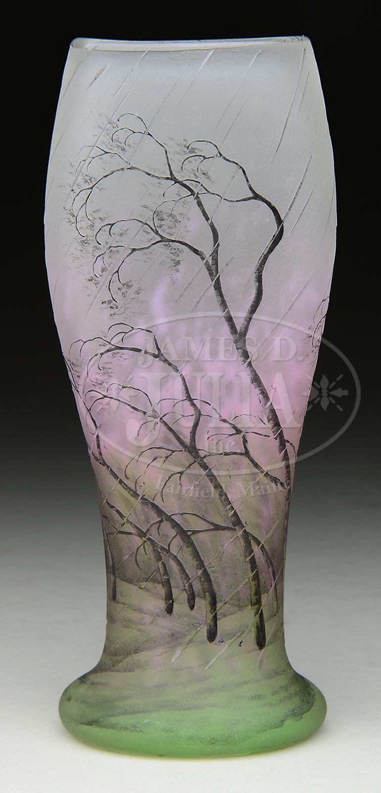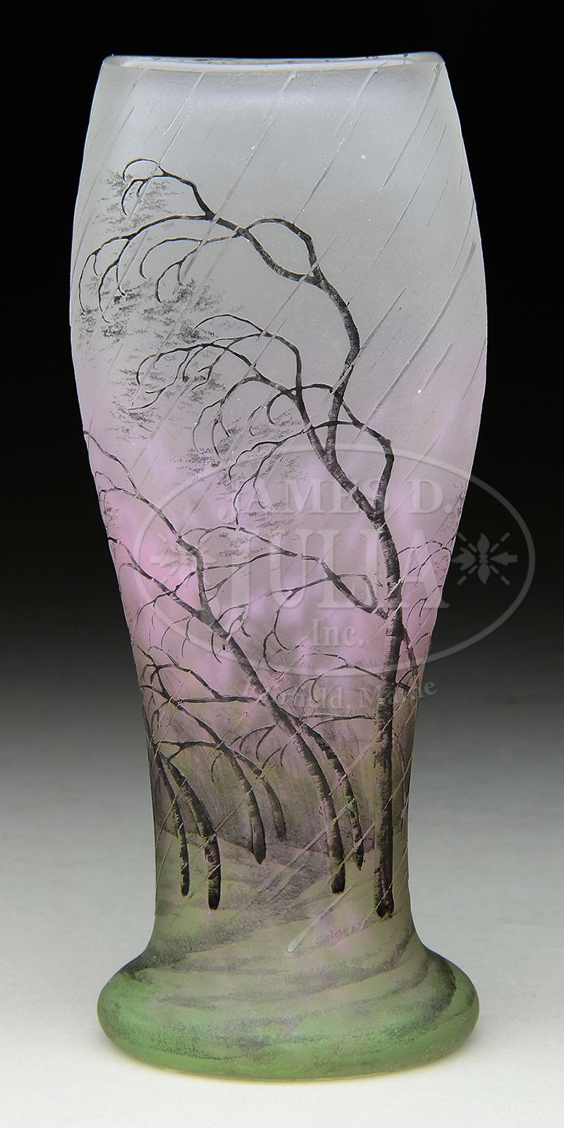 DAUM RAIN SCENE VASE.Daum vase has flattened front and back and is decorated with cameo windswept trees with driven rain. Trees raise from green enameled meadow and trees are enameled in shades of brown with subtle green leaves. All against mottled pink shading to frosted background. Signed on underside in black enamel “Daum Nancy” with cross of Lorraine and artist initial “L”. SIZE: 6″ t. CONDITION: Very good to excellent. 50486-1 (2,500-3,500) – Lot 2477