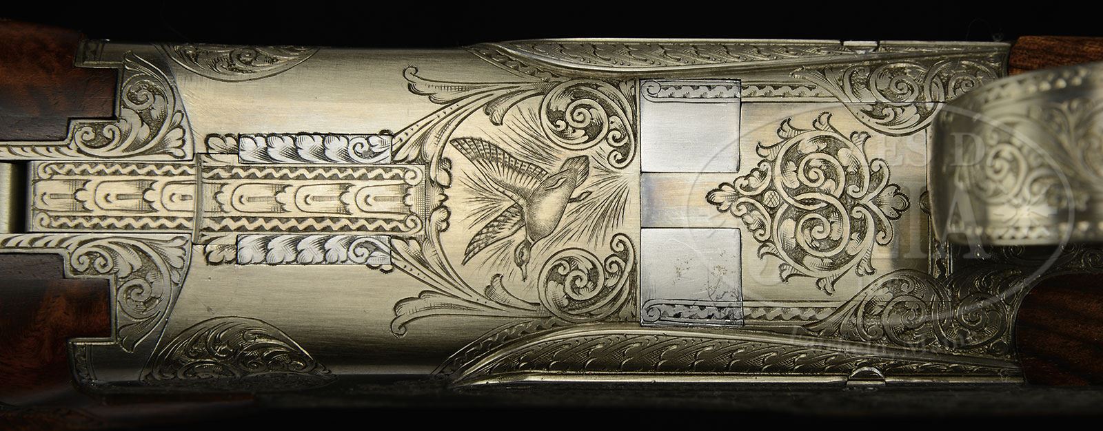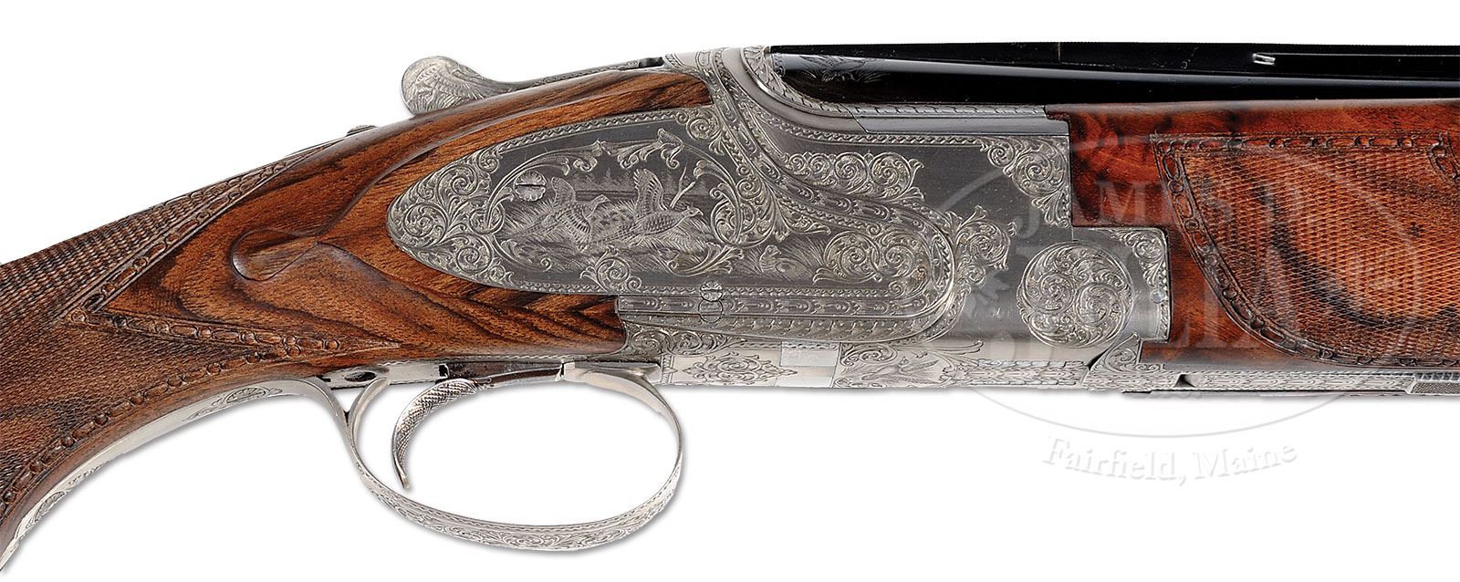 *FABRIQUE NATIONALE CHAMBORD (F1) GRADE – BROWNING PATENT SUPERPOSED WITH SIDEPLATES.SN 7264S2. Cal. 12 ga. 2-3/4″ Chambers. 30″ Bbls choked IMod and Full with Broadway ventilated rib are engraved “Fabrique Nationale Herstal.” on top left of top bbl. This grade with the finest European style engraving FN offered at the time, features a duck taking wing from marsh on each side of rib at breech. Left side of breech area is marked “PROSNA INC. MUNSTER IN”. Coin finished O/U action with single selective trigger is nicely filed typical of high grade guns, and has false sideplates fitted. Action is engraved with 50% coverage well cut shaded scroll outlining vignettes of game birds on lockplates in “Royal” style; a pair of quail flush from greenery on left, and a pair of pheasants fly over meadow on right. A duck taking off from marsh grass is on bottom of action. (see THE BROWNING SUPERPOSED by Ned Schwing p. 401) This fine engraving is by Jaquez Lodewic, whose signature appears at bottom of scene on left lockplate. Nicely streaked European walnut long tang square knob buttstock measures 14-1/4″ over brown Browning trap pad. Sculpted drop points are behind lockplates, and point pattern checkering at grip has carved beaded borders. Matching forend has typical release. Forend remains attached to bbl set when disassembled. Bore diameter: top -.723, bottom -.723. Bore restrictions: top -.036 (full), bottom -.012 (mod). Drop at heel: 1-5/8″, drop at comb: 1-3/8″. Weight: 7 lbs. 15 oz. LOP: 14-1/4″. Included with gun is a gold and black Browning Superposed box. CONDITION: Excellent, appears unfired since proof, with only a few light handling marks, mostly on left buttstock behind grip. Box is excellent with some minor chipping. 4-53606 MGM216 (15,000-20,000) – Lot 2478
