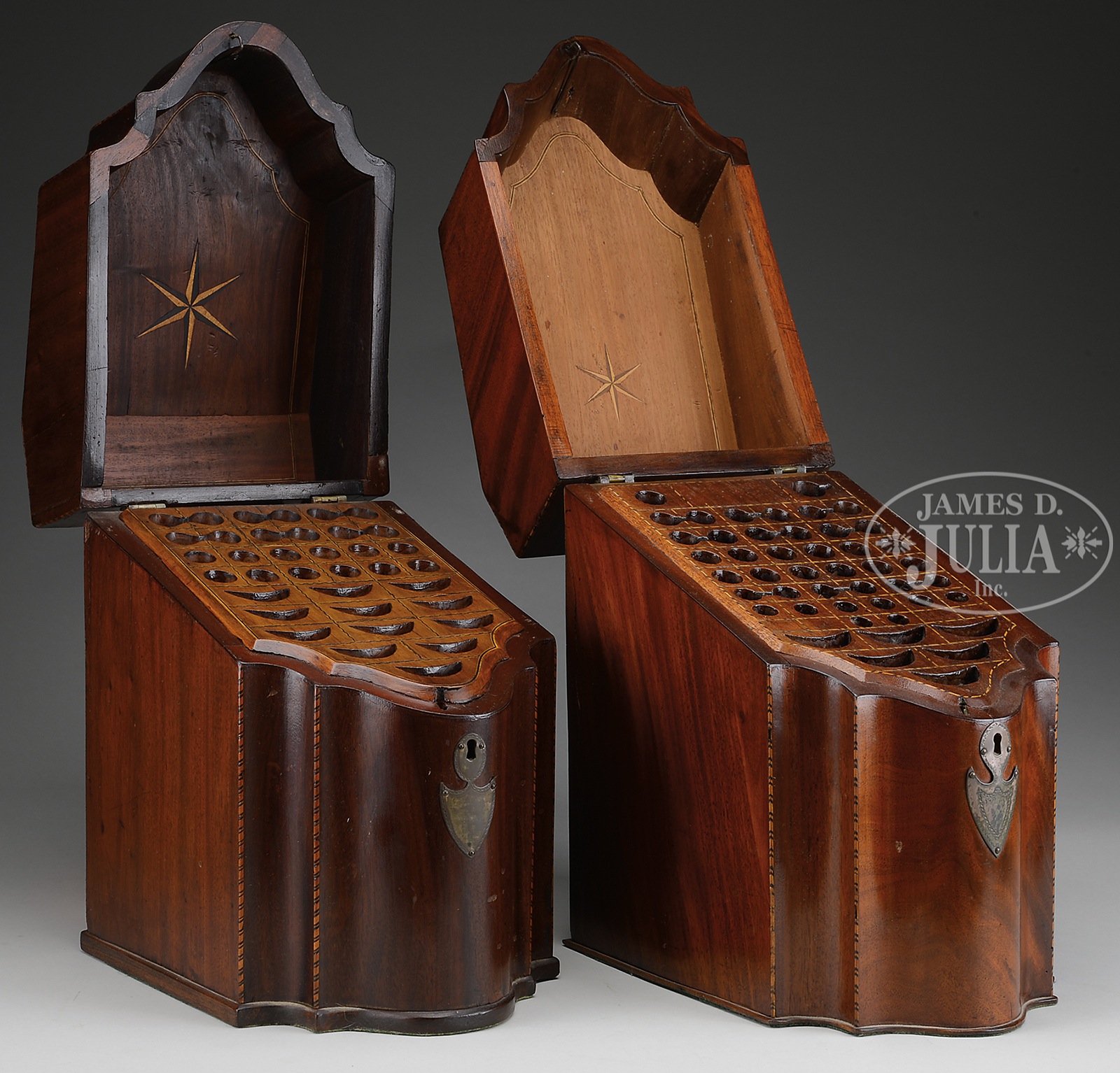 TWO SIMILAR SHERATON INLAID KNIFE BOXES.Both with scalloped fronts, lift lids, inlaid fitted interiors. Mahogany and burl mahogany construction. The first with paterae oval inlaid lid, the second with cornucopia and leaf inlaid panel. Both having original hardware and probably original finish. SIZE: The first: 14″ h; the second: 15″ h. CONDITION: Both very good with typical minor losses and drying splits. 9-94386 (2,000-4,000) – Lot 2479