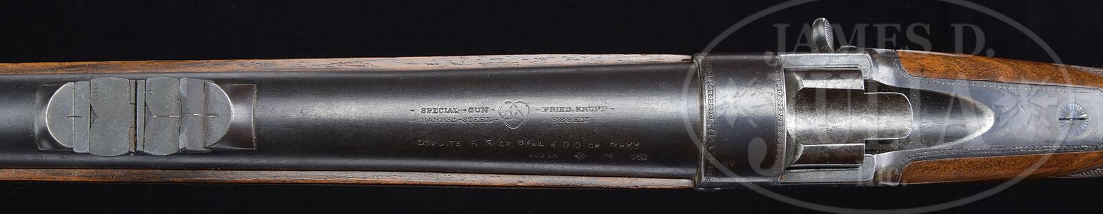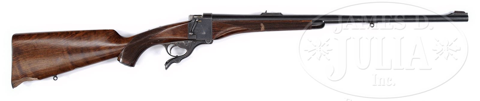 *THOMAS TURNER FARQUHARSON SINGLE SHOT DROPPING BLOCK DANGEROUS GAME RIFLE.SN 7893. Cal. .450/.400 Nitro Express. 25″ Tapered round bbl with lightening step, is engraved “THOMAS TURNER. FISHER STREET. BIRMINGHAM” on top. Rear portion of bbl is stamped with Krupp steel information, and Birmingham proofs for 55 grains cordite and 400 grain bullet. Bbl is fitted with island base holding one standing, two folding leaf express rear sight, and long front ramp with silver bead. Typical Farquharson PD action with side safety (SAFE inlaid in gold), is engraved with geometric and vine borders. “Thomas Turner” is in scroll terminated riband on each side. Top tang has been fitted for tang sight, plug screws installed. Bottom tang is engraved with SN. Nicely figured European walnut horn capped pistol grip buttstock measures 14-3/4″ over steel buttplate with trap, and features flat top point pattern checkering with mullered borders at grip, and a vacant silver oval and a sling eye, matching that on bbl, on toe line. Matching forend with Turner’s unique swept shaping, has horn tip, and attaches to bbl with screw through engraved diamond shaped escutcheon. Removal of forend reveals SN stamped on bottom of bbl, with face frame “3”, “AF” (Francotte?) in script, as well as “PD”. This rifle is pictured and described on pp. 166-169 in BRITISH SINGLE SHOT RIFLES VOL. 3 by Wal Winfer. Drop at heel: approx 2-1/4″, drop at comb: approx 1-15/16″. Weight: 8 lbs 3 oz. LOP: 14-3/4″. PROVENANCE: Richard Schreiber Collection. Invoice from Christies including this rifle. CONDITION: Good, as partially refinished. Bbl and action retain most of an old re-blue over light scattered pitting, with a number of subsequent marks. There are traces of orig case hardening color on trigger group. Stocks retain most of an old oil refinish, checkering nicely re-cut, with a large 2-1/2″ x 1″ chip at toe, and a large gouge in checkering of forend. Bore is very good, strong rifling throughout, dark in grooves. Action is smooth. This rifle exhibits most of the characteristics associated with rifles retailed by W. J. Jeffery; undoubtedly Turner built rifles for Jeffery. 4-45983 (4,000-6,000) – Lot 2479 Click here to view provenance