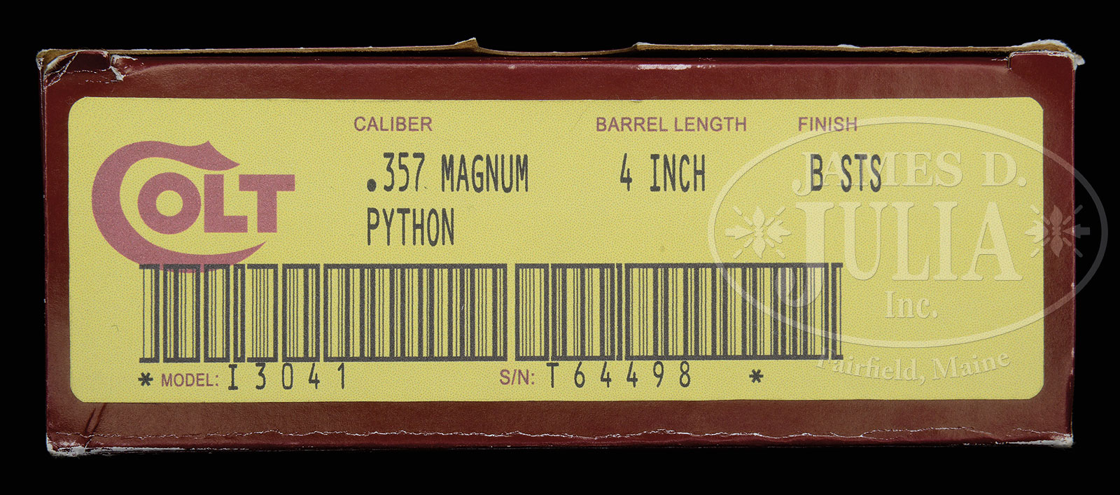 *COLT PYTHON BRIGHT STAINLESS DA REVOLVER WITH ORIGINAL BOX.SN T64498. Cal 357 MAG. Bright polish stainless with 4″ vent rib bbl, red ramp front & adjustable white outline rear sights. Bbl has standard markings with Rampant Colt trademark on the side plate. Mounted with a Hogue monogrip that has pebble grain finish and finger groove rubber grips. This type of grip is pictured on page 168 of Seven Serpents – The History of Colt’s Snake Guns, Brown. Accompanied by its orig, matching numbered burgundy 1-pc, Styrofoam lined box containing owners manual, papers and hang tag. CONDITION: Crisp, new, unfired with only a faint cylinder line. Grip screw is slightly battered. Box is equally new. 51176-53 JRL (2,500-3,500) – Lot 2479