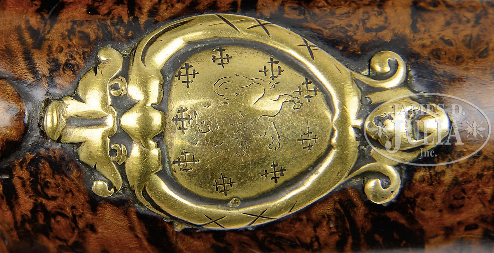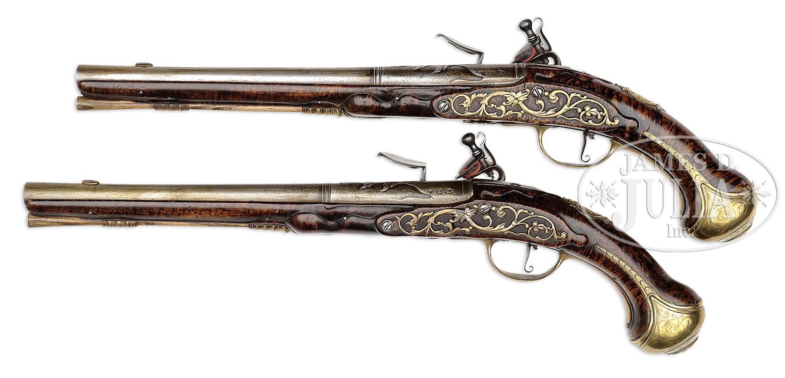 VERY FINE AND RARE PAIR OF LONG LATE 17TH CENTURY ENGLISH FLINTLOCK HOLSTER PISTOLS BY HUMPHREY PICKFATT, CIRCA 1690.SN NSN. Convex banana shaped locks of late 17th century form finely engraved with strawberry leaves, the cocks en suite, frizzen is molded with acanthus, bbls finely chiseled with acanthus, London gun maker’s proofs HP” for Humphrey Pickfatt, signed “H. Pickfatt”. The stump maple stocks beautifully figured. Spurred butts with grotesque masks. Ramrod pipes turned in 17th century style. Thumb pieces with coat of arms lion rampant. This pair of late 17th century English flintlock holster pistols is a rare survival as they exhibit few if any repairs and are of museum quality throughout. PROVENANCE: James Milton, Rancho Sante Fe, California. Collection of Dr. Douglas Sirkin. CONDITION: Very fine for age, metal still crisp, lightly pitted but this is to be expected in 17th century English guns. Stocks very fine with one minor crack through forward of trigger guard, once again expected with highly figured stump maple. No visible repairs or replacements throughout. All small parts on locks original, including top jaws. Strawberry leaf engraving on butts still crisp. English holster pistols of this quality and condition very rarely come to auction. 4-49835 (10,000-15,000) – Lot 2480