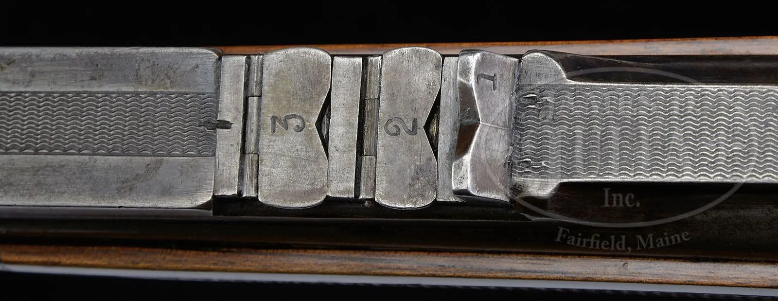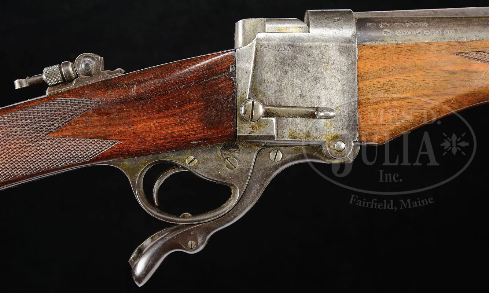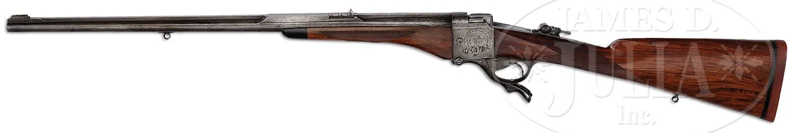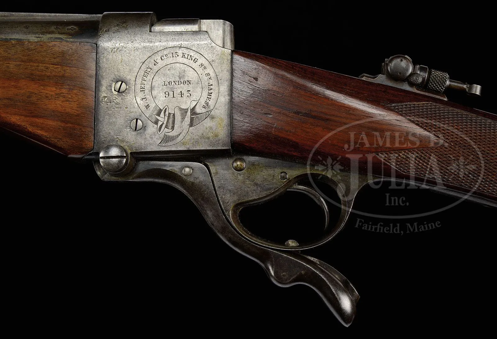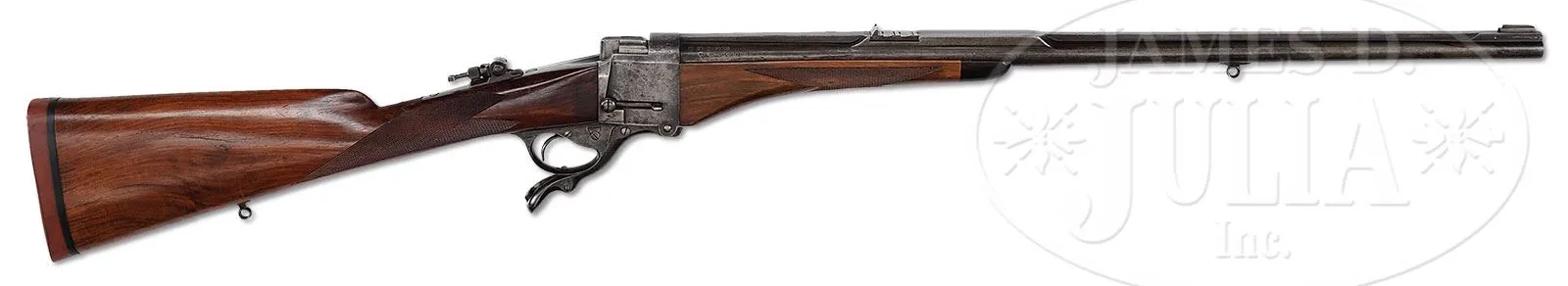 *W. J. JEFFERY SIDE SAFETY FARQUHARSON FALLING BLOCK RIFLE WITH UNUSUAL INTEGRAL RIB.SN 9143. (1899) Cal. .400/ .350 Nitro express. 26″ Bbl has unusual integral full length matted rib with central and rear portions milled away at sides, leaving wide area as rear sight base, which is fitted with one standing, two folding leaf express sight, and front base with silver bead. Right rear of bbl is stamped with Birmingham nitro proofs for .350 express, 43 grains cordite and 310 grain bullet. Farquharson action with long safety lever on right side (SAFE engraved), is engraved with Jeffery name and address in circular belt on left side, with “London” and SN at center. Lyman (usually factory) tang sight is installed. Lightly figured tropical hardwood straight grip buttstock (factory records indicate orig stock was straight grip) measures 14-3/8″ over Silver pad. Point pattern checkering is at grip, and a sling eye, matching that on bottom of bbl, is on toe line. Matching swept forend with horn tip, attaches to bbl with screw through diamond shaped escutcheon. Removal of forend reveals SN on bottom of bbl, and face of frame stamped “PD” and with SN. Drop at heel: approx 2-1/4″, drop at comb: approx 1-7/8″. Weight: 8 lbs 12 oz. LOP: 14-3/8″. PROVENANCE: Richard Schreiber Collection. Copy of factory ledger indicating that this rifle was made with “barrel solid shaped rib” and “straight grip”. CONDITION: Good. Metal parts retain traces of what may be their orig finish, mostly pewter gray to brown with some light pitting. Replacement stocks retain most of their finish, checkering lightly worn. Bore is fine, with some light frosting. Action is smooth. This rifle is pictured and described on pp. 130 – 131 of BRITISH SINGLE SHOT RIFLES VOL. 3 by Walt Winfer. 4-45848 (4,000-6,000) – Lot 2480 Click here to view provenance
