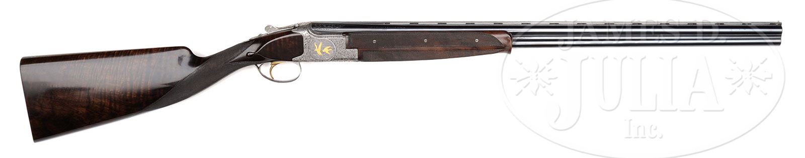 *FABULOUS FN SUPERPOSED 28GA WITH EXHIBITION QUALITY ENGRAVING BY MASTER GRAVEUR J.H. DIET.SN 145F73. SN 145F73. Cal. 28 ga. 28” Bbls choked modified and full, with narrow, ventilated rib, are marked “FABRIQUE NATIONALE HERSTAL BELGIQUE” and with steel, gauge, and 2-3/4” chambers on left side of top bbl. right side is marked “MADE IN BELGIUM – BROWNING PATENTS”. There are 2-1/2” wedges of relief shaded scroll on breech ends. Coin finished superposed action with gold-plated selective trigger is engraved in nearly full coverage with exceptionally well cut, open, shaded, scrolled acanthus in semi-relief. This fine scroll outlines vignettes of gold inlaid game birds in well detailed settings; a pair of black grouse are battling in open meadow on left side of action, a pair of mallards spring from marsh on right. Bottom of action depicts a quail in open meadow. Monogram “J D” is on trigger guard bow. Engravers name “J. H. Diet. de SAROLAY” is on trigger plate. Dark, fiddle figured, and nicely marbled European walnut swan-necked buttstock measures 14-1/2” over skip line checkered wood butt. Modified point pattern checkering with carved beaded borders is at grip. Side panels have well shaped drop points. Matching one piece forend has dummy screws and glue line to imitate 3-pc forend. Drop at heel: 2”, drop at comb: 1-1/2”. Weight: 6 lbs. 11 oz. LOP: 14-1/2”. Original black FN/ Browning A-1 marked box with end label, has had Midas mistakenly written in at later date. Box contains brown wrapping paper and original foam. CONDITION: Excellent from upgrading, showing very little use. Bbls retain nearly all of their blue with a few light marks, mostly from sliding of forend. Action retains essentially all of its coin finish. Stocks retain essentially all of their shiny oil finish with a few light marks and rubs. Bores are excellent. Action is tight. Mechanically crisp. Box has loss due to tape removal in many spots, with edges nicked, corners slightly rubbed through, one repaired with tape. End label is slightly foxed, and has some minor rubs. 4-50143 MGM78 (7,500-12,500) – Lot 2481