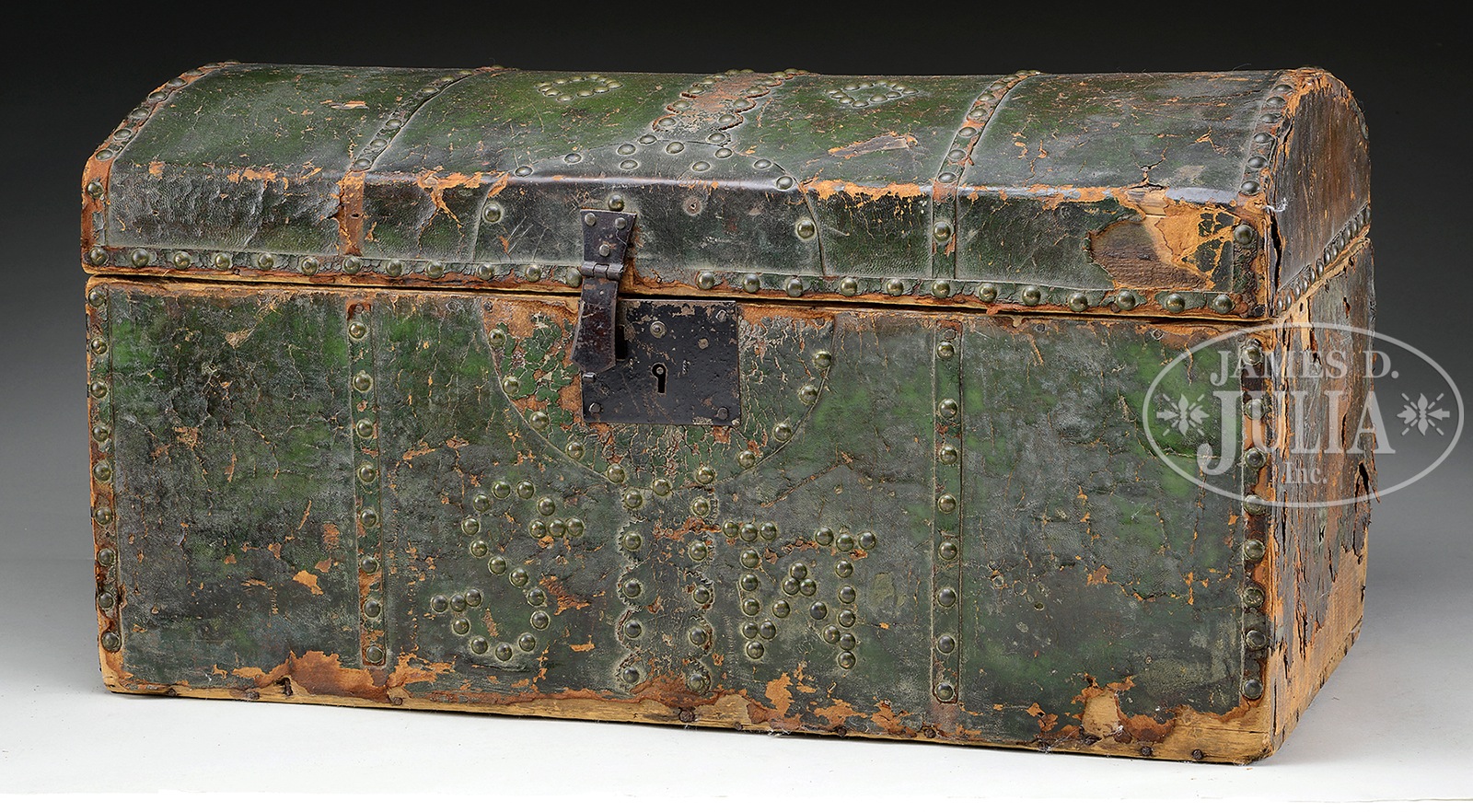 LEATHER DOME TOP TRUNK.First quarter of 19th century, Northern New England or New York state. Leather dome top trunk has tack decoration and initials S.W. on front panel in tacks. Materials are pine and white wood with leather and tack covering exterior, interior with old wall paper. SIZE: 26″ l x 13-1/4″ t x 14″ d. PROVENANCE: Estate of Siro R. Toffolon of Old Lyme, CT. Includes handwritten genealogical history. CONDITION: Fair condition with losses to leather, overall. Rare leather hinges no longer viable, one leather handle present but detached and one missing. 49476-116 (100-125) – Lot 2481