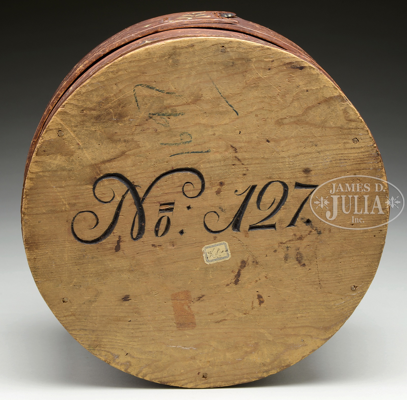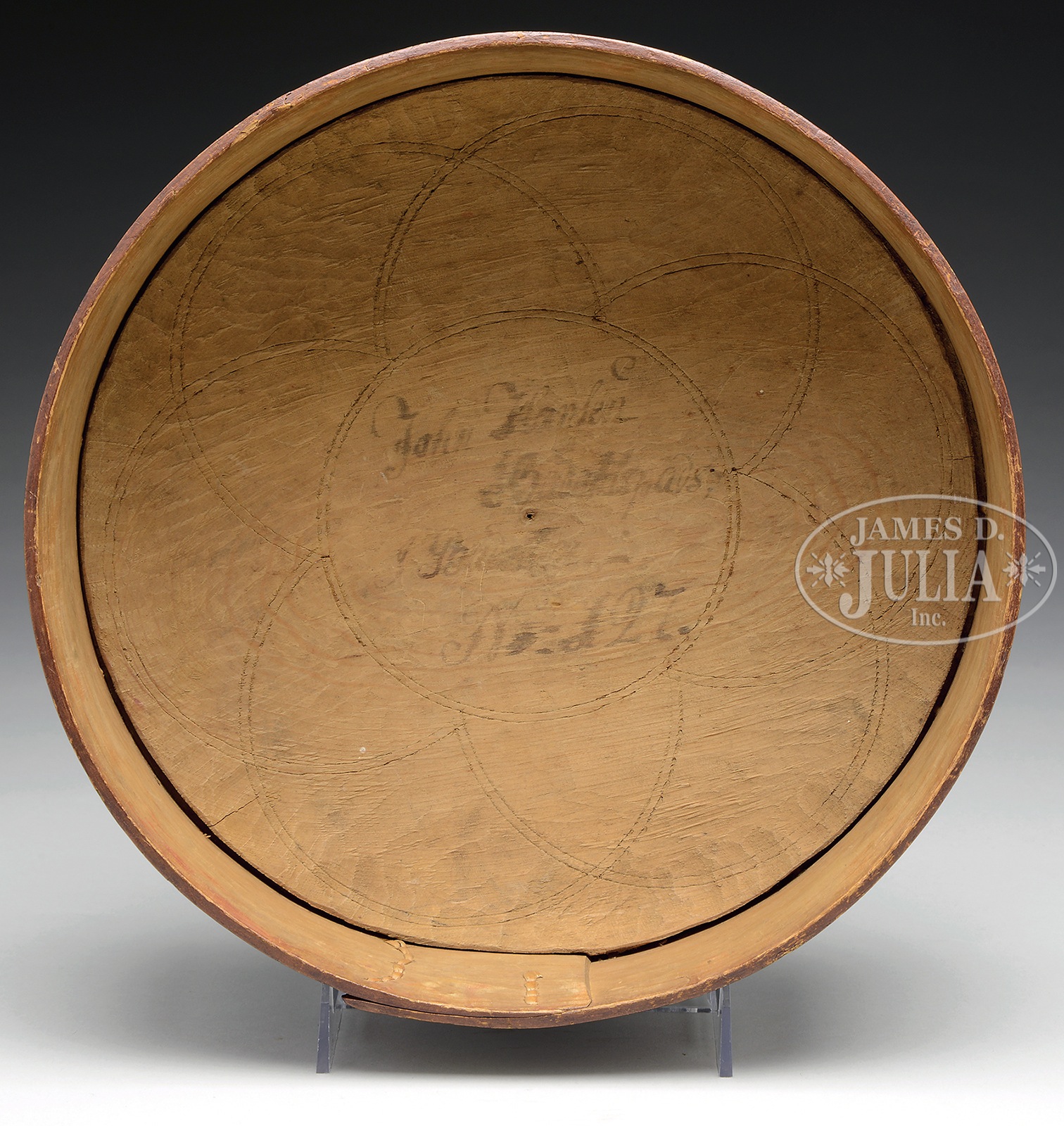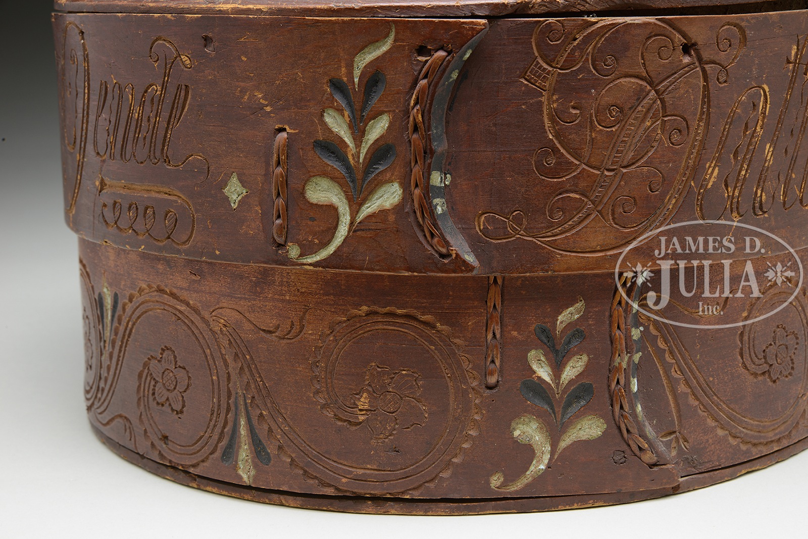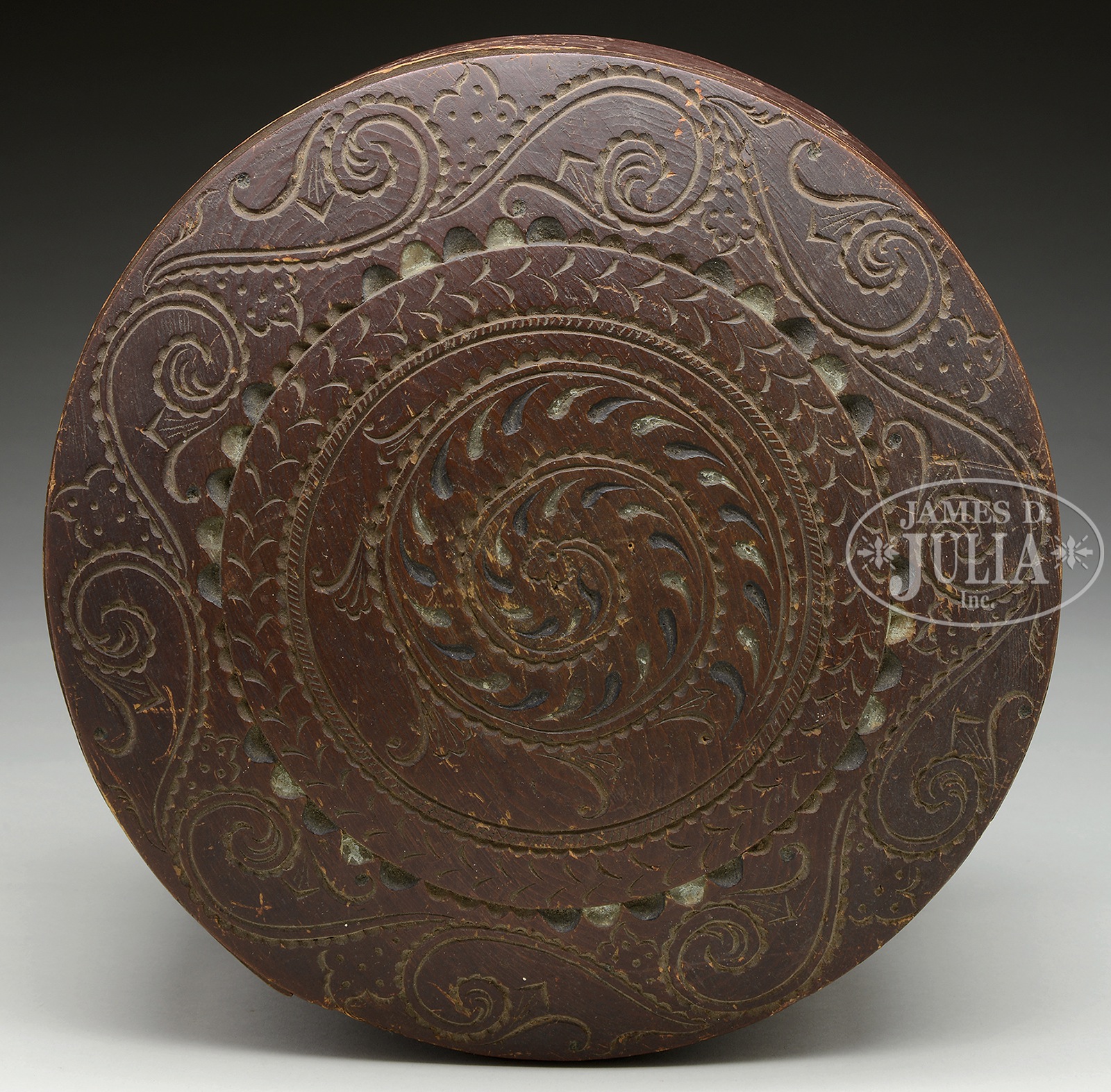 SPECTACULAR EARLY 19TH CENTURY CHIP CARVED SCANDINAVIAN STORAGE BOX.Without question this is the finest example of a Scandinavian decorated box that we have ever handled at auction. The top with wonderful chipped and scrolled carvings. The band around the lid dated boldly “1817” with what appears to be the name of the owner carved in the sides of the box, also similarly decorated. The box constructed with wooden pegs and fine strips of birch bark stitching which holds the straps together. The bottom boldly seraphed “no. 127” which is also highlighted in black. The decorations on the side and top also have some residual polychrome decoration. Inside of the lid also inscribed with decoration and in faded ink with what appears to be the owner; again number “no. 127”. SIZE: Approx. 11-1/2” dia, when lid in place 6-3/4” h. CONDITION: Appears to be absolutely untouched with a marvelous 200 year old patina. In outstanding condition. 49421-60 (2,750-3,750) – Lot 2482