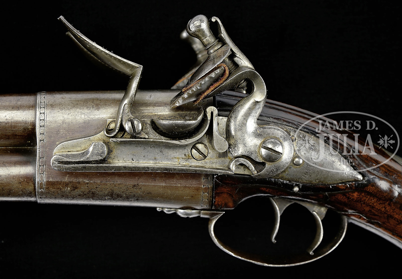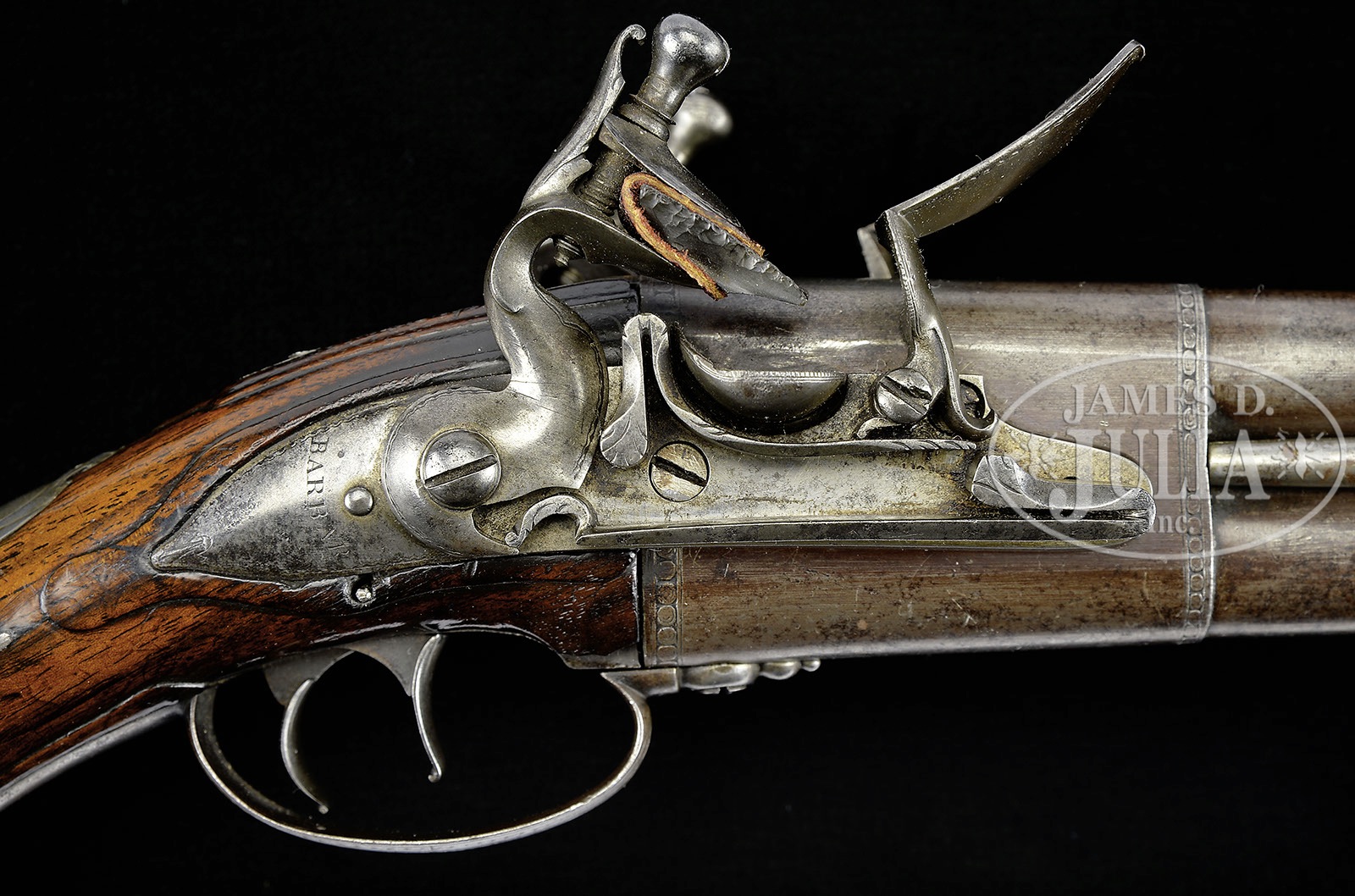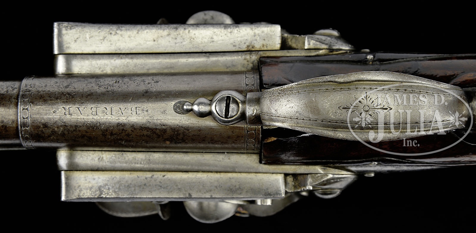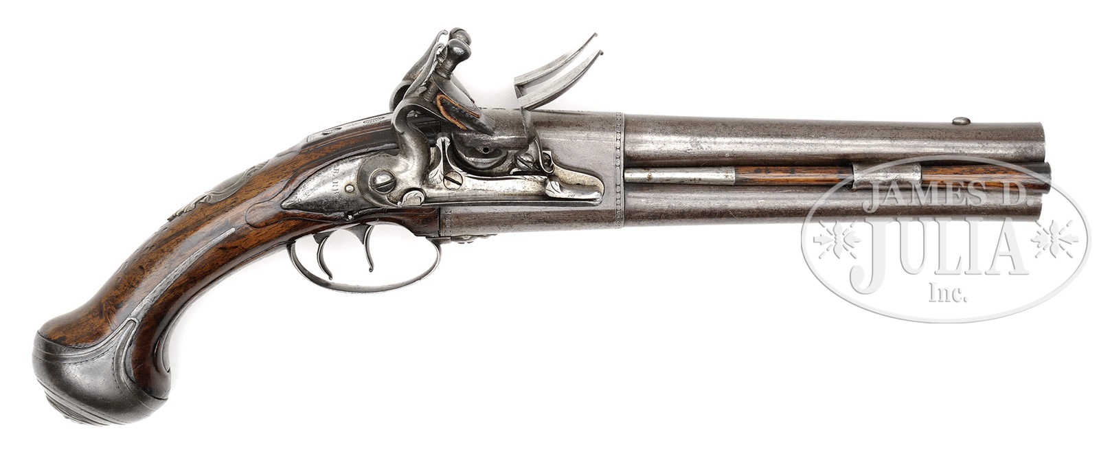 Please Note: This pistol is pictured as item P-46 in the book “Weapons of the American Revolution” Moore. JAMES BARBAR DOUBLE BARRELED FLINTLOCK PISTOL.SN NSN. This Revolutionary War era, circa 1750, military sized double barrel pistol measures just over 15″ overall with 9″ 65 cal bbls. Warren Moore in his book Weapons of the American Revolution shows a fairly identical pair of these guns on pg 35. As noted by Moore, an interesting feature of these pistols is the placing of the lockspring on the outside of the locks beneath the frizzen springs. This iron mounted pistol has silver thumbplate and silver mask on the butt, typical of pistols carried by officers during the Revolutionary War. Each bbl and each lock is marked “BARBAR”. This gun appears all orig and authentic. PROVENANCE: Collection of Charles A. Lamb. CONDITION: Very good overall. Markings in steel including bbl proofs and engraved borders of bbl housing and elsewhere are all easily discernible. There is strong traces of org brown finish in protected areas especially on bbl housing. Stock is sound and solid retaining about half of its orig thin varnish finish as does ramrod’s wood body. 4-51865 JS105 (6,000-10,000) – Lot 2484