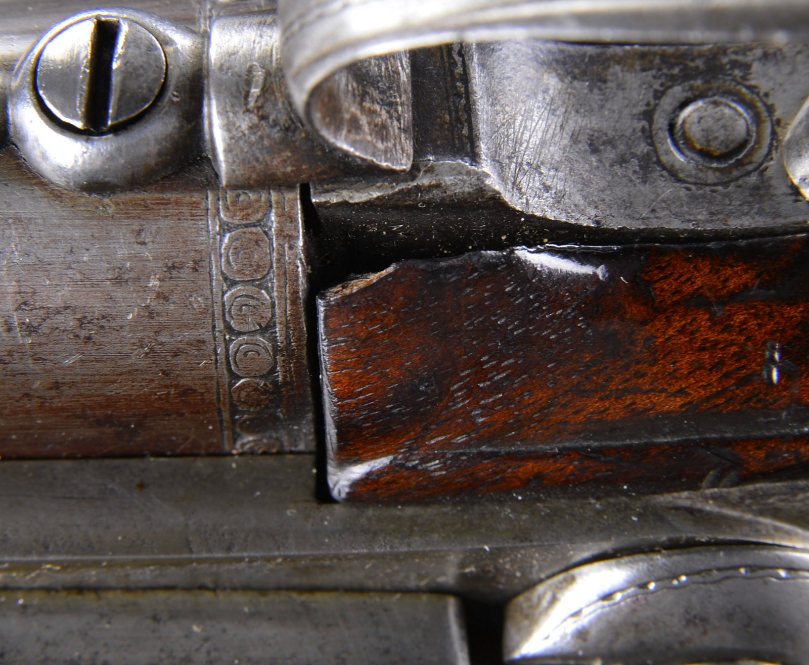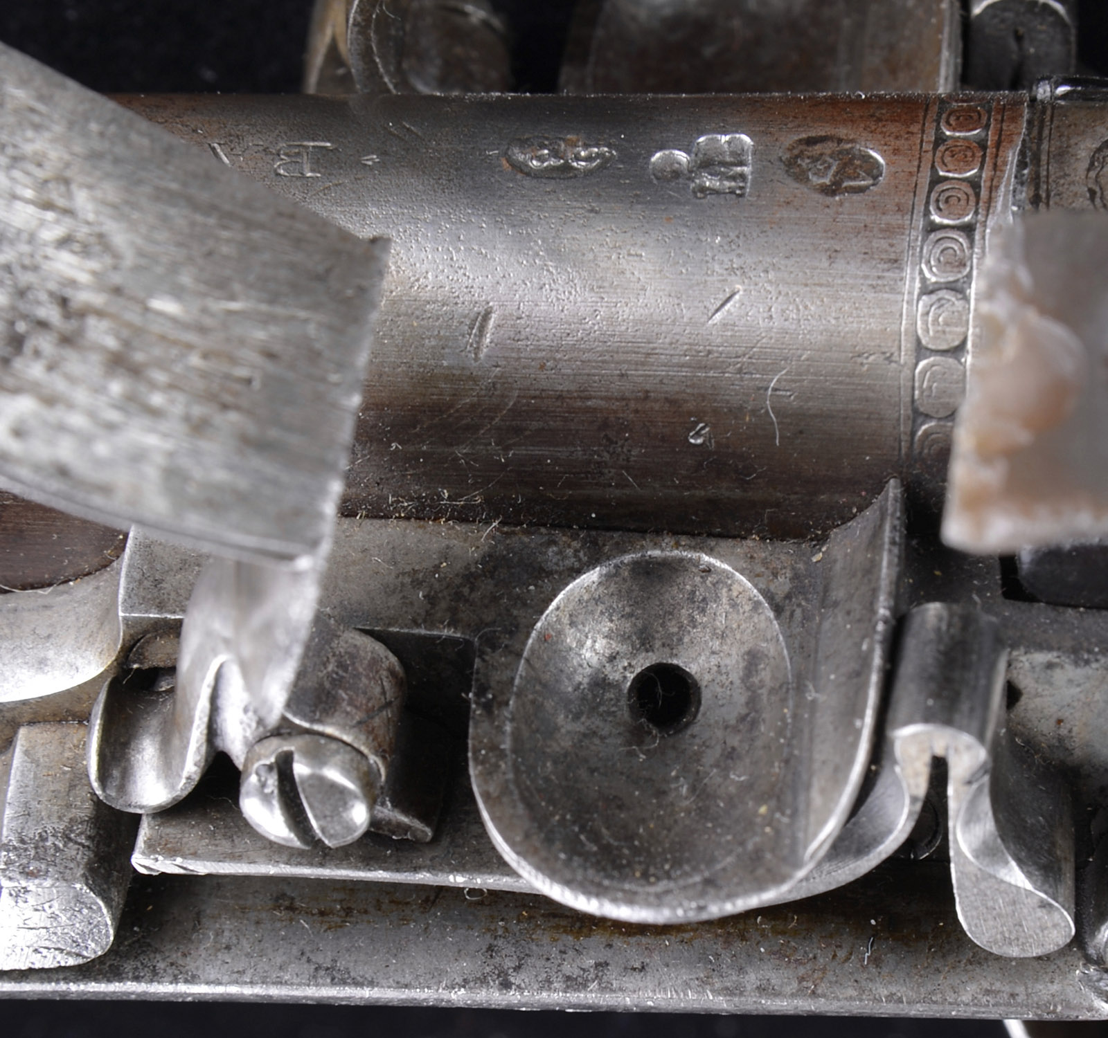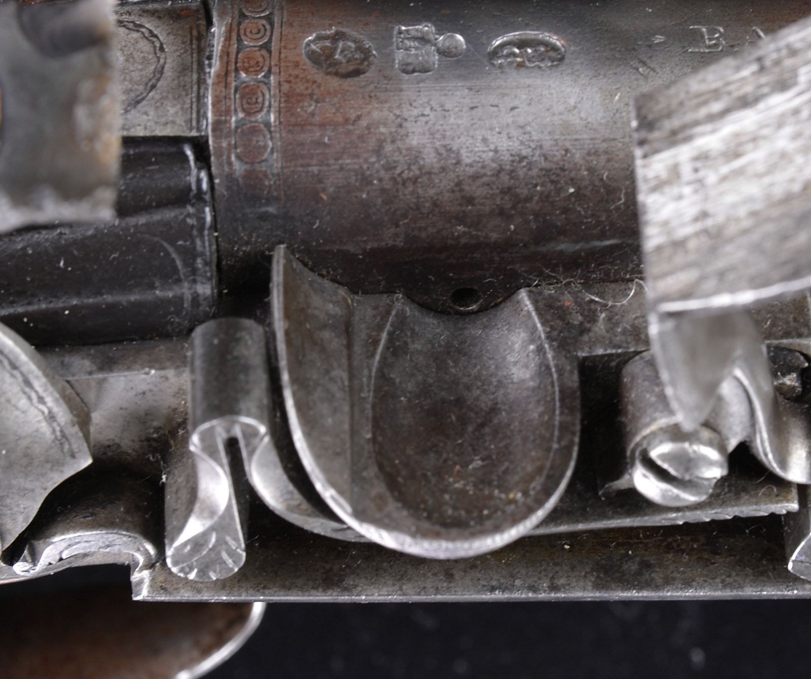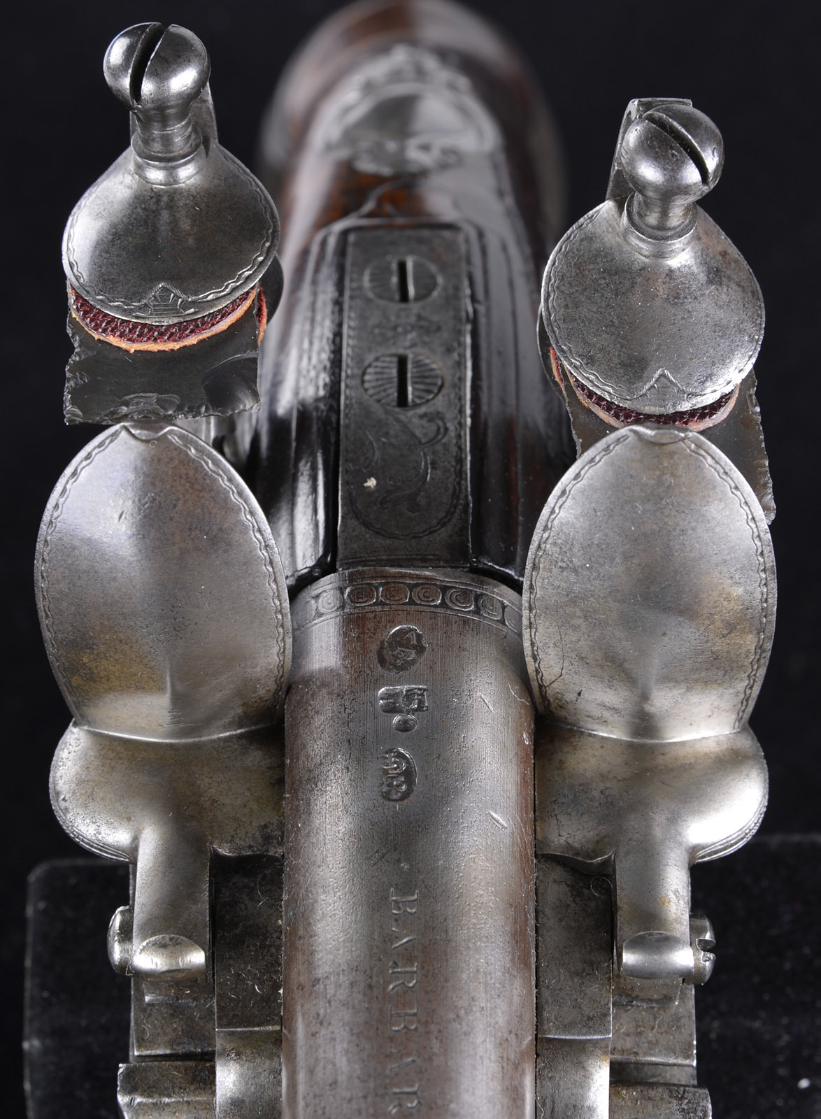Please Note: This pistol is pictured as item P-46 in the book “Weapons of the American Revolution” Moore. JAMES BARBAR DOUBLE BARRELED FLINTLOCK PISTOL.SN NSN. This Revolutionary War era, circa 1750, military sized double barrel pistol measures just over 15″ overall with 9″ 65 cal bbls. Warren Moore in his book Weapons of the American Revolution shows a fairly identical pair of these guns on pg 35. As noted by Moore, an interesting feature of these pistols is the placing of the lockspring on the outside of the locks beneath the frizzen springs. This iron mounted pistol has silver thumbplate and silver mask on the butt, typical of pistols carried by officers during the Revolutionary War. Each bbl and each lock is marked “BARBAR”. This gun appears all orig and authentic. PROVENANCE: Collection of Charles A. Lamb. CONDITION: Very good overall. Markings in steel including bbl proofs and engraved borders of bbl housing and elsewhere are all easily discernible. There is strong traces of org brown finish in protected areas especially on bbl housing. Stock is sound and solid retaining about half of its orig thin varnish finish as does ramrod’s wood body. 4-51865 JS105 (6,000-10,000) – Lot 2484