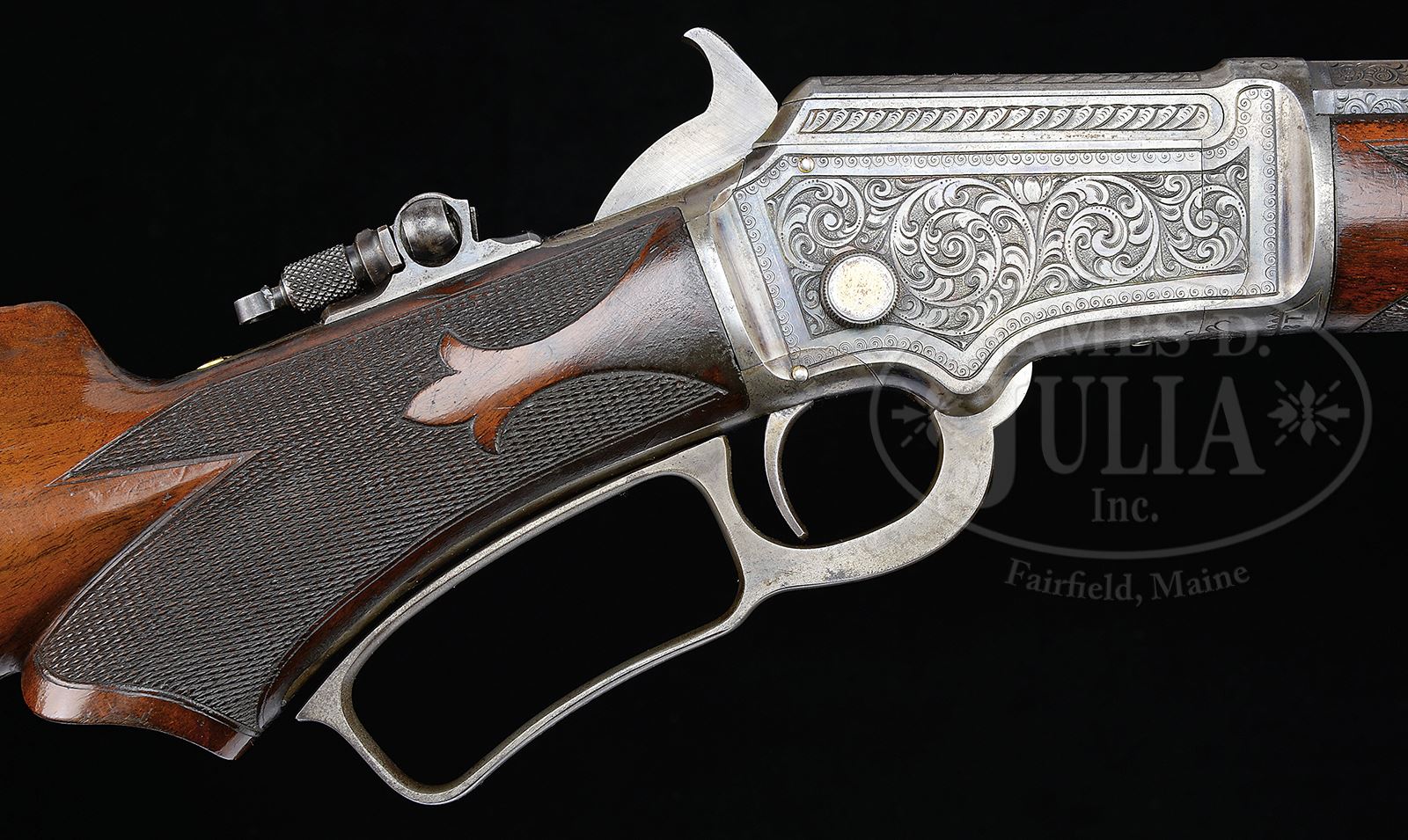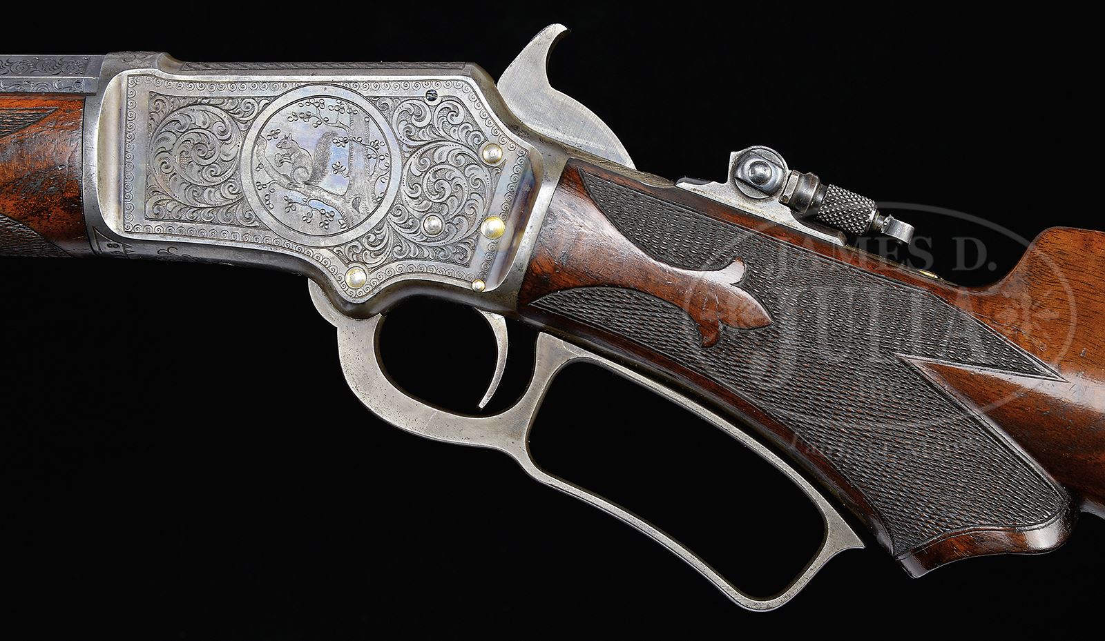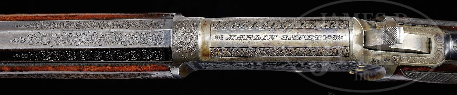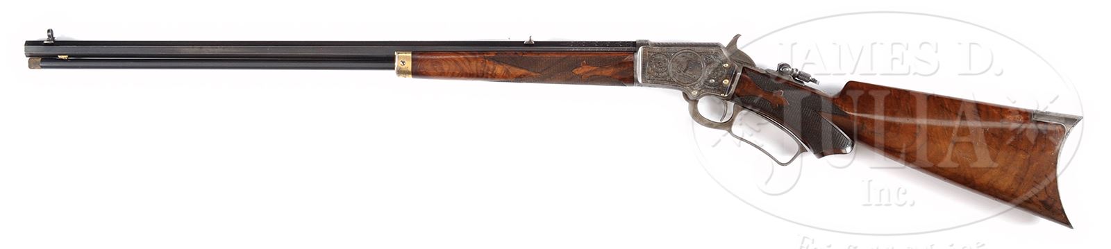 RARE ENGRAVED SPECIAL ORDER MARLIN 1ST MODEL 1892 LEVER ACTION RIFLE.SN 124058. Cal. 22. Beautiful small bore Marlin with 24” oct bbl, full magazine, “certifiable antique ivory” bead combination front sight, fixed rear sight and Lyman combination tang sight. Mounted with very highly figured C-style checkered American walnut with serpentine grip buttstock and crescent buttplate. Stock is cast on for the left shoulder – likely by the factory. SN was observed on bottomd of receiver with matching number in top tang channel of buttstock. Inside toe buttplate is marked with the # 128058. Although this number is not matching, the buttplate fits perfectly and is lightly engraved. Receiver is beautifully engraved in #3 style by Conrad Ulrich with the rnd vignette of a squirrel sitting on a tree limb all surrounded by foliate arabesque patterns and latch-hook borders. Right side has full coverage matching foliate arabesque patterns with feather patterns on the bolt. Matching foliate arabesque patterns extend about 3” up the bbl on all 5 exposed flats. Receiver, lever and hammer are color case hardened with the takedown screw, forend cap, magazine cap and magazine dovetail along with all the screws gold plated. Top left side of receiver has had a tiny screw installed. Accompanied by a Cody Firearms Museum letter which identifies this rifle in Cal. 22 with half oct 24” bbl and pistol grip stock, shipped March 24, 1896 with one repair, year not listed. Special Note: This item contains or is made of ivory. Do not bid on this lot unless you have read and agreed to our "Ivory Position Statement" and the "Waiver of Legal and Financial Risk to James D. Julia in regards to your Purchase of an Ivory Object." This information is located in the front section of our catalog. CONDITION: Very fine. Bbl retains about 95% strong orig blue showing wear over the chamber area. Magazine tube retains about 98% orig blue. Receiver retains about 75% faded orig case colors and the hammer about 60% case colors. Lever retains smoky case colors on the sides, being mostly turned silver. Forend cap shows about 80-85% bright gold-wash with thin gold in the magazine tube cap. Screws retain strong orig gold. Forearm has a repaired chip at the forend cap, otherwise wood is sound with light nicks and scratches showing moderate wear on the checkering and retains about 95-96% strong orig varnish. Buttplate is grey metal patina. Mechanics are fine. Bright shiny bore. 49121-9 JR IVORY (25,000-35,000) – Lot 2484 Click here to view provenance