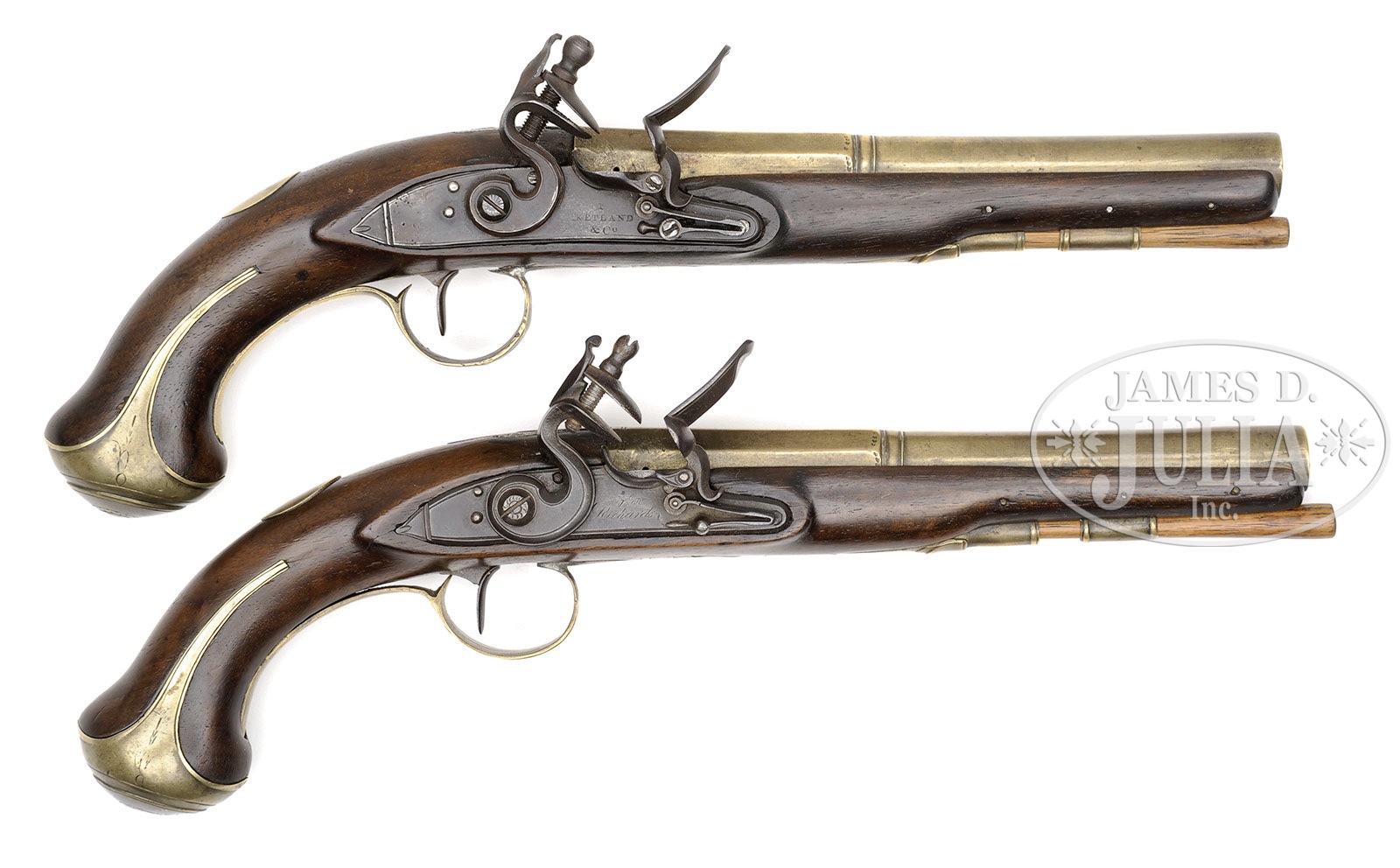 SN NSN. 8″ oct to rnd brass 60 Cal. smooth bore bbls English proofed at breech. Brass mounted with engraved trigger guards with pineapple finials and brass buttcaps extending up each side of grip. Brass sideplates are engraved and lock on one pistol is marked “J&W Richards” while the second pistol’s lock is marked “T Ketland & Co.”. J&W Richards worked in Birmingham/GB circa 1799-1817. PROVENANCE: Collection of Dr. Douglas Sirkin. CONDITION: Good to fine. T Ketland marked lock has been broken and repaired at tail end and may be a replacement. Wood repair around forward part of Ketland lock. 2-1/2″ crack repair on left side at muzzle on Richards marked pistol. 4-50133 RG54 (4,000-8,000) – Lot 2486