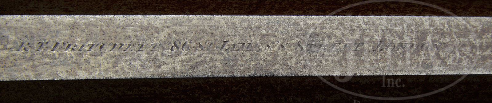 R.T. PRITCHETT PERCUSSION SINGLE BARREL SPORTING RIFLE.SN 3062. Cal. .490 Groove diameter. (3 broad grooves, correct for Pritchett ball, one turn in approx 40″). This unusual sporting rifle by this fine London maker, inventor of the Pritchett ball, adopted by the British government as a replacement for the Minie ball; has 28″ ovate bbl with under rib. Rib is fitted with two plain pipes holding hickory ramrod with brass head and tail with worm. Top flat is engraved “R. T. Pritchett 86 St. James’s Street London” and is fitted with three folding leaf express rear and silver bead front sights. Breech plug is nicely scroll engraved and has platinum blow-out. Breech iron with integral fence is finely engraved with close shaded scroll. Lockplate mounted with tall serpentine flat faced hammer with dolphin head is fitted with front sliding stalking safety which engages hammer at half cock. Lock and hammer are also finely scroll engraved, and lock is also engraved “R. T. Pritchett”. Trigger plate is fitted with single set trigger, and has elongated round finial. Scroll engraved trigger guard forms scrolled grip at rear, and is engraved with SN. Nicely marbled and lightly figured circassian walnut stock has point pattern checkering at grip and fore piece, and features right hand shadow line beaded cheekpiece, sling eye and vacant silver oval on toe line, steel buttplate with long top tang, and a steel patchbox on right side with spring loaded circular cover, which contains some old waxed muslin patches. Patchbox is finely scroll engraved surrounding central family crest of naked upper torso of man holding British flag in his left hand, and dagger in his right, surmounted by a sovereign’s crown. This is undoubtedly the family crest of the orig owner of this rifle, and would certainly lead to some interesting research. Drop at heel: approx 1-7/8″, drop at comb: approx 1-1/2″. Weight: 6 lbs 7 oz. LOP: 14-3/8″. CONDITION: Very good. Bbl retains nearly all of a re-brown giving fair definition to pattern, engraving slightly softened. Breech iron, lock, and hammer are mostly gray brown, with traces of orig blue on trigger guard. Stock retains considerable amount of what appears to be its orig finish with some oil rubbed in over light marks and scratches. Bore is very fine, shiny, with one or two scattered pits, but sharp rifling throughout. Lock is crisp. Safety works. Trigger will not remain set. An interesting and fine handling percussion single rifle in a caliber suitable for deer sized game. 4-54004 (4,000-8,000) – Lot 2486