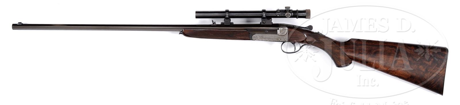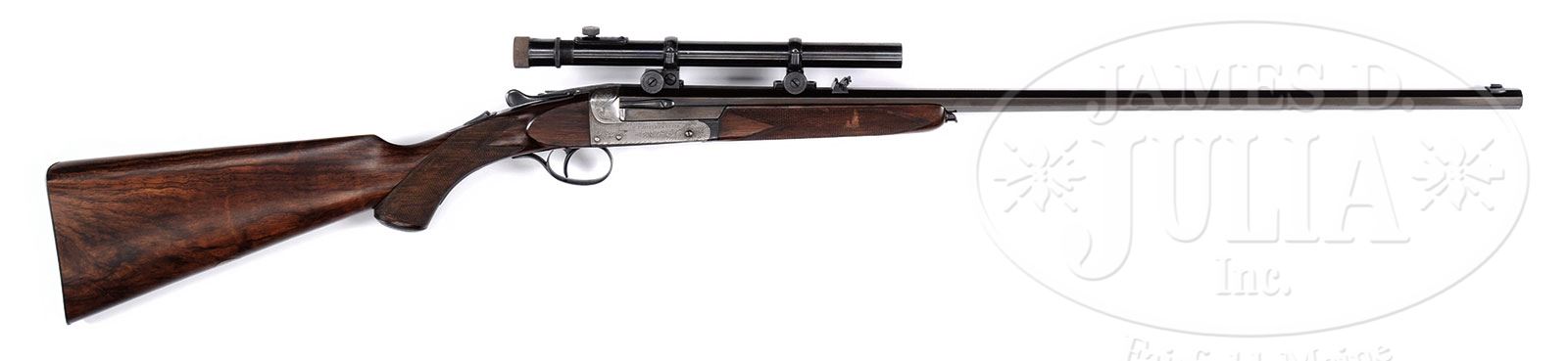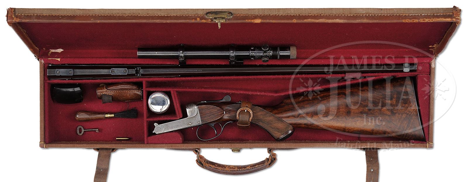 *W.J. JEFFERY BOXLOCK EJECTOR ROOK RIFLE WITH SCOPE AND CASE.SN 28237. (ca 1938) Cal. .22 LR. 26″ Tapered octagon bbl with silver bead front, and one standing, two folding leaf rear sight dovetailed through top flat, is stippled on flat behind rear sight, and also fitted with Parker Hale scope bases. Top flat in front of rear sight is engraved “W. J. Jeffery & Co Ltd. 9, Golden Square, London, W.1.” Bbl flats are stamped with SN and bottom of bbl is stamped with Birmingham nitro proofs for 22L. Spring loaded ejector system is mounted in bbl flats. Small boxlock top lever action features automatic safety (SAFE inlaid in gold), and bushed striker. Action is engraved with 40% coverage well cut scroll and has “W J Jeffery & Co Ltd.” engraved on each side. Blued top lever, floorplate, trigger guard, and trigger plate are also scroll engraved. SN is on tang. Nicely marbled and figured European walnut steel capped pistol grip buttstock measures 14-5/8″ over blued steel buttplate. Classic point pattern checkering is at grip. A vacant silver oval is on toe line. Matching small splinter forend has Anson release. Drop at heel: approx 2-9/16″, drop at comb: approx 1-5/8″. Weight without scope: 5 lbs 7 oz. LOP: 14-5/8″. Weaver Model 330 scope with post and crosshair reticle is in Parker Hale rings, and has leather lens covers and leather carrying case. Rifle is housed in brown canvas covered case with leather trim, lined in burgundy cloth. Case contains small horn striker block, dusting brush, round plated striker bottle, and an old leather front sight protector. PROVENANCE: George Reeb Collection. CONDITION: Fine, as partially refinished. Bbl retains essentially all of a high quality re-blue. Action is worn to silver gray. Top lever, floorplate, trigger guard, and trigger plate retain essentially all of a re-blue, engraving still clear. Stocks retain nearly all of a hand rubbed oil finish with a few light marks, checkering re-cut. Bore is very fine, lightly frosted. Action is slightly loose. Ejector is strong. Scope is very fine with some scratches and marks on exterior. Optics slightly cloudy. Leather accessories are fine. Case cloth is very fine, lightly faded with some rubs. Leather trim is deteriorating, with some patches missing. Straps and handle are good. Interior cloth is good with some insect damage and rubs. Accessories are excellent, except muzzle protector which is very good. 4-53710 (3,000-5,000) – Lot 2487