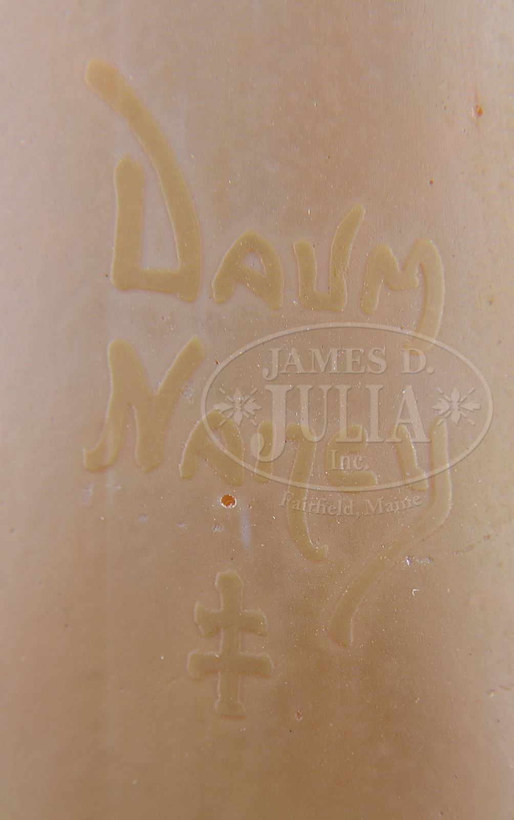 DAUM NANCY FLEUR DE COLOQUINTE VASE.Daum Nancy goblet-shaped vase with satin finish features blown-out zucchini vines and flowers of brown and pale yellow/green against a mottled opalescent white background. Vase is signed with molded “Daum Nancy” and Cross of Lorraine. Similar example found in reference book Daum-Maitres Verriers by Edita Denoel, pg 61. SIZE: 10″ t. CONDITION: Very good to excellent. 50250-6 (3,000-5,000) – Lot 2487