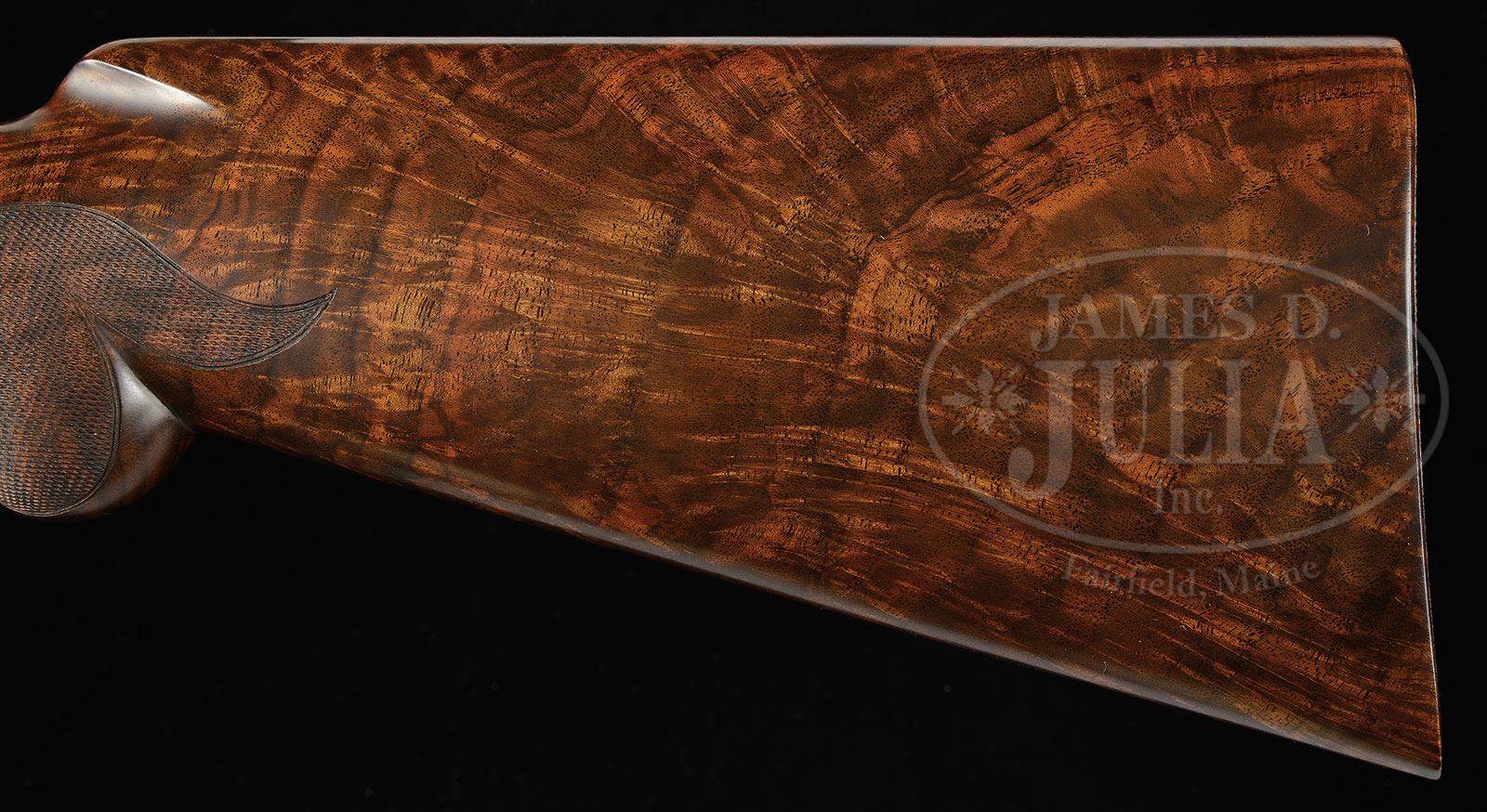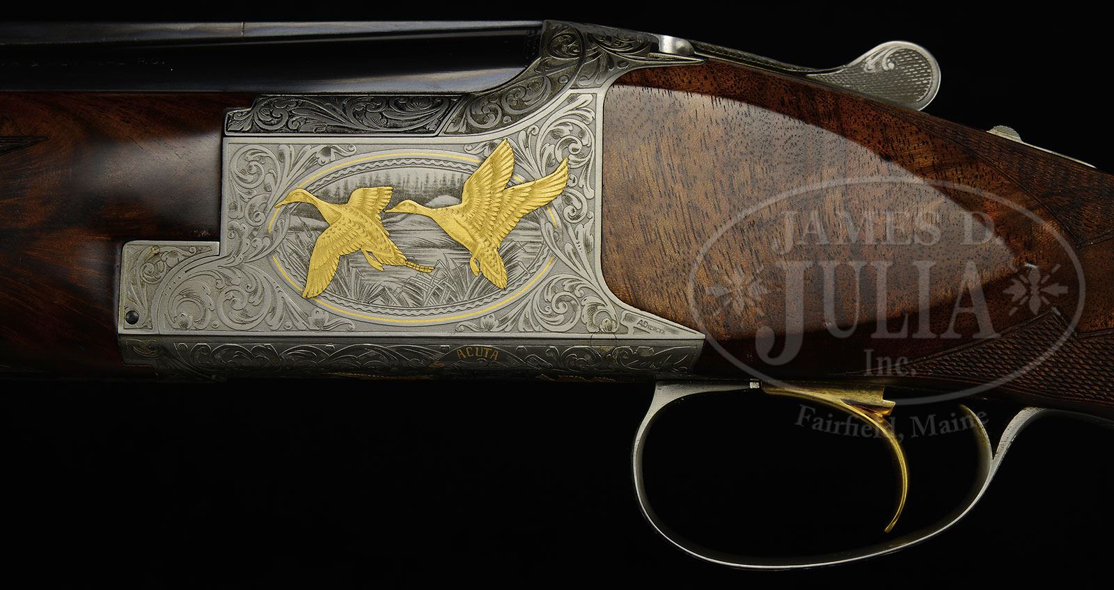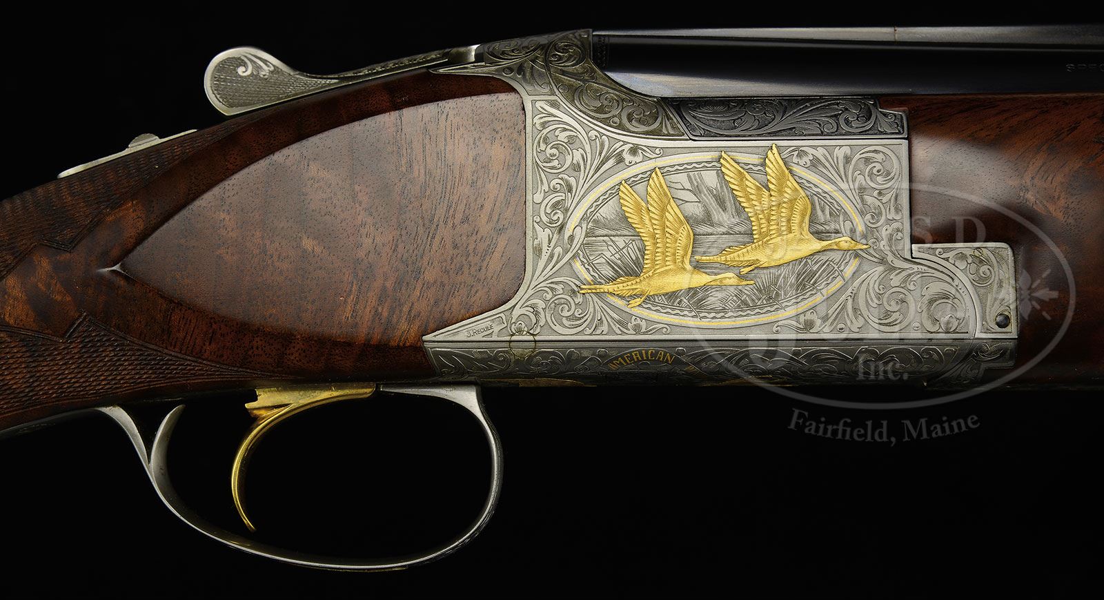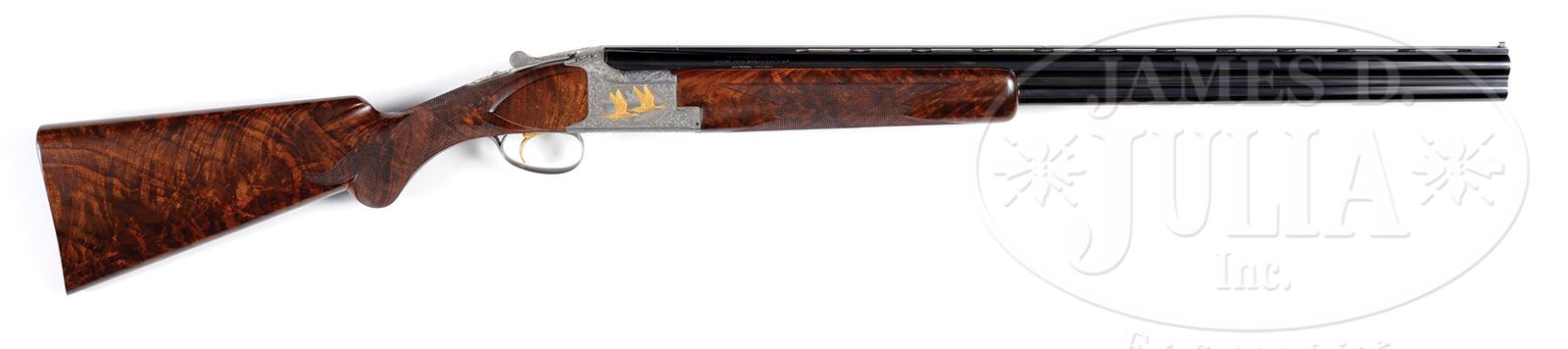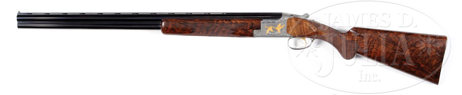 *BROWNING SUPERPOSED WILD FOWL SERIES PINTAIL ISSUE ENGRAVED AND GOLD INLAID BY DIERCKX AND RECULE WITH CASE.SN 8H4PZ00244. Cal. 12 ga. 2-3/4″ Chambers. 28″ Bbls choked mod and full, are fitted with raised, ventilated game rib. Browning name with Utah and Montreal addresses are on left side over “MADE IN BELGIUM”, with right side marked “BROWNING SUPERPOSED” and “SPECIAL STEEL” with gauge information over “BROWNING PATENTS”. Coin finished Superposed action has single selective gold-plated trigger. Action is engraved with very fine, open, scrolled acanthus, with delicately shaded backgrounds, surrounding oval vignettes with gold wire borders of semi-relief gold inlaid scenes of pintails; a pair erupt from marsh on left side of action, with another pair flying over marsh on right. Bottom of action has more gold inlaid pintails, and is also gold inlaid “AMERICAN PINTAIL ANAS ACUTA” on scrolled riband with another scroll inlaid “244 of 500″. The gold head of a pintail graces trigger guard bow. This fine engraving and inlay is by A. Dierckx, whose signature is at bottom rear of left side of action, and J. Recule, whose signature is on bottom left of right side. Exceptional flaming crotch figured American walnut long tang round knob, oil finished buttstock measures 14-3/8″ over skip line checkered wood butt. Modified point pattern checkering wraps around grip and has flourishes into butt. Matching field forend is checkered in point pattern. Drop at heel: 2-3/8″, drop at comb: 1-1/2″. Weight: 7 lbs. 12 oz. LOP: 14-3/8”. Fine American walnut full length case with brass corners and three bail latches, is lined in puckered red velvet. PROVENANCE: William Hammond Collection. CONDITION: Essentially as new, with only the faintest of marks on wood and metal. Mechanically crisp. Possibly unfired. Our consignor purchased this gun new and it has not been fired since he acquired it. Case is excellent. 4-50485 MGM261 (6,000-10,000) – Lot 2491