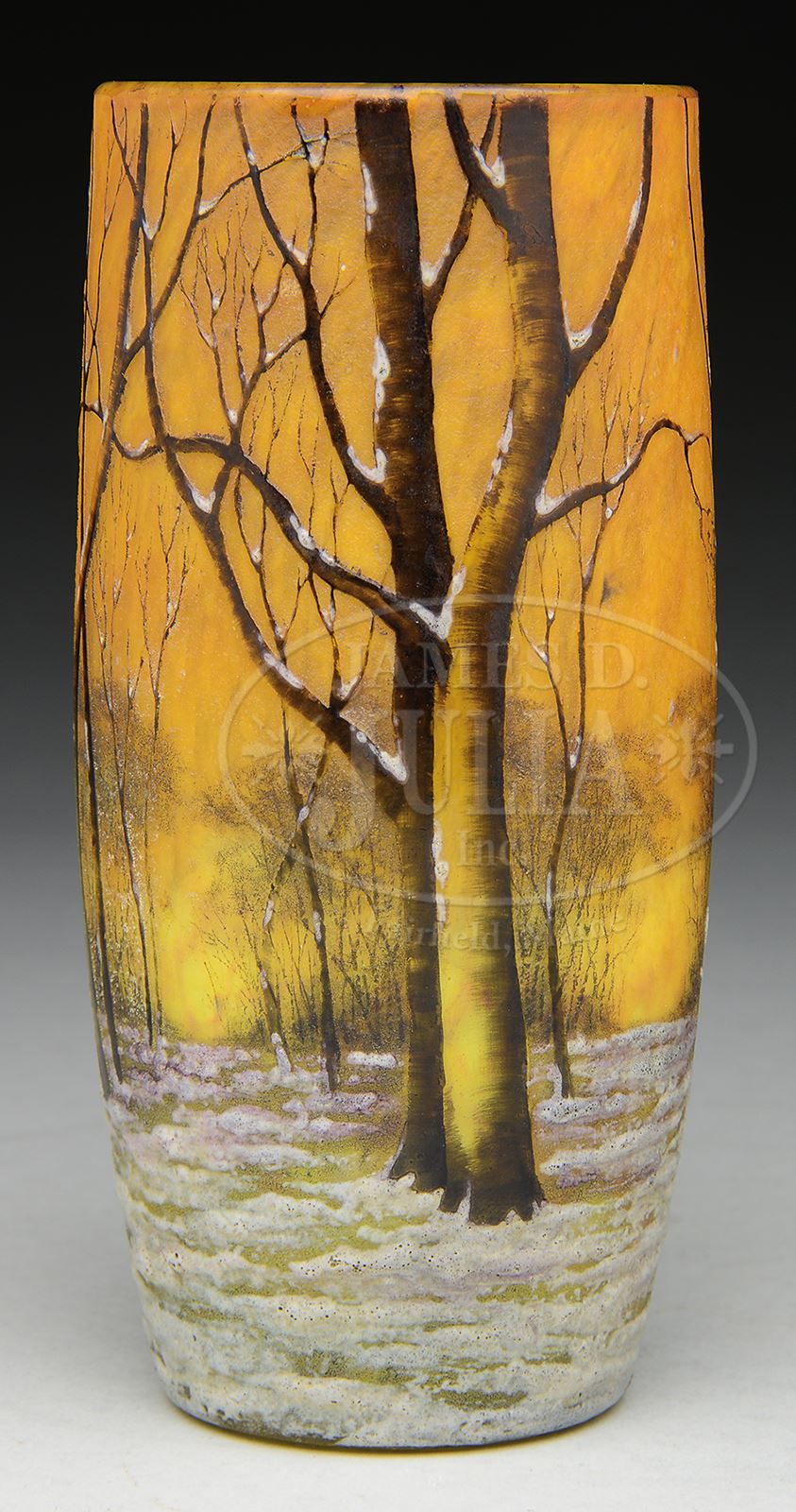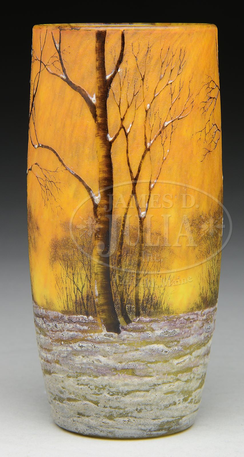 DAUM WINTER SCENE VASE.Daum vase has enameled white snow covered grown with cameo barren trees rising from snow. Each tree is nicely enameled in shades of brown and has small pockets of white snow clinging to tree. Outlines of other barren trees can be seen in distance. All against mottled yellow and orange background. Signed on underside “Daum Nancy” with cross of Lorraine. SIZE: 5″ t. CONDITION: Very good to excellent. 50501-36 (3,000-4,000) – Lot 2491