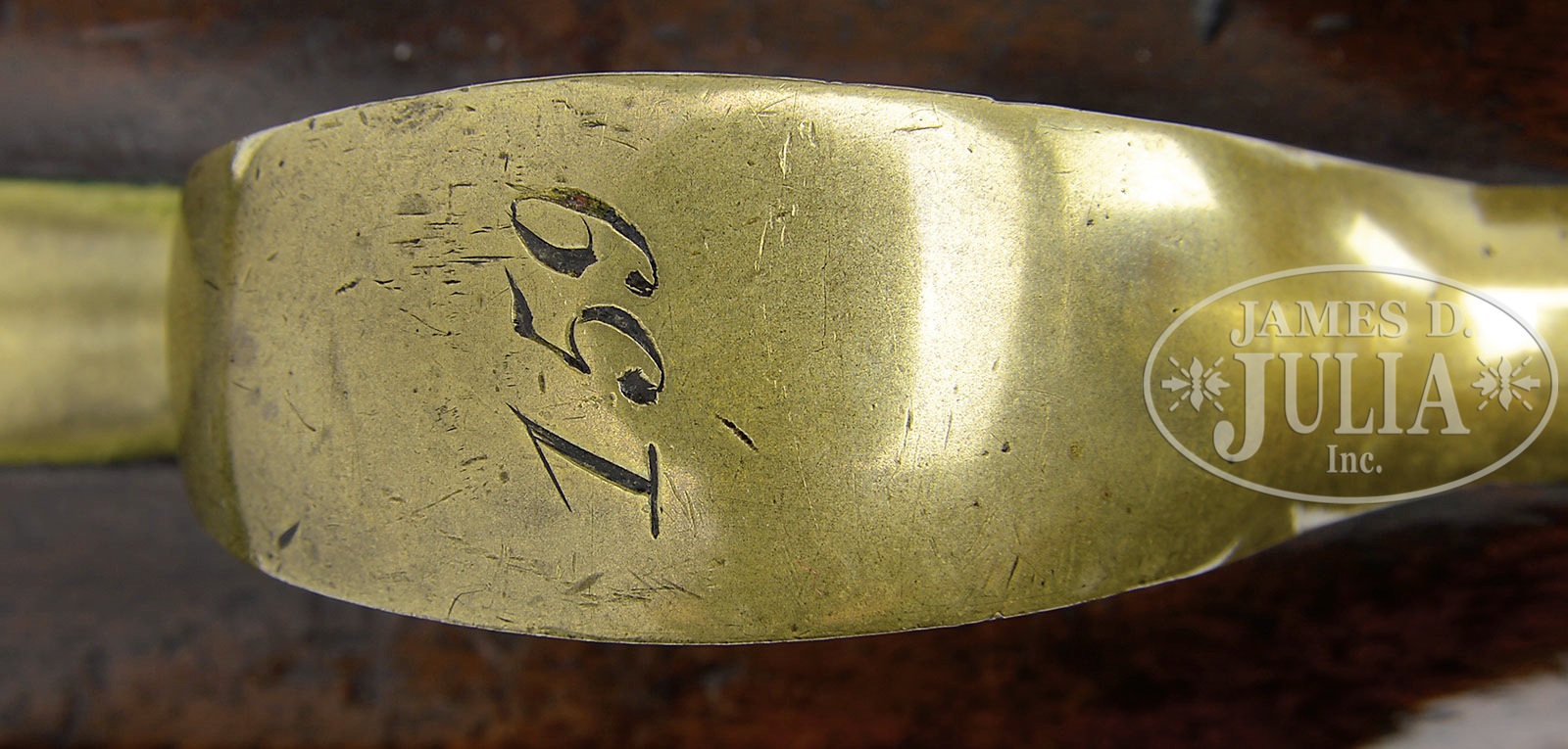 PAIR OF HENRY NOCK FLINTLOCK PISTOLS.SN 159 (on both). Cal. 68. 9″ rnd bbls have an early style turnings at breech end with deep impressed proof marks & “LONDON” engraved on tops. Locks are 5″ long with a short teat at rear and makers name, “H. NOCK” engraved in front of hammer. Lockplates have a dbl inside line border decoration. Pistols have walnut stocks with brass furniture, smooth plain trigger guards with “159” engraved on each pistols trigger guard bow and serpentine shaped flat brass sideplates. The pistols have flat sided grips and rnd uncapped butts. PROVENANCE: Collection of Charles A. Lamb. CONDITION: Fine. Bbls retain a cleaned metal color with scattered light pitting. Wood is sound with usual nicks & dings, retaining most of its orig finish. The hammer screw on one pistol is a replacement. 4-51867 RG113 (2,500-4,500) – Lot 2493