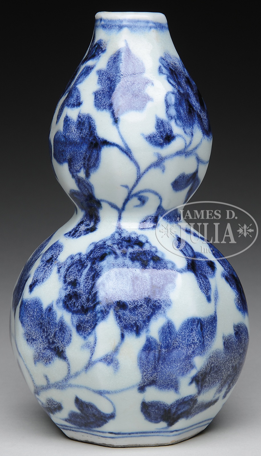 BLUE AND WHITE DOUBLE GOURD VASE.China, 20th c. The vase in the form of lobated double gourd vase, painted with flowers and vines, bottom unglazed. SIZE: 7-1/8″ h CONDITION: Good. 7-75337 (300-500) – Lot 2493
