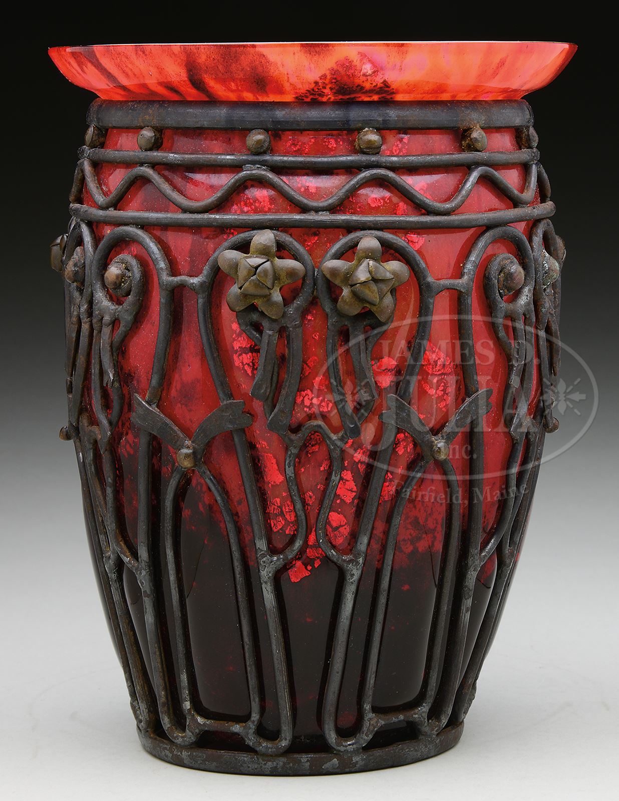 DAUM/MAJORELLE VASE.Daum vase has internally decorated body with heavy foil inclusions against maroon shading to mottled red background. Vase is enclosed within Majorelle iron frame with floral design. Signed on underside with etched signature “Daum Nancy” with Cross of Lorraine and “L. Majorelle”. SIZE: 8-1/4″ t. CONDITION: Very good to excellent. 50501-5 (3,000-4,000) – Lot 2493