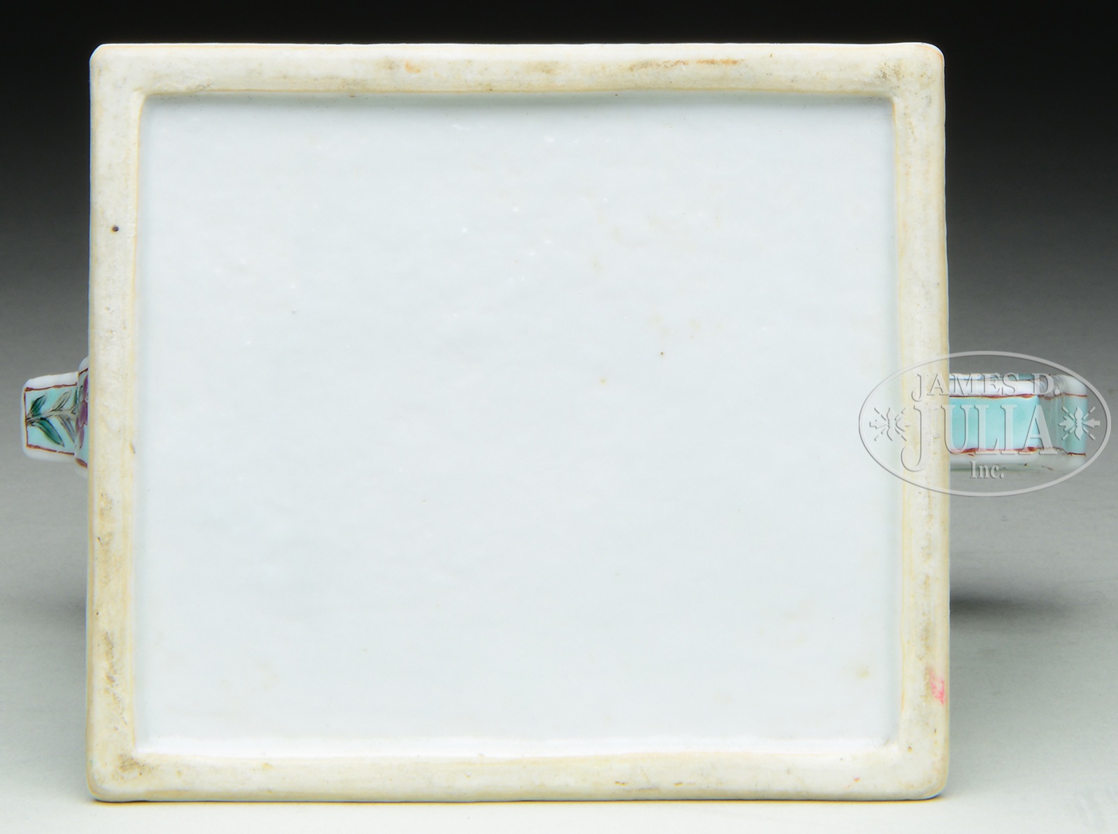 FAMILLE ROSE SQUARE WINE JAR.China, 20th c. The body with expanding square, enameled with flowers in open panel, with bridge shaped finial. SIZE: 4-1/2″ h CONDITION: Good. 7-75401 (300-500) – Lot 2494