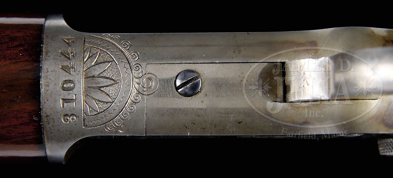 *RARE DELUXE ENGRAVED MARLIN MODEL 1897 LEVER ACTION RIFLE.SN 310444. Cal. 22. Beautiful Model ’97 Marlin with 24” tapered rnd bbl, half magazine, “certifiable antique ivory” bead front sight and semi-buckhorn rear sight. Mounted with very nicely figured, B-style checkered American walnut with straight grip and Marlin hard rubber buttplate. Receiver and forend cap are engraved in #2 style, probably by Conrad Ulrich which consists of the large oval vignette of a running whitetail buck in a very detailed woodland scene on the left side and a squirrel sitting on a limb, also with great detail on the right side. Both vignettes are surrounded by light foliate arabesque patterns and latch-hook borders. Bottom & top of receiver and forend cap are engraved to match with simple zigzag border around the top tang and top flat of receiver. Left side of upper tang is marked with last 3 digits of matching SN. Although buttstock is not numbered, there is little doubt that this is the orig stock to this rifle. This rifle, identified by SN, is pictured on p 238 of Marlin Firearms, Brophy. Accompanied by a Cody Firearms Museum letter which identifies this rifle in Cal. 22 with 24” rnd bbl, half magazine, straight grip, engraved #2 and “Sel & Chked” (Select & Checkered wood), shipped Nov 2, 1904. Also accompanied by a copy of the shipping ledger for this rifle. These rifles are quite rare in deluxe and engraved configuration, but even more rare is the extent of the letter as listed above. Rarely does one find such complete information in the Marlin records. Special Note: This item contains or is made of ivory. Do not bid on this lot unless you have read and agreed to our "Ivory Position Statement" and the "Waiver of Legal and Financial Risk to James D. Julia in regards to your Purchase of an Ivory Object." This information is located in the front section of our catalog. CONDITION: Very fine to extremely fine. Bbl & magazine tube retain about 98% strong orig blue with some dulling over the chamber area. Forend cap retains about 74% thin orig blue. Receiver retains about 60-70% orig case colors, bright in sheltered areas, faded elsewhere. Lever and hammer retain faded case colors. Wood is sound with a few light nicks & scratches and retains most of its outstanding professionally conserved finish. Mechanics are crisp. Brilliant shiny bore. 49121-15 JR IVORY (10,000-15,000) – Lot 2494 Click here to view provenance