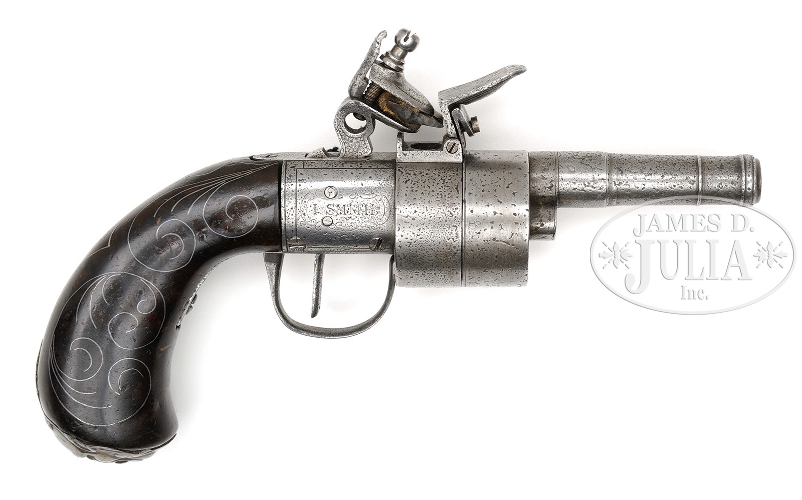 ENGLISH BOXLOCK FLINTLOCK REVOLVER, SIGNED SMITH, LONDON, PARTLY 18TH CENTURY.SN NSN. Interesting revolver made by adapting a genuine 18th century boxlock flintlock pistol. Period of alteration is indeterminate. Butt with silver wire and grotesque mask and silver hallmarked PD (18th century). Mechanism later. Not sold as original. PROVENANCE: Collection of Dr. Douglas Sirkin. CONDITION: Butt is good with silver wire intact and grotesque mask crisp. Revolving mechanism is heavily pitted with acid. Bbl, boxlock mechanism, and trigger guard are also heavily pitted. 4-49915 (1,000-1,500) – Lot 2495