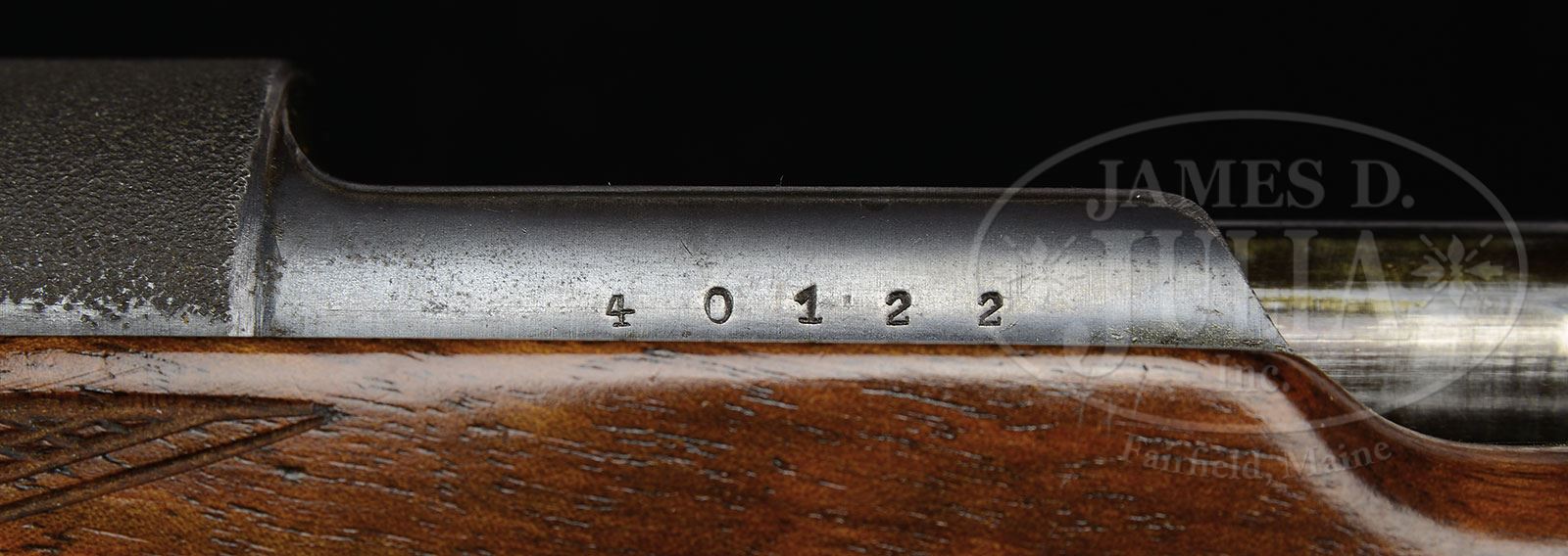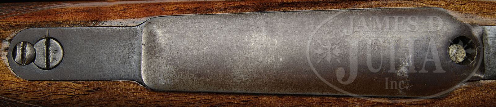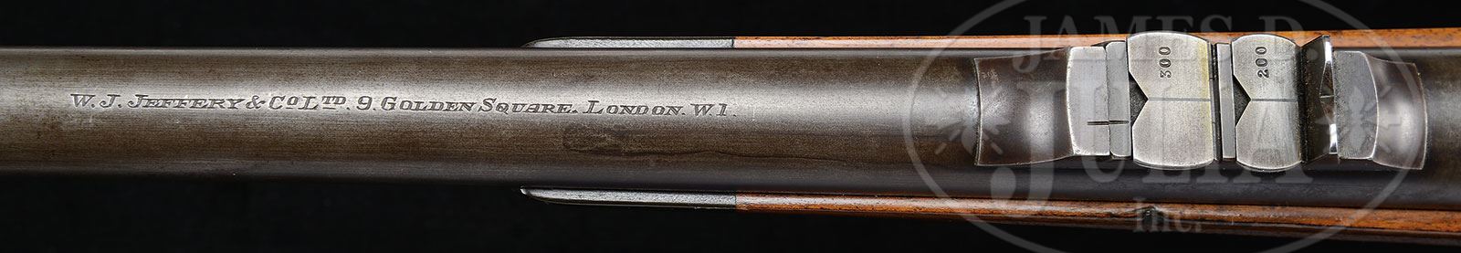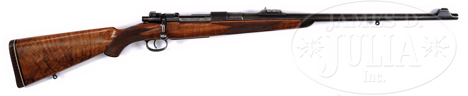 *W. J. JEFFERY THREE SHOT .404 MAUSER RIFLE.SN 40122. (1950) Cal. .404 Jeffery. 24″ Tapered round bbl is engraved “W. J. Jeffery & Co Ltd 9. Golden Square. London. W.1.” on top. Rear portion is fitted with island base holding one standing, two folding leaf express sight marked for 100, 200, and 300 yards. Silver bead is in large island front base. Sling eye is soldered to bottom of bbl. London nitro proofs for 60 grains cordite and 400 grain bullet are on bbl shank. Military Model 98 Mauser action has had receiver ring stippled, and bottom opened up to accept .404 cartridge. Military bolt knob and shroud have been retained, as well as bottom metal with SN engraved on shaped and thinned trigger guard bow. Lightly marbled and attractively flame figured European walnut horn capped pistol grip stock measures 14-1/4″ over brown open sided Pachmayr white line pad. Stock features horn tip, point pattern checkering at forend and grip, with a sling eye on toe line. Drop at heel: approx 3-7/16″, drop at comb: approx 2″. Weight: 8 lbs 1 oz. LOP: 14-1/4″. PROVENANCE: Richard Schreiber Collection. CONDITION: Good. Metal parts retain most of their orig finish with considerable silvering from normal carrying and use. Stock retains nearly all of a hand rubbed oil finish over numerous marks and with a number of subsequent marks, checkering re-cut. Pad is new. Bore is very fine with strong rifling throughout, and lightly frosted. Action is smooth. A good working rifle in what many consider to be the best all around African cartridge. 4-45903 (4,000-6,000) – Lot 2495 Click here to view provenance