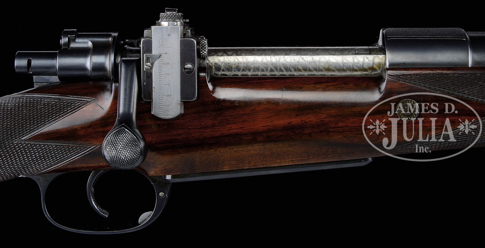 *GRIFFIN & HOWE MAGNUM MAUSER DANGEROUS GAME RIFLE.SN 1434. Cal. .416 Rigby. Mauser no. 93840. 26″ Tapered, round bbl with integral matted quarter rib, has banded-on sling eye and ramped front sight base having longitudinally dovetailed white bead, and knurled slide-on cover. Top of bbl is engraved “No 1434 Griffin & Howe Inc New York”. Left rear of bbl is engraved with caliber. Magnum Mauser square bridge action is mounted with Lyman 48 receiver sight, portion of bridge filed to accept sight staff. Bolt with two panel checkered pear-shaped knob damascened on body and extractor, is fitted with long cocking piece and flag safety, which is silver inlaid “SAFE” and “READY”, orig two stage trigger has blade checkered. Orig drop box bottom metal specially made for the 416 Rigby cartridge, has hinged floorplate with button release at front of trigger guard bow. Follower is engine turned. Mauser SN is stamped behind recoil lug on bottom of action and at rear of magazine. (Rifle disassembled to see) Bolt is stamped with last 4 digits, all other parts with last 2 digits (40). Dense, broadly streaked, and lightly figured French walnut, full steel capped pistol grip stock measures 14″ over Silver type pad. Checkering at grip and forend is in classic point pattern with mullered borders; forend checkering wrapping completely around stock. Stock also features classic G & H style beaded cheekpiece, horn forend tip, engraved recoil bolt, and with slightly fluted transitions from grip to body of stock around action. A round swivel stud and gold oval engraved “JEP” are on toe line. Included is a woven leather sling in Supergrade type swivels. Drop at heel: approx 2-5/8″, drop at comb: approx 1-5/8″. Weight: 9 lbs. 14 oz. LOP: 14″. PROVENANCE: Factory letter giving history of rifle, as evidenced by copies of inventory book pages, and stating that it was received into A & F inventory in 1938 with specifications, and was most recently part of collection of Joseph E. Prather, former president and CEO of Griffin & Howe Inc. CONDITION: Excellent. Metal parts retain nearly all of what appears to be their orig satin blue. Stock retains nearly all of its orig oil finish augmented with oil to a gloss. G&H gunsmith reveals bbl channel modified with added wood fillet as part of orig manufacturing. Checkering is slightly worn and dark. 1″ Crack in toe of stock has professionally repair. Bore is excellent with sharp rifling throughout. Pad is a proper replacement. Sling is fine. A scarce and desirable American classic (Michael Petrov had 7 .416’s in his G & H database) in one of the most highly regarded general purpose African calibers of all time. 49940-15 MGM57 (13,000-18,000) – Lot 2495 Click here to view provenance