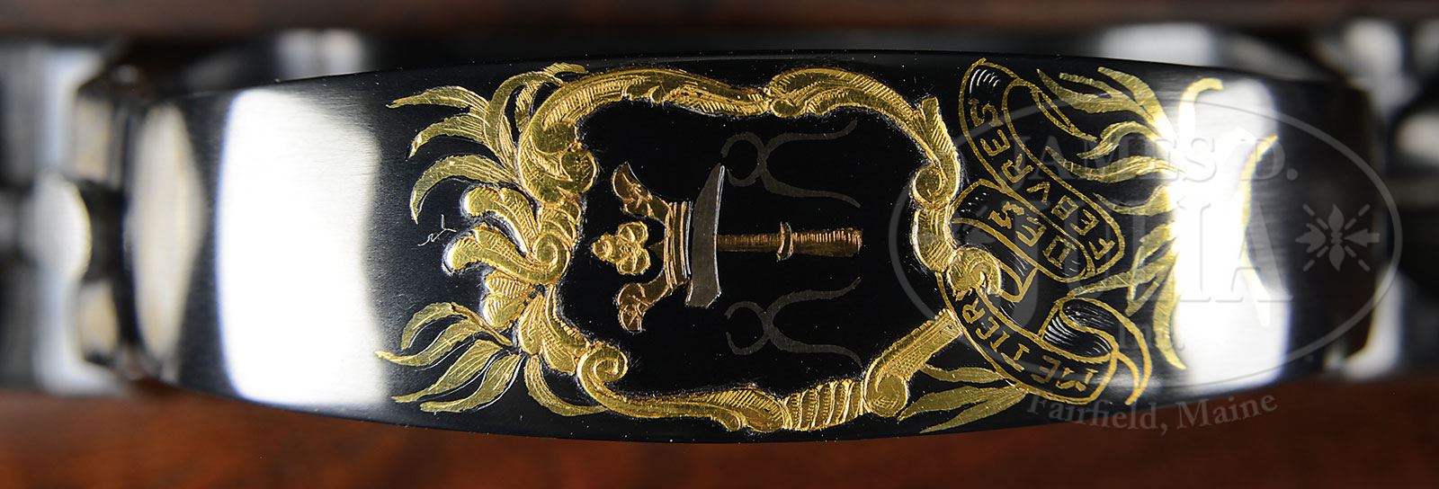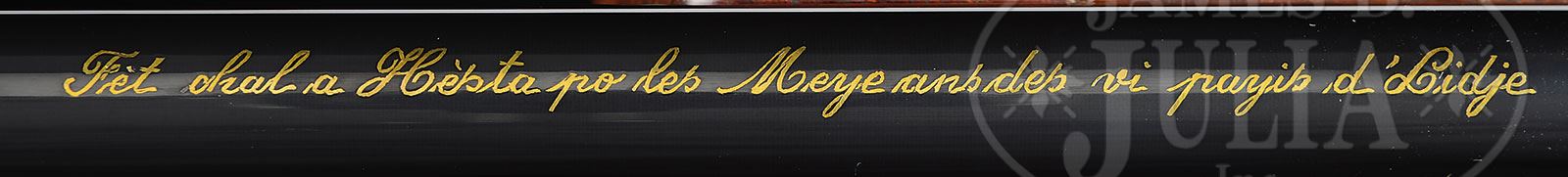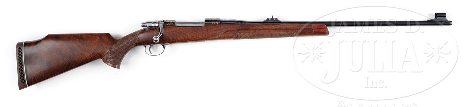 *FN MAUSER COMMEMORATING ONE THOUSAND YEAR FOUNDING OF LIEGE.SN 53227. Cal. 7 X 64 mm. 26″ Lightweight tapered sporter bbl is fitted with island base mounting one standing, two folding leaf rear sight, and small ramp mounting silver bead front. Flush gold inlaid attribution is on top. Rear of bbl has silver and gold inlay of Tower of Liege between “L” and “G” (famous Liege proof mark). Receiver ring shows map of province with cities. “1000” is gold inlaid within laurel leaves. Sidewall is inlaid “980 Liege 1980″. Bridge has multi colored gold inlay of the crest of the Prince of Liege. Further commemorative crests and shields are gold inlaid in exquisite detail on floorplate and trigger guard bow. This fine work is by noted master engraver Jean H. Diet, whose signature is at rear of floorplate. Beautifully stump figured French walnut stock measures 14-1/4″ over Browning open sided pad, and features swept Monte Carlo right hand cheekpiece, grooved top forend, rosewood grip cap and forend tip. There is basket weave checkering at grip and forend flanked by relief carved acanthus scroll. Drop at heel: approx 2-3/4″, drop at comb: approx 1-3/4″. Weight: 7 lbs. 11 oz. LOP: 14-1/4”. CONDITION: Excellent. Appears unfired since proof, with only a few minor handling marks on wood and metal. 4-53601 MGM212 (10,000-15,000) – Lot 2497