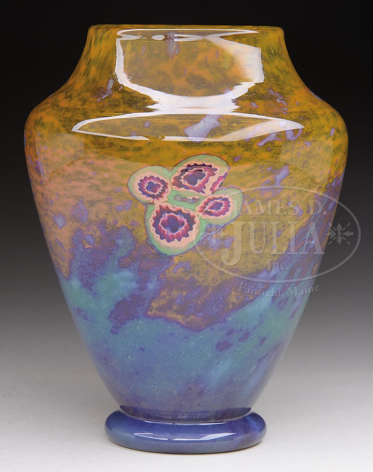 DAUM INTERNALLY DECORATED VASE.Daum vase has flaring body with squared shoulder and is internally decorated with mottled blue and purple surrounding bottom half of vase giving way to mottled orange at top. Vase is further decorated with three clusters of millefiori canes inlaid in glass. Signed on underside with etched signature “Daum Nancy” with cross of Lorraine. SIZE: 7-1/4″ t. CONDITION: Very good to excellent. 50380-40 (10,000-15,000) – Lot 2497
