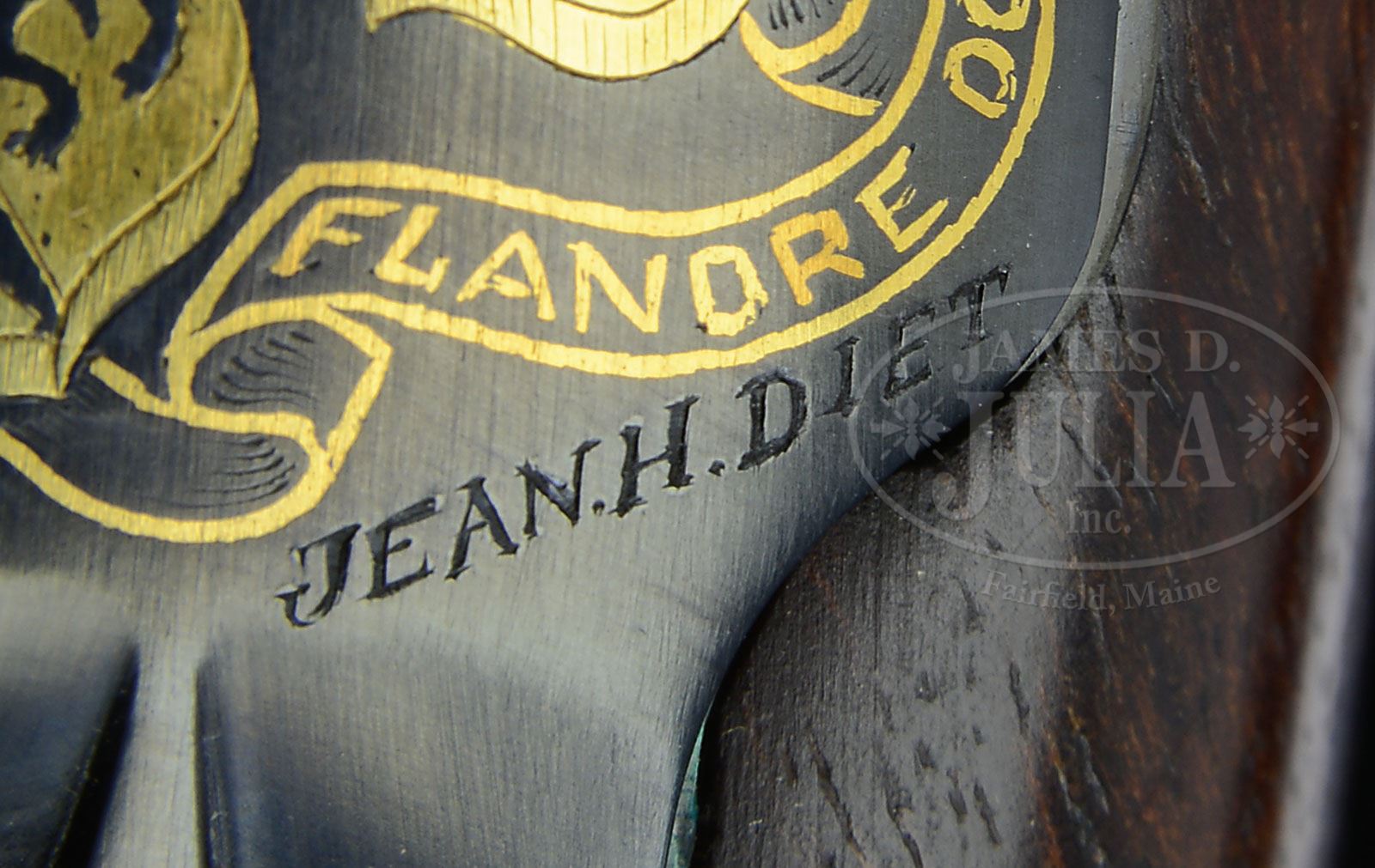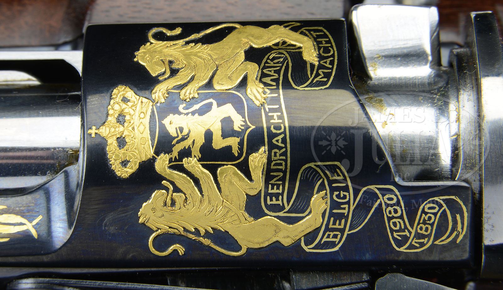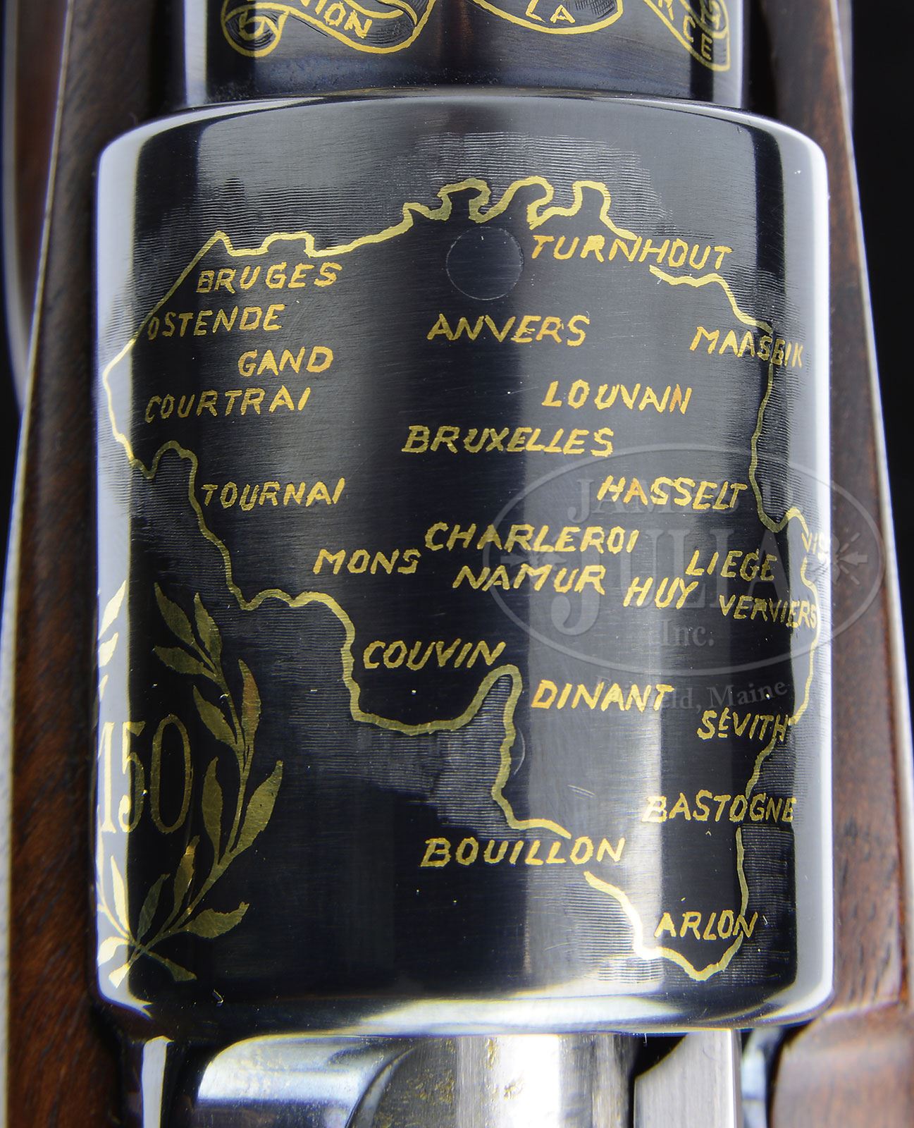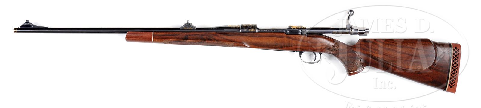 SN 99. Cal. 7 x 64 mm. This finely crafted rifle, most likely unique, has 24″ lightweight sporter bbl fitted with stippled island base for one standing leaf express rear sight, and ramp base for silver bead front sight. Late style FN action with second cut through receiver pressure ring, has hinged bottom metal with release in trigger guard bow. Bbl and action have multi colored gold inlaid wording, heraldic devices, maps, and province shields relevant to Belgian history. Top of bbl is engraved “Ateliers Liegeois Artisans Reunis”. (ALAR which is engraved on right side of bbl and receiver ring in front of SN.) Inlaid gold script on bbl announces that this commemorates the Independence of Belgium. Belgian crest is at rear portion of bbl. Gold inlaid map of Belgium with city names is on receiver ring, along with “150” within laurel leaves. Another raised gold inlaid crest is on bridge. “B” is between foliage on top of left sidewall. Side of sidewall is inlaid in white gold “1830 BELGIQUE 1980”. Floorplate has nine flush multi-colored gold inlays of province crests. Trigger guard bow lists Belgian kings and their reigns. It appears that all of this exceptionally well done engraving and inlay is by master engraver Jean H. Diet, whose signature appears on right side of receiver ring and rear portion of floorplate. Finely marbled and nicely figured French walnut stock measures 14-1/2″ over open sided FN pad, and features swept Monte Carlo shadow line cheekpiece, unusual shaped grooved top forend, and rosewood grip cap and forend tip. Checkering at grip and forend has beaded borders with relief acanthus carved ends. A man’s “head” in gold is on top of grip cap. Drop at heel: approx 2-5/8″, drop at comb: approx 2″. Weight: 7 lbs. 11 oz. LOP: 14-1/2″. CONDITION: Excellent, essentially as new. Appears unfired since proof, with only a few minor handling marks on wood and metal. 4-53602 MGM211 (10,000-15,000) – Lot 2498