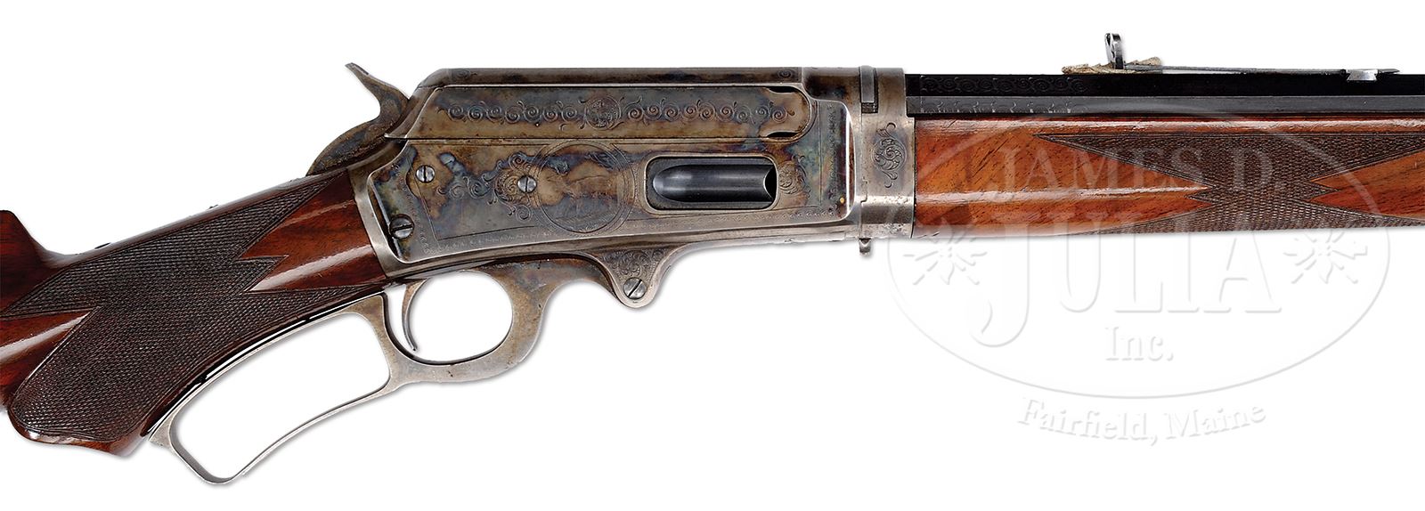VERY RARE SPECIAL ORDER MARLIN MODEL 1895 DELUXE ENGRAVED TAKEDOWN LEVER ACTION RIFLE.SN 140978. Cal. 40-65. Outstanding deluxe rifle with 28″ special order oct to rnd bbl (standard was 26″), half magazine, takedown, German silver Rocky Mountain front sight & semi-buckhorn rear sight. Mounted with very highly figured, B-style checkered American walnut with serpentine grip and Ballard style hard rubber buttplate. Receiver is beautifully engraved in #2 style by Conrad Ulrich with the oval vignette of a hound chasing a stag through a woodland scene on the left side and a standing whitetail buck on right side. Both sides have foliate arabesque patterns surrounded by various border patterns. Light matching patterns extend over the top & bottom of the receiver, top tang, takedown ring & forend cap. The 5 exposed flats of the bbl are lightly engraved about 2″ forward of the frame. These early big frame Marlins are rarely ever found with high orig finish, usually having been subjected to hard service in the North woods, Great Plains & Rocky Mountain area. They were equally popular in the Northwest Territories and Alaska for big game hunting. Given the incredible orig condition of this rifle it can be speculated with some certainty that it likely belonged to someone of importance who used it very little. CONDITION: Extremely fine plus, all matching. Bbl & magazine tube retain about 99% strong orig blue with only very faint muzzle end wear and a couple of small nicks on the magazine tube. Receiver retains brilliant case colors on both sides & top with the bottom, at the carry point moderately faded. Hammer retains bright case colors & the lever strong case colors in sheltered areas, turned silver on outer faces. Forend cap is mostly turned silver. Buttstock & buttplate have a tiny dressed chip on the toe, otherwise wood is sound with a few very minor nicks & scratches and overall retains 98-99% strong orig varnish. Mechanics are crisp. Bright shiny bore, appears to be new and unfired with orig grease and a dead ladybug on the bolt face. 49144-1 JR (35,000-50,000) – Lot 2498