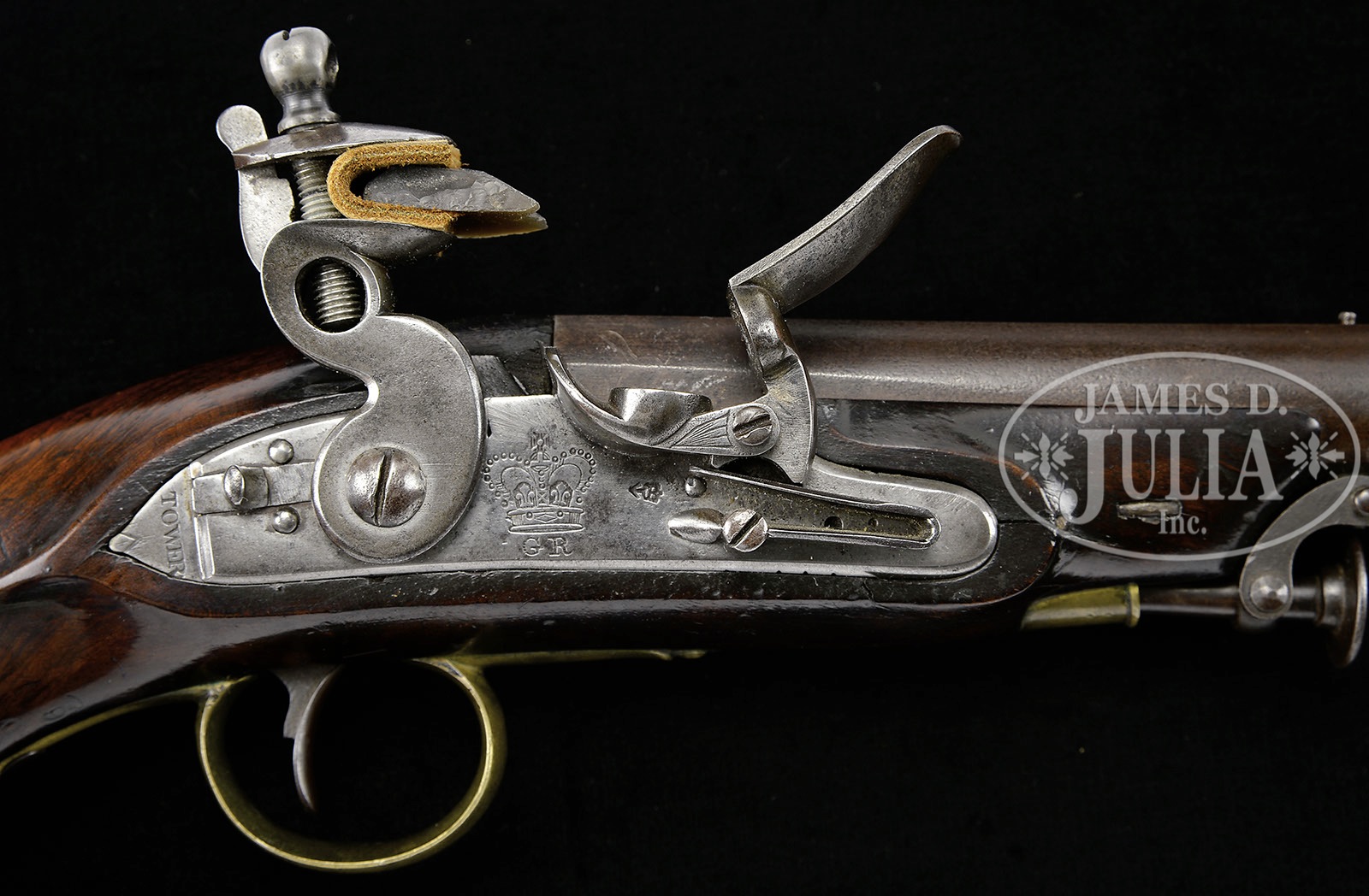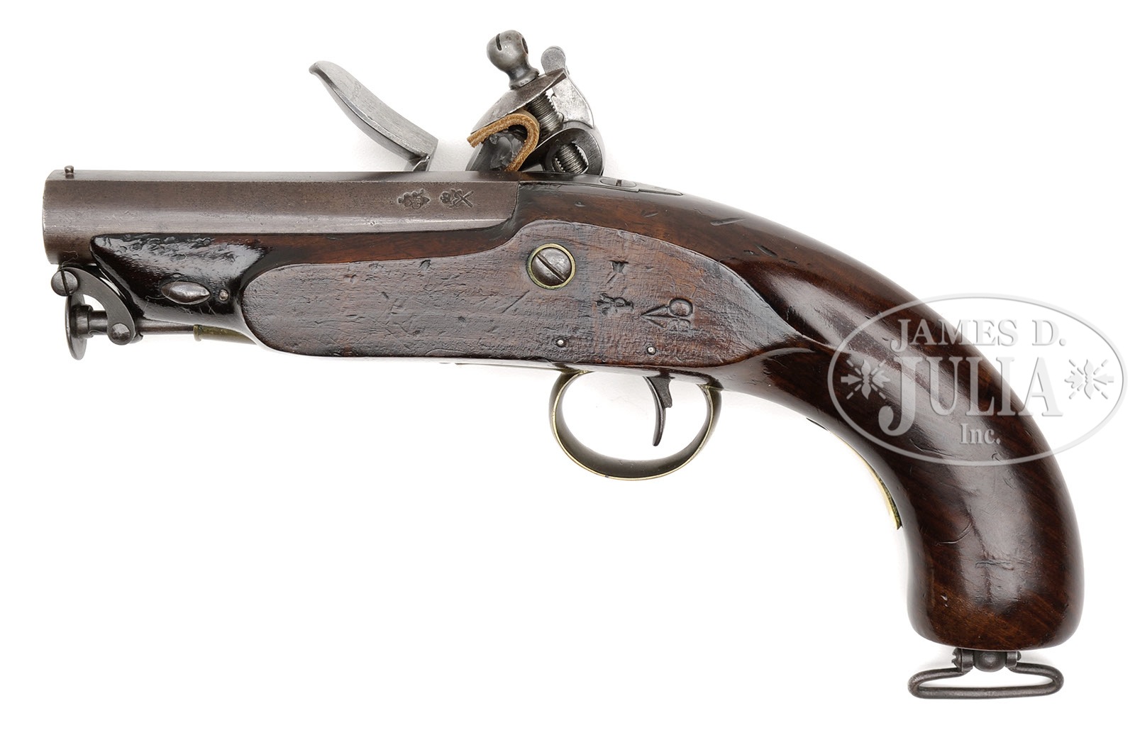 BRITISH FLINT LOCK MARTIAL COAST GUARD PISTOL.SN NSN. Early 19th century 4-1/2″ about 66 cal smooth bore short regulation naval on coast guard flintlock pistol is a scarcely encountered gun. This example utilizes captive swivel ramrod, is brass mounted with sling swivel applied to butt. Lock is marked “TOWER” on tail with crown and “GR” cypher forward of hammer. Gun exhibits typical proofs and inspection marks including broad arrow acceptance on both lock and stock. This gun is in beautiful orig condition and doubt there are many examples this nice this side of the pond. PROVENANCE: Collection of Charles A. Lamb. CONDITION: Fine overall. Bbl is gray/plum with pitting and smooth bore; lock is bright/gray with crisp markings; stock is sound and solid with two cracks forward of hammer raising slightly about a 1″ section of wood; stock retains most of its orig oiled finish with sharp edges and crisp inspection marks. Gun functions well including safety though it is tight. 4-51872 JS208 (4,000-6,000) – Lot 2500