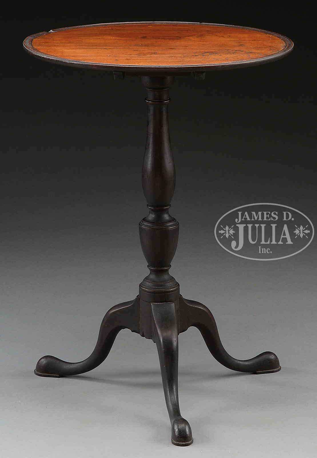 MAHOGANY DISH TOP QUEEN ANNE CANDLESTAND.Circa 1775, English or American. With baluster and urn turned shaft tri-partite base with carved cabriole legs having pad feet with under pads. Original age darkened surface. SIZE: 28″ t x 20″ dia. PROVENANCE: Estate of Siro R. Toffolon of Old Lyme, CT. CONDITION: Very good condition, angular chip in dish top, possibly with one repair to an ankle. 49476-38 (2,000-2,500) – Lot 2500