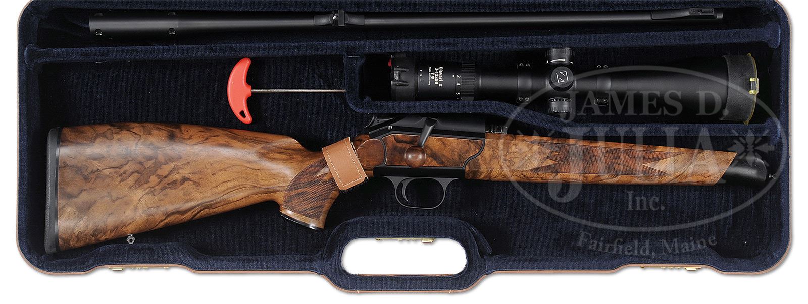 *BLASER R93 WITH EXCEPTIONAL WOOD, ZEISS SCOPE AND CASE.SN 9/129045. Cal. .270 WSM. 25-1/2″ Lightweight sporter bbl, fitted with one standing U-notch rear sight, and front ramp with partridge type black bead, is marked with 2005 German proofs and other nomenclature. Bbl has cuts for Blaser saddle type scope base. Unique Blaser straight pull bolt action is finished in matte black, and has large push button safety/ cocking slide. This rifle corresponds most closely to the current R-93 Attache model with exceptionally fine European walnut, wood side panels, wood bolt knob, and ebony forend tip. It is not fitted with fluted bbl. Wood on this rifle features European styling including hog-backed comb, Tyrolean fluted right hand cheekpiece, and right hand palm swell. It is of exceptional light colored European walnut with dark marbling and fine figure. Side panels and forend match well. Drop at heel: approx 2-3/8″, drop at comb: approx 2″. Weight without scope: 7 lbs 2 oz. LOP: 14-1/2″. Zeiss Diavari Z 3-12 X 56 T scope with heavy duplex reticle is in Blaser saddle mount and rings. Butler Creek storm covers are fitted. Black ABS Blaser case with tan leather trim and three combination locks. Case is lined in royal blue velvet, and contains takedown tool, and has space for scope. CONDITION: Excellent. Metal parts retain essentially all of their fine orig blue and black finish. Stocks have a few minor marks and a couple of deeper scratches. Bore is excellent. Mechanically crisp. Scope and mount are excellent, brilliant optics. Case is excellent. This attractive rifle and scope combo would presently retail far in excess of $8000.00. 4-55443 (4,000-6,000) – Lot 2504