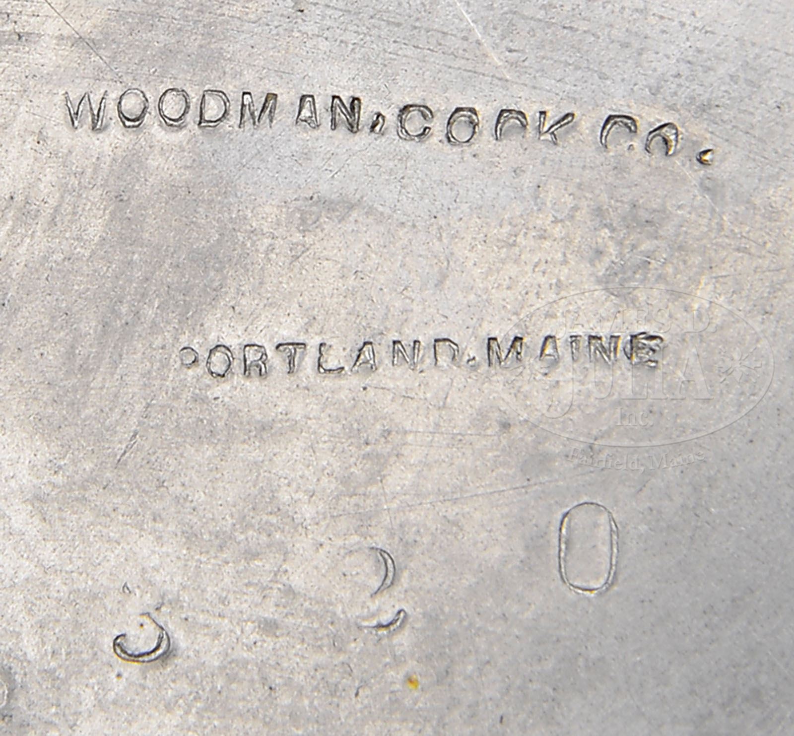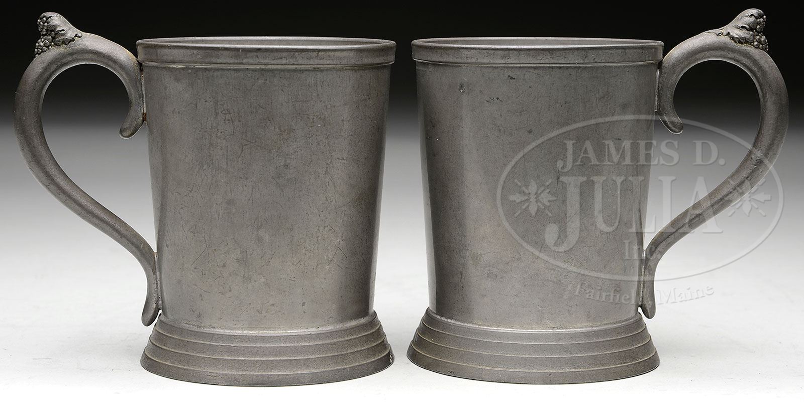 TWO PEWTER MUGS BY WOODMAN & COOK COMPANY OF PORTLAND, MAINE. Late 19th century. Mugs with handles decorated with grapes, having a stepped base. SIZE: 4-1/2″ t. CONDITION: Very good, nice old patina. 9-90938 (500-1,000)
