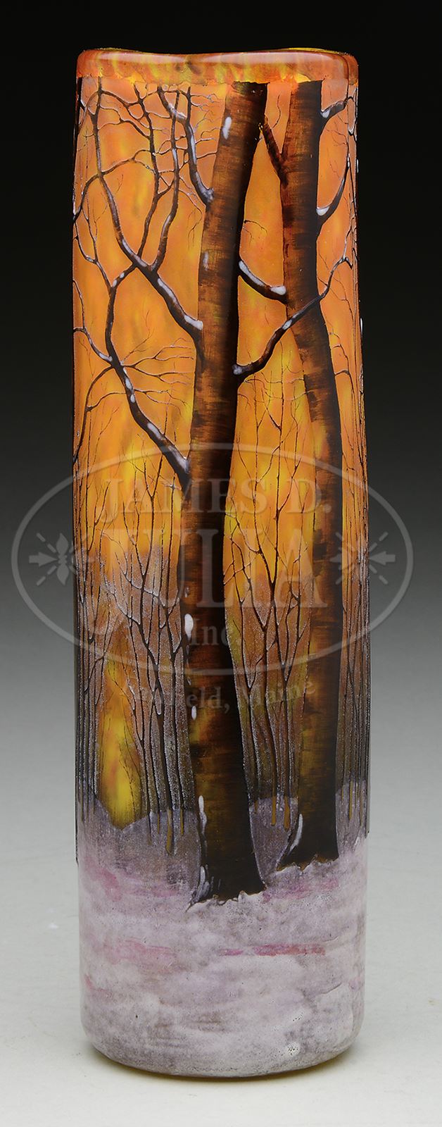 DAUM WINTER SCENE VASE.Daum cylindrical vase has pinched lip and is decorated with cameo barren trees rising from enameled snow covered ground against mottled yellow and orange sky. Trees are beautifully enameled in shades of brown depicting bark with areas of white enameled snow clinging to trees. Signed on underside with faint etched signature “Daum Nancy” with cross of Lorraine. SIZE: 8-1/4″ t. CONDITION: Very good to excellent. 50501-31 (5,000-7,000) – Lot 2508