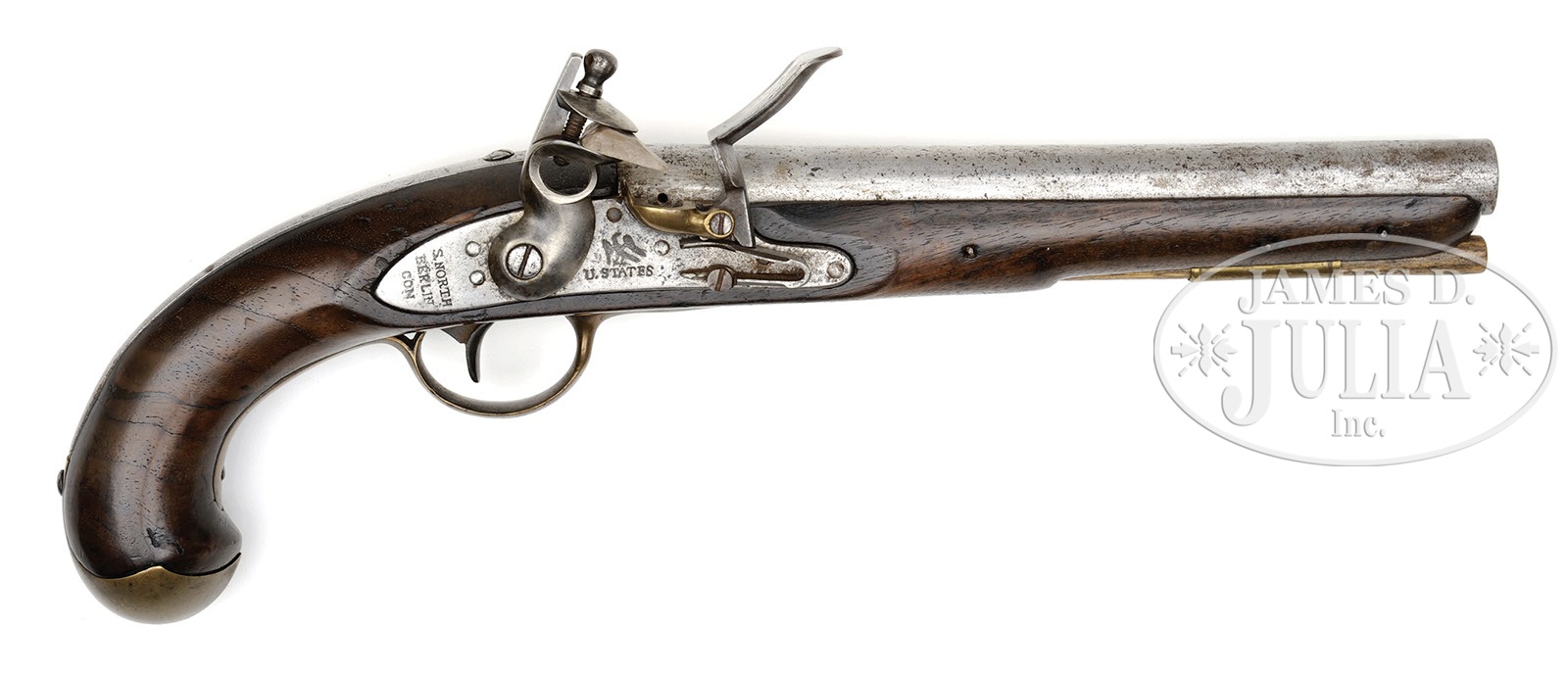 S. NORTH 1808 NAVY CONTRACT PISTOL.SN NSN. Cal. 68. x 10″ rnd unmarked iron bbl and is reconverted back to flint. Lock marked with spread winged eagle facing muzzle over “U.STATES.” reading vertically in three lines behind the cock. “S. NORTH/BERLIN/CON.”. Inside of lock is marked with a “7” on the lock plate, “=” on the main spring screw, both bridle screws, the sear spring screw but not externally on the cock screw, battery spring and battery screw confirming this gun is a reconversion. Walnut stock is unmarked. Opposite the lock is 7-1/4″ long belt hook. Ramrod is 9-1/2″ and old however not orig to this gun. PROVENANCE: Collection of Dr. Douglas Sirkin. CONDITION: All the ironwork is in very good to excellent condition only having minor pitting on bbl and lock. All brass furniture has nice patina. Stock is in very good condition. Handle was completely cracked through 2″ above buttcap, but has been solidly repaired, not affecting overall soundness. Difficult to find today as only 2,000 were delivered. 4-49920 PAS56 (5,000-8,000) – Lot 2511