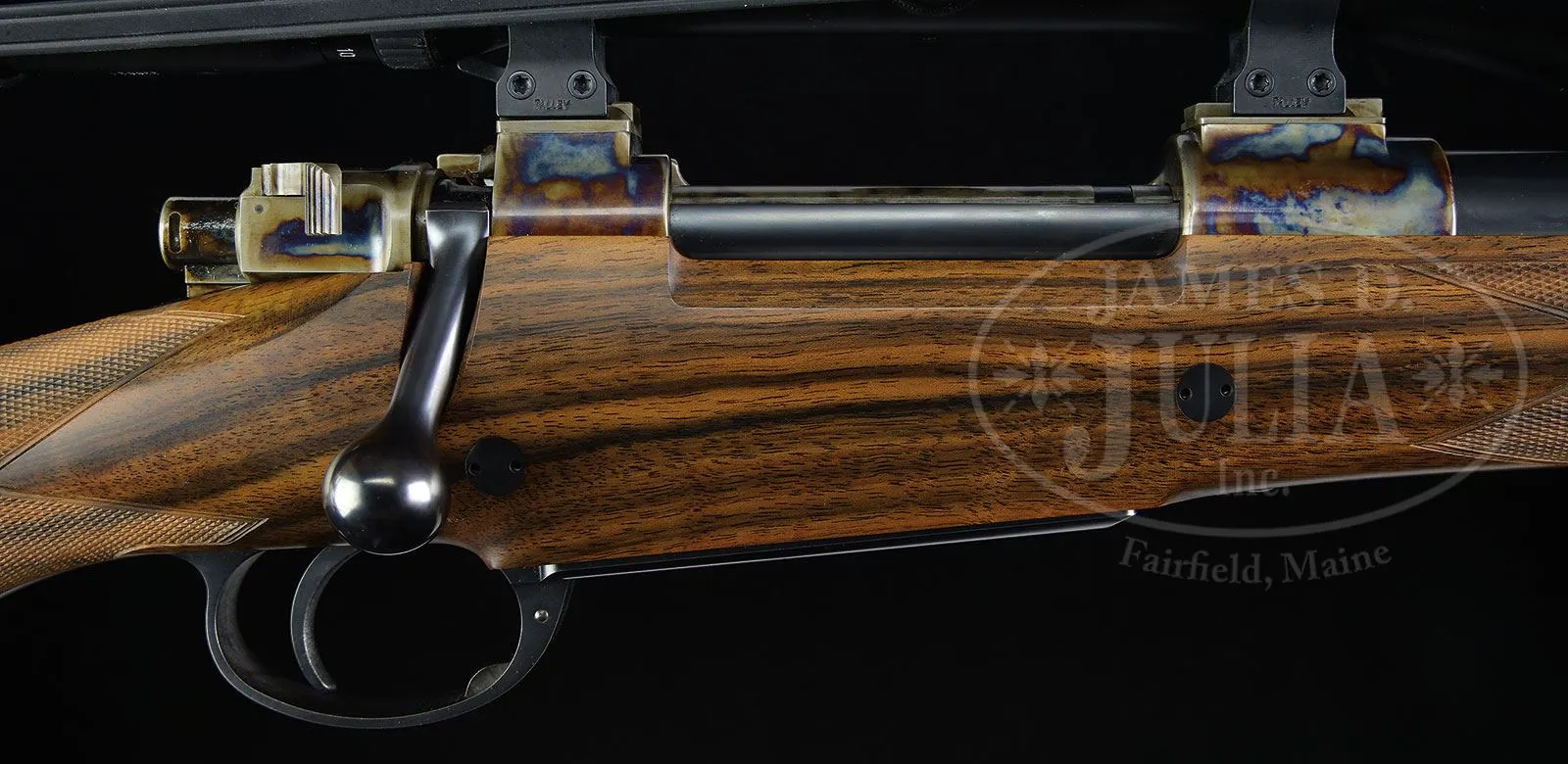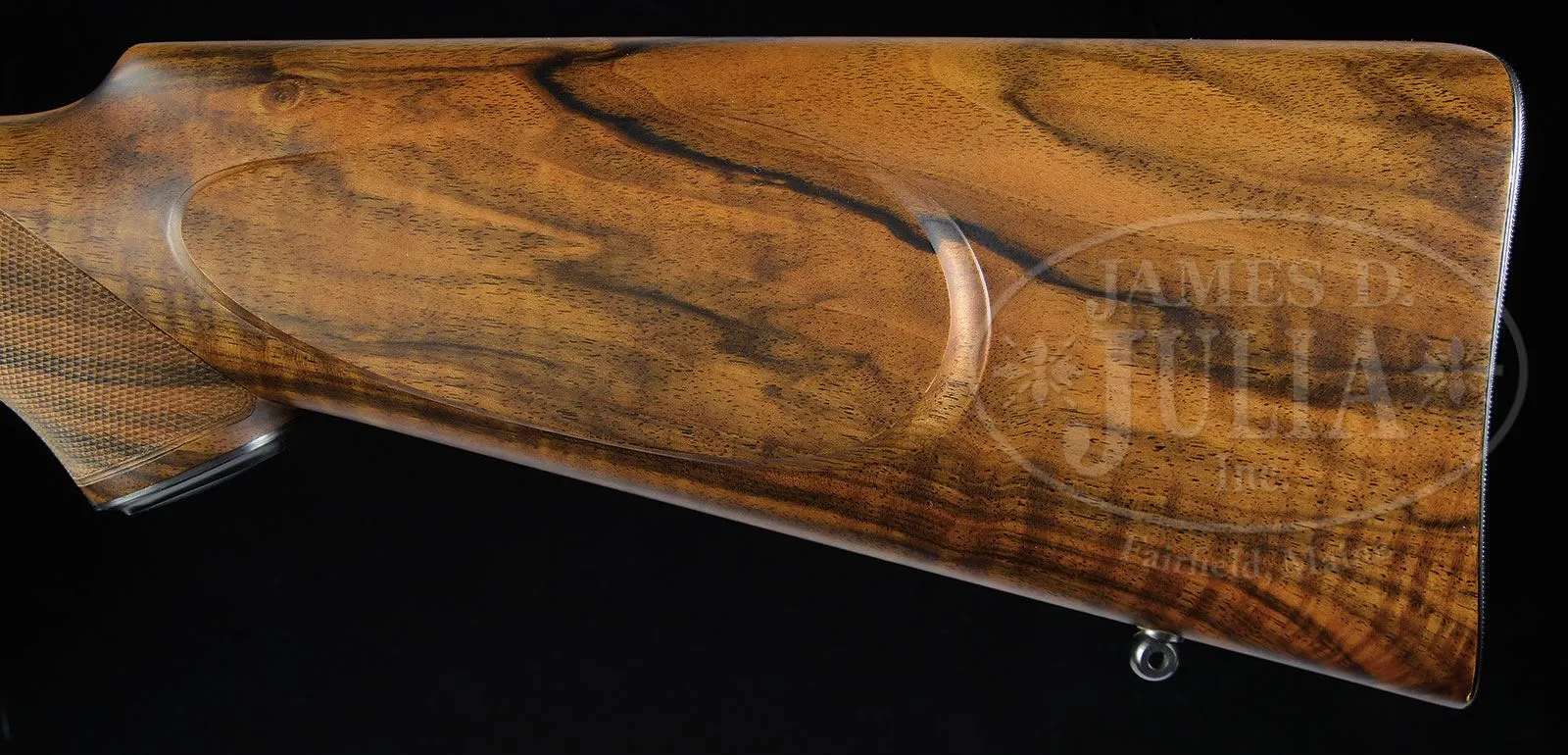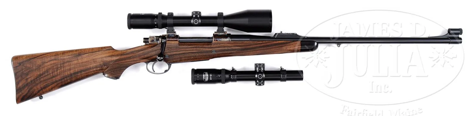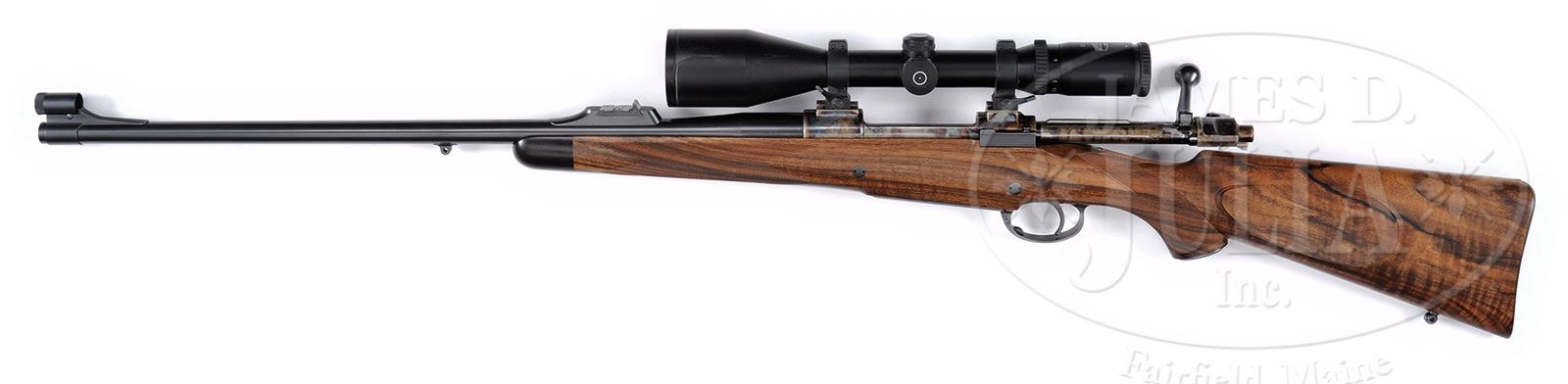 *EXCEPTIONALLY FINE JERRY FISHER CUSTOM HARTMANN & WEISS MAGNUM MAUSER WITH TWO SCHMIDT & BENDER SCOPES.SN 9146. (In cocking piece channel and on bottom of receiver ring) Cal. .375 H&H. This fine dangerous game rifle built on a double square solid side wall magnum action by Hartmann & Weiss, is fitted with 25″ medium sporter weight tapered round bbl engraved “JERRY FISHER BIGFORK, MONTANA” on top. Bbl is fitted with nicely shaped island base for one standing, two folding leaf U-notch rear sight with gold lines marked for 100, 250, and 300 yards. A banded-on front ramp with push-button removable knurled sight protector holds gold bead with flip-up moon bead. A sling eye is soldered to bottom of bbl. Case hardened magnum action stamped “Hartmann & Weiss Mauser” on bottom of receiver ring (removed from stock) has had case hardened Talley bases affixed to action squares. Bolt handle and extractor are blued. Bolt shroud incorporates Model 70 type three position safety. Trigger is single stage standard Mauser type. Drop box bottom metal has hinged floorplate retained by button in trigger guard bow. Beautifully marbled and nicely fiddle figured Turkish walnut steel capped pistol grip stock stamped “Jerry Fisher” in bbl channel, measures 14-1/4″ over Neidner type checkered steel buttplate, and features cleanly sculpted classic styling, including small shadow line right hand cheekpiece, sharp line transitions from grip to top of action, raised wood around bolt stop, and chamfered ejection port. Other features include two reinforcing bolts, ebony forend tip with widows peak on bottom, and exceptionally well cut point pattern checkering with mullered borders at grip and forend. A sling eye is on toe line. Drop at heel: approx 2-9/16″, drop at comb: approx 1-5/8″. Weight without scope: 9 lbs 4 oz. LOP: 14-1/4″. Rifle is accompanied by two Schmidt & Bender scopes, both 30mm in Talley rings. One is a 2.5 – 10 X 56 with crosshair dot and three post reticle, the other is a 1.5 – 4 X 20 with picket post and crosshair reticle. Both have rubber storm covers. The orig box is included for the 1.5-4X scope. CONDITION: Excellent, essentially as new, with only the faintest of handling marks on wood or metal. Bore is excellent. Action is smooth. Scopes are excellent, optics brilliant. A beautiful classic rifle. 4-48081 (8,500-12,500) – Lot 2512