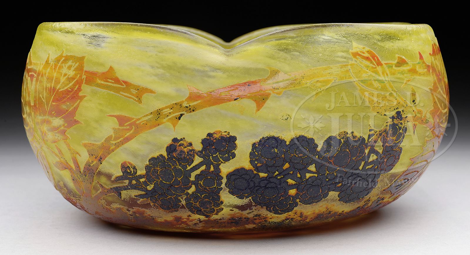 DAUM NANCY VITRIFIED BOWL.Quadrefoil shaped bowl is decorated with a vitrified berry and leaf pattern in vibrant purples with orange and yellow on a nicely mottled yellow and frost ground receding to other autumnal colors. Signed in cameo “Daum Nancy” with cross of Lorraine to side of bowl. SIZE: 3-1/2″ x 8″. CONDITION: Very good to excellent. 50380-12 (2,000-3,000) – Lot 2512