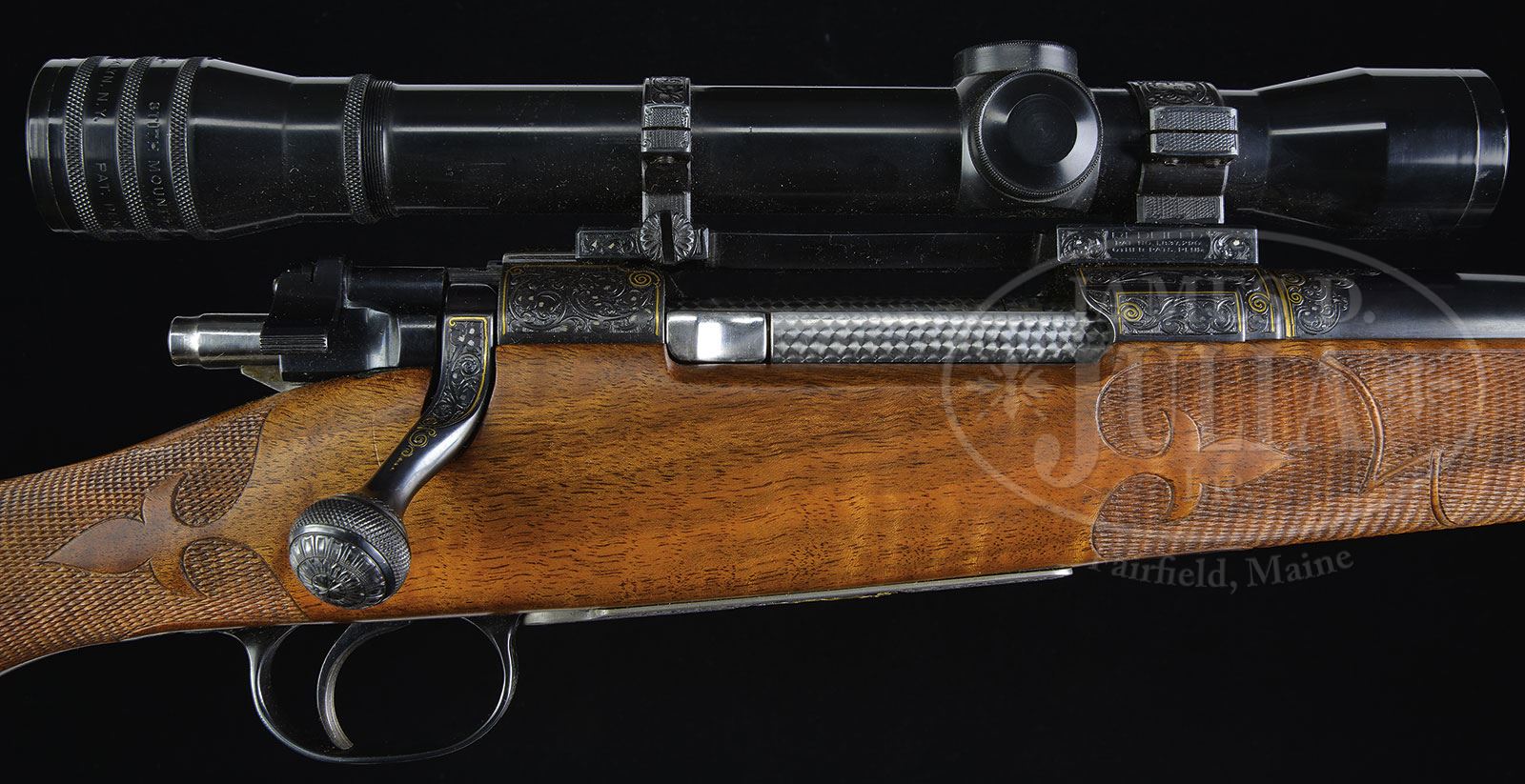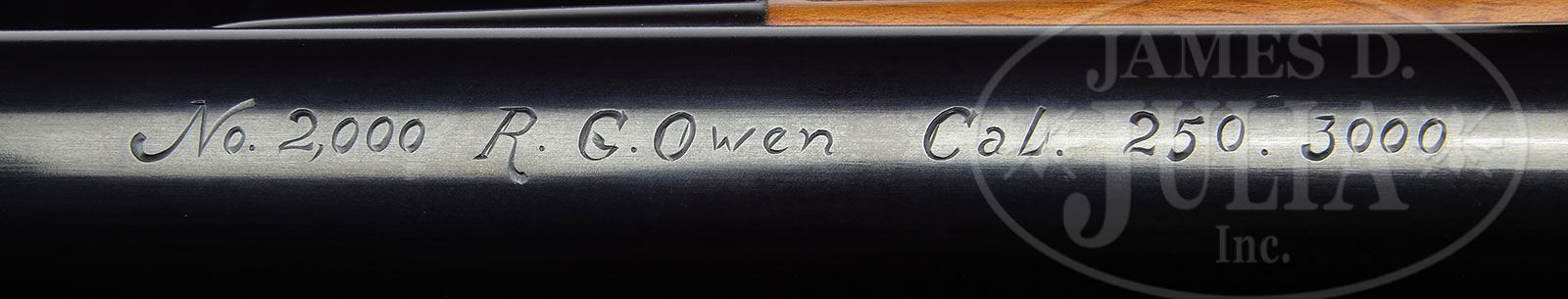 *CUSTOM SPRINGFIELD 1903 SHORT RIFLE MARKED R. G. OWEN WITH ENGRAVING AND GOLD INLAY BY OBILTSCHNIG WITH SCOPE.SN NSN. Cal. 250-3000. 20-1/2″ Tapered, round bbl is marked “No 2000 R. G. Owen Cal. 250.3000” on top. Bbl is fitted with sweated-on streamlined front ramp, and front sight with bronze bead. Springfield action is fitted with Redfield one piece base, has had tang slimmed, and gas port added to left side of receiver ring. Engine turned bolt has had pear shaped handle with checkered knob added. Bolt root is gold inlaid and engraved with scrolled acanthus. Bolt shroud is fitted with Buehler safety. Cocking piece knob is removed. Action and rear portion of bbl are gold wire inlaid with scrolled terminations as border to well cut and shaded large scrolling shaded acanthus, highlights polished to add depth. This fine engraving extends to scope base and rings. Bottom metal is engraved with exceptionally well done acanthus matching that of action. Gold wire borders with scrolled terminations frame central motif on floorplate of relief gold inlaid pronghorn in engraved scrublands. Trigger guard bow, with more scroll, is gold inlaid with monogram “SSL” (?). Engravers signature, “Obiltschnig” is at bottom of antelope scene. Fine, marbled and fiddle figured French walnut steel capped pistol grip stock measures 13-1/2″ over checkered steel buttplate with trap. Grip cap is gold wire inlaid and scroll engraved matching other metal. Stock features large, shadow line, right hand cheekpiece, horn forend tip. Wraparound fleur-di-lis borderless checkering with ribbons through pattern is at forend and grip. A vacant silver oval is on toe line, and sling swivel eyes are installed. Kollmorgen Bear Cub 4X scope with crosshair reticle is in Redfield rings. Weight with scope: 8 lbs. 0 oz. LOP: 13-1/2″. PROVENANCE: Thomas W. Connally Estate Collection. CONDITION: Excellent, retaining essentially all of its custom finishes of wood and metal, with a few light handling marks. Bore is excellent. Scope is excellent. Optics clear. 4-55621 (4,000-6,000) – Lot 2513
