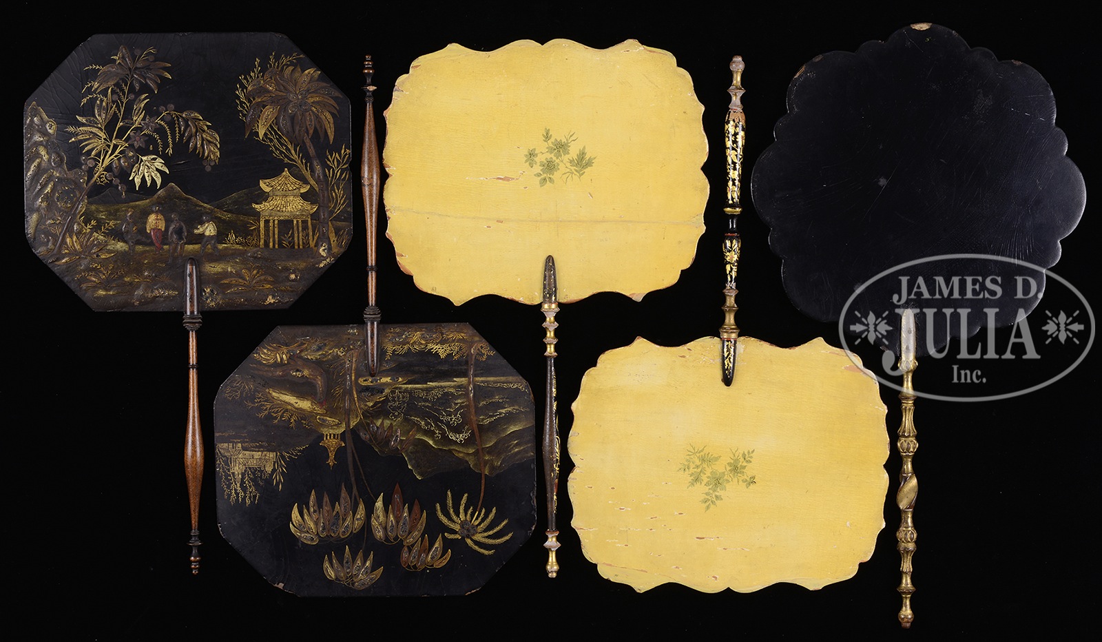 GROUP OF FIVE LACQUER FANS.A group of five fans, mostly of rectangular form with curved edges, lacquer in black or yellow with flowers, scenery, and people motif, handles of various designs. SIZE: Various CONDITION: Age related wear and damage. 9-96267 (250-300) – Lot 2513