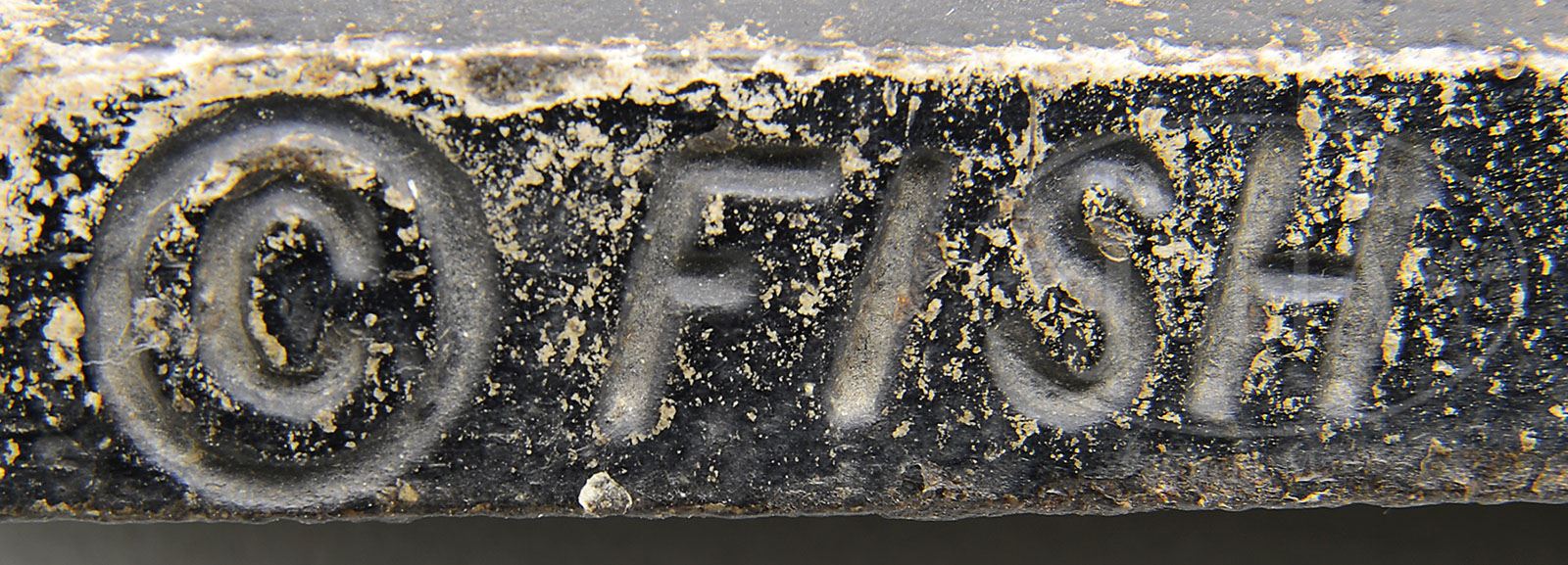 RARE LARGE FOOTMEN DOORSTOP. Circa 1920, Hubley Foundry, Lancaster, Pennsylvania. This fine cast-iron example with good detail designed by Anne Fish and marked on the base with a copyright sign and “Fish”. Additionally marked on back with numeral “248”. Reference: The Doorstop Book, John and Nancy Smith, page 213. SIZE: 12″ h. CONDITION: Very fine overall condition, with original painted surfaces and minor small paint chip losses. 9-91522 (1,500-2,500)