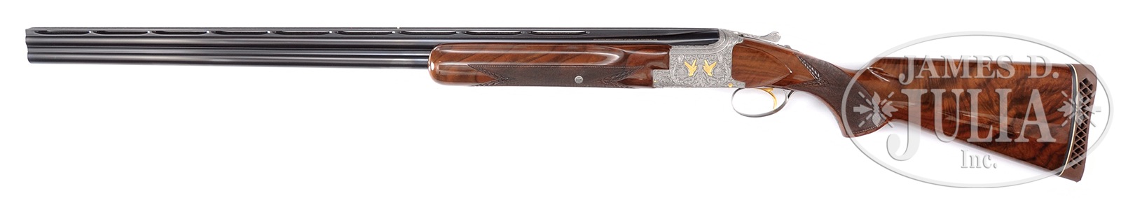 *EXCEPTIONAL BROWNING SUPERPOSED EXHIBITION GRADE GUN RELIEF ENGRAVED BY ANDRE WATRIN AND RELIEF GOLD INLAID BY LOUIS VRANCKEN.SN 1047S2. Cal. 12 ga. 2-3/4″ Chambers. 32″ Bbls are marked for full and full. Bbls have wide “broadway”, ventilated ribs with two “certifiable pre-ban ivory” beads. Gun is gold inlaid with Browning St. Louis and Montreal addresses on left, and with chamber and “MADE IN BELGIUM” on right. Coin finished standard Browning OU action with gold-plated sgl selective trigger, is engraved with full coverage truly exceptional deep relief carving of scrolled acanthus and flowers, as counterpoint to gold inlaid game birds. This exceptional piece of artwork is engraved by renowned Browning engraver Andre Watrin, and these motifs were designed by him. His drawings are illustrated on p. 222 and 223 of THE BROWNING SUPERPOSED by Ned Schwing. Captions under the drawing photos state that Mr. Watrin was “co-chief engraver of the FN facilities, and is considered by many to have outstanding artistic ability.” The designs on this gun are a tribute to Mr. Watrin’s mastery of art history and symmetry, as well as his exceptionally steady hand, and is a truly incredible work of art. Gun portrays gold inlaid pigeons amongst scroll. Gun is signed by “A. Watrin” on rear left side of action, who undoubtedly did the scroll, and by “L. Vrancken” on right who most likely was responsible for the gold inlay. Louis Vrancken’s gold inlaid birds are beyond reproach. Stock is of exceptionally well matched finely flame figured American walnut, and is fitted with Browning open sided white line pad. Checkering has floral carving, with line borders. Beavertail forend matches well. Bore diameter: top -.724, bottom -.724. Bore restrictions: top: .036 (full), bottom: .037 (full). Drop at heel: 1-11/16″, drop at comb: 1-1/4″. Weight: 8 lbs 2 oz. LOP: 14-3/8″. PROVENANCE: The Collection of Robert Burg. Special Note: This item contains or is made of ivory. Do not bid on this lot unless you have read and agreed to our "Ivory Position Statement" and the "Waiver of Legal and Financial Risk to James D. Julia in regards to your Purchase of an Ivory Object." This information is located in the front section of our catalog. CONDITION: Excellent, nearly as new, showing very little evidence of firing since proof, with only the slightest of handling marks on wood and metal. Checkering and carving of gun is somewhat darkened and front bead is missing. Gold of trigger is excellent. Mechanically crisp. An exquisite Browning. 50034-3 IVORY (12,500-17,500) – Lot 2514