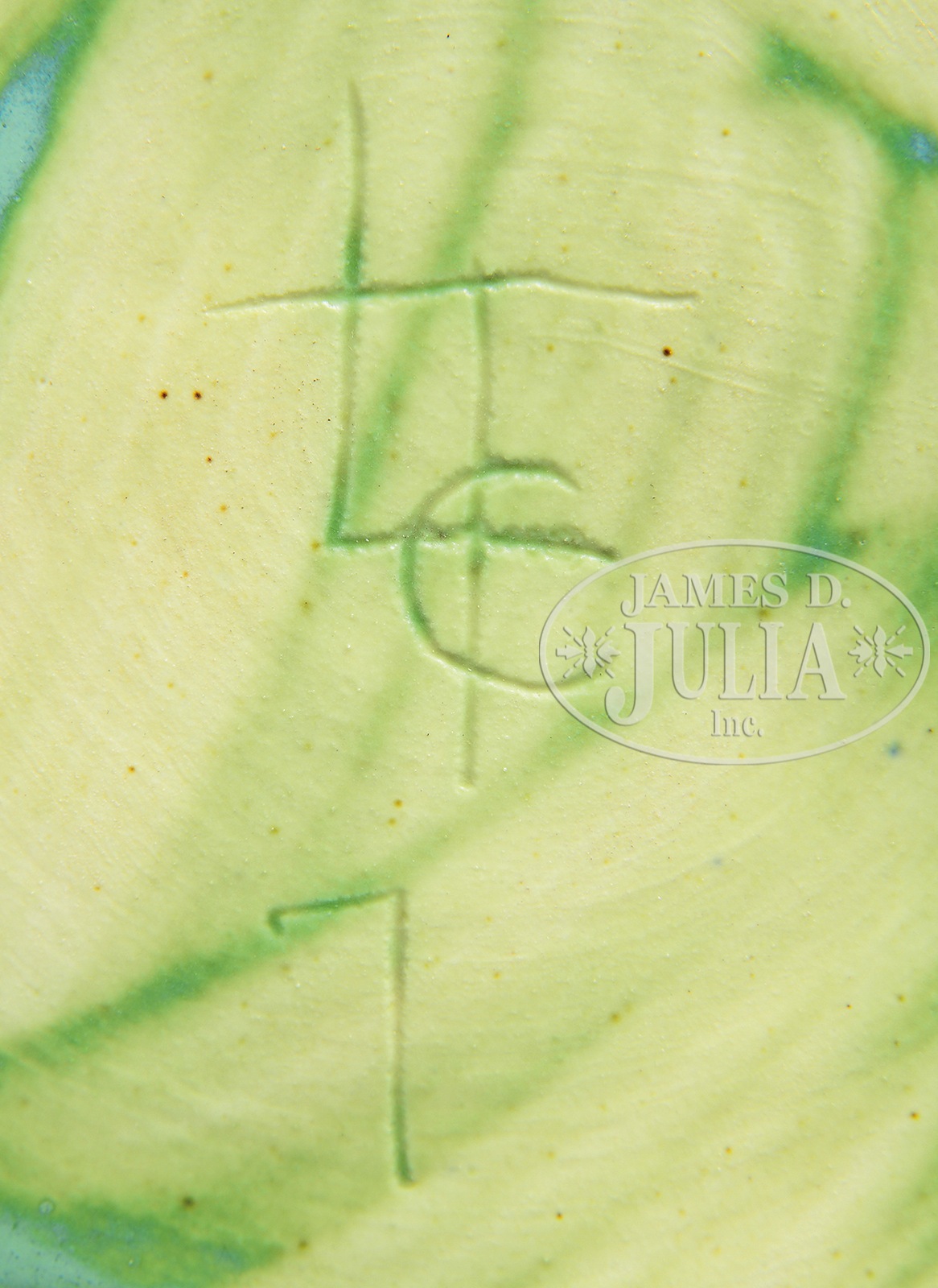 Large Tiffany lamp base has pottery body with mottled green glaze. The base is topped with a bronze dome supporting a simple riser with artichoke ball at the base. The base is finished with a 4 socket cluster. Base is signed on the underside with entwined signature “L.C.T.”. SIZE: 27″ t. CONDITION: Very good to excellent. 5-68872 (5,000-7,000) – Lot 2516