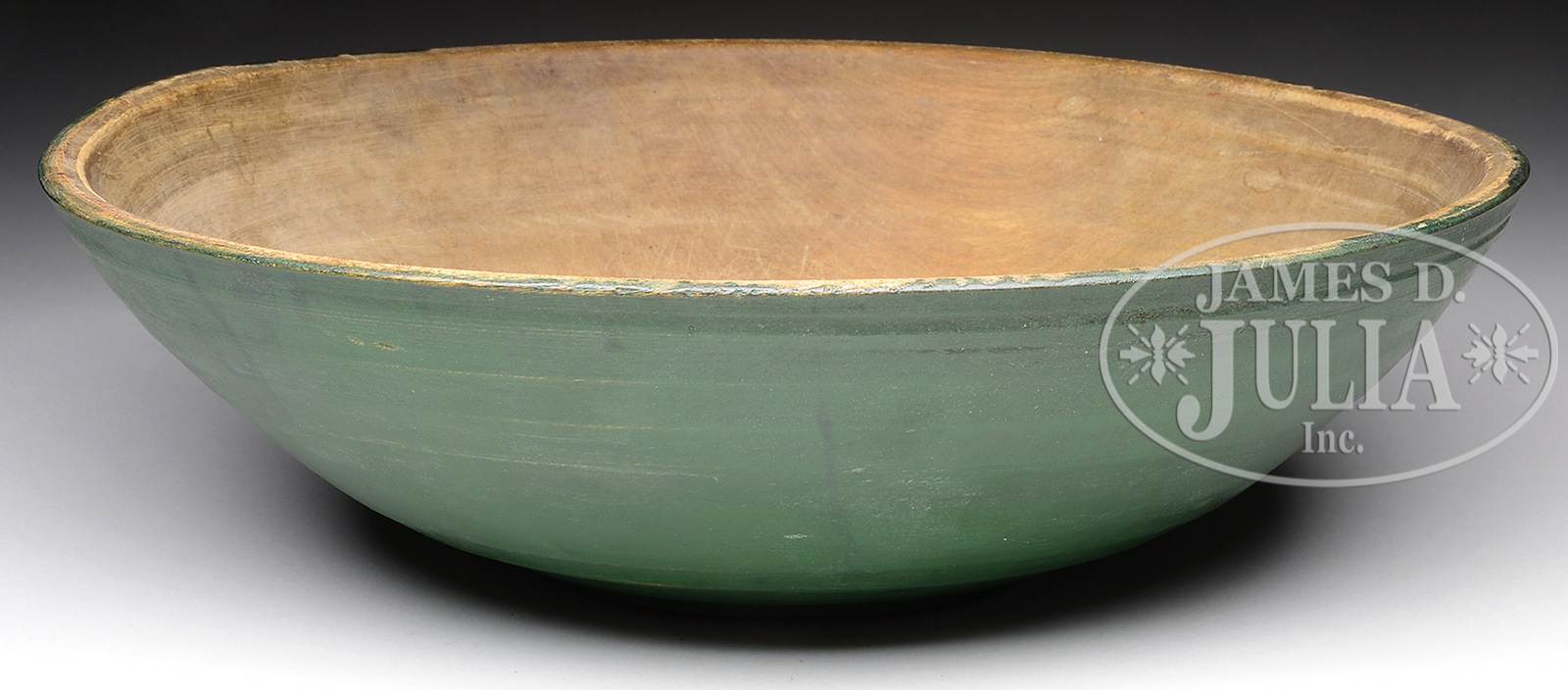 BEEHIVE TURNED MAPLE MIXING BOWL.18th Century New England. The bowl with pronounced turnings, shallow foot and unpainted interior. Original green paint. SIZE: 4″ h x 12″ dia. CONDITION: Excellent original condition. 49140-20 (800-1,400) – Lot 2516