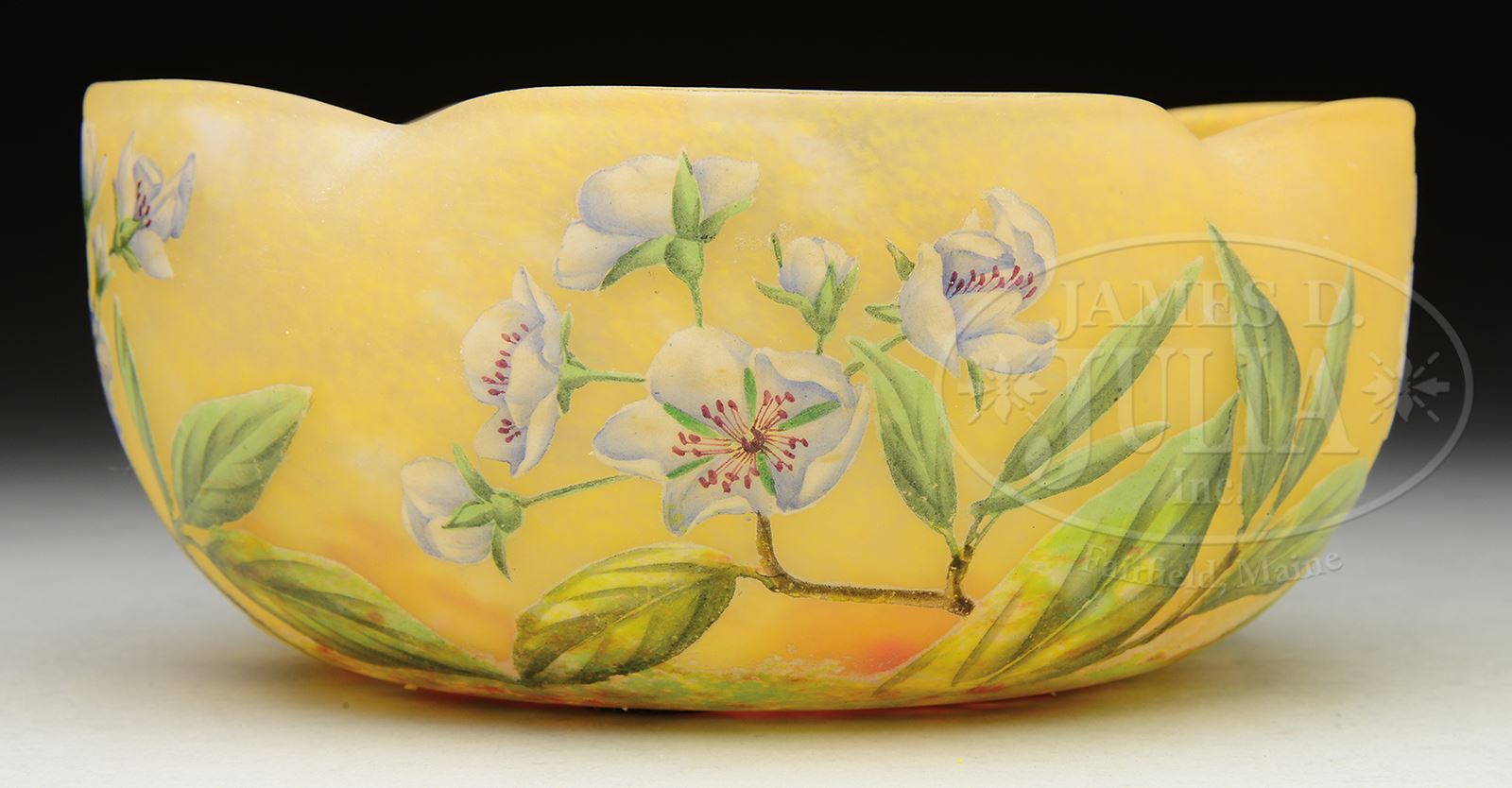 DAUM CAMEO & ENAMELED BOWL.Daum bowl has cameo floral decoration surrounding the side. Cameo leaves and stems are enameled in shades of green and brown and the flowers are enameled in shades of lavender with red stamen, all against a mottled green and red shading to yellow background. Signed on the side in cameo “Daum Nancy” with cross of Lorraine. SIZE: 6″ dia. PROVENANCE: From the Unreserved Collection of Mrs. Jackie & the late Dean Ballard. CONDITION: Very good to excellent. 50421-25 (1,500-2,000) – Lot 2516