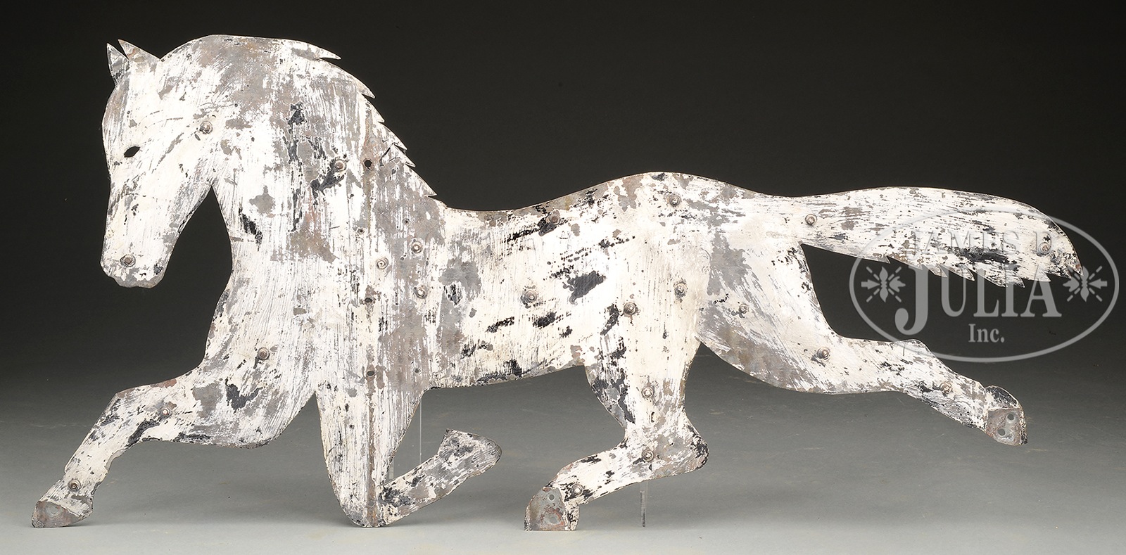 SHEET STEEL RUNNING HORSE FIGURE.1st half 20th century. The cutout having bar supports on reverse. Remnants of white and black paint remain. Appears to be of weathervane form but never having a weathervane mount. May have been mounted atop a sign or fence. SIZE: 48″ l x 24″ h. CONDITION: Some bullet holes, otherwise good. 49922-38 (800-1,200) – Lot 2519